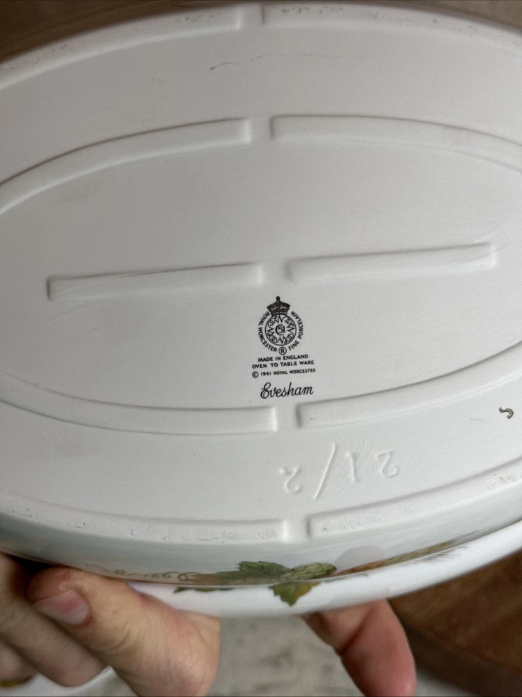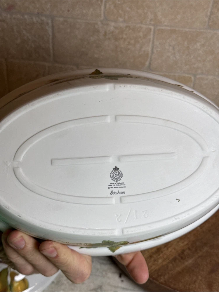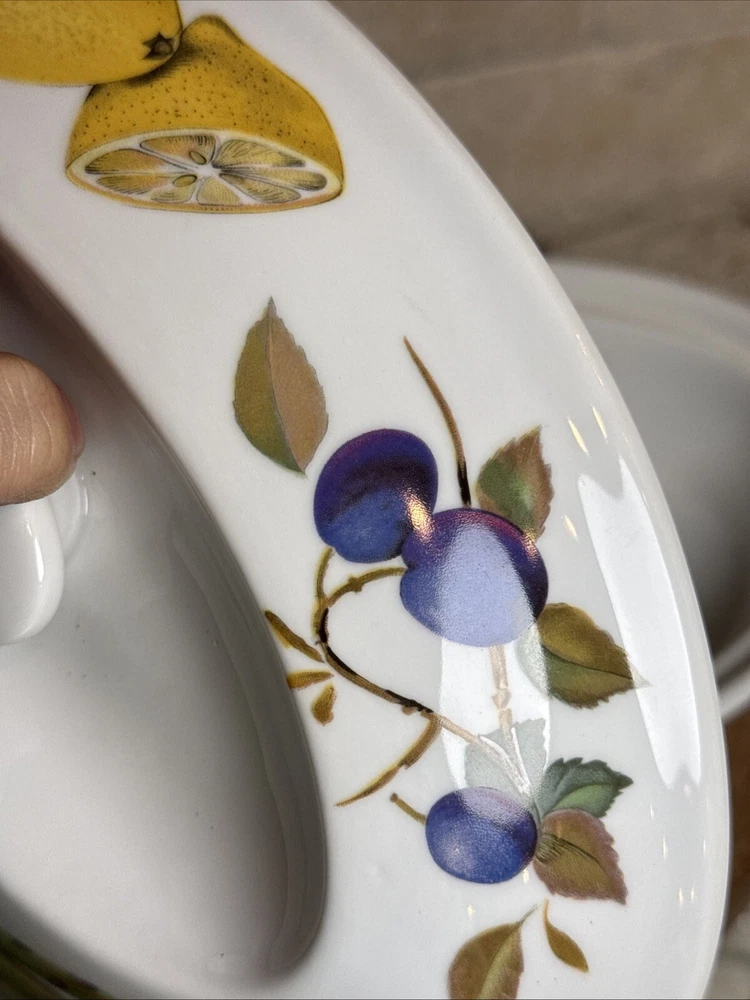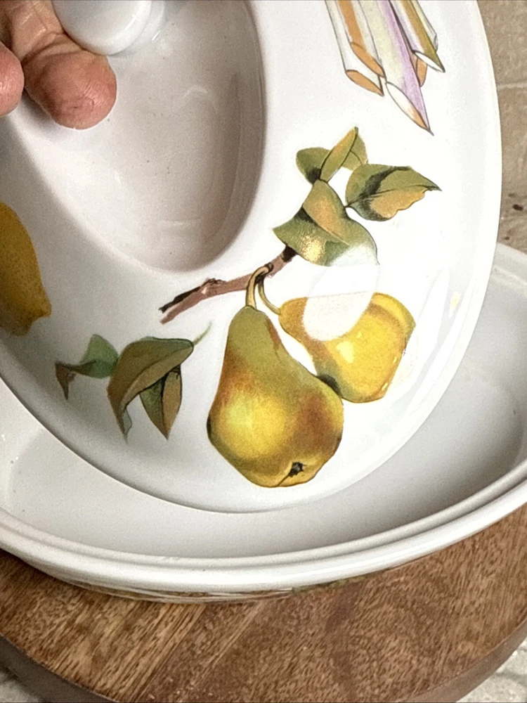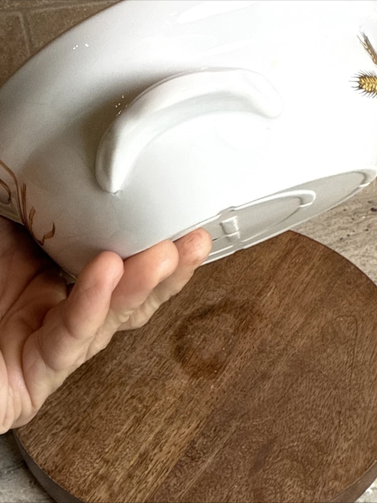 This is a gorgeous covered vegetable dish. There is a little smudging in the foot, that's about it - see photos. The sides of the dish have berries and shocks of wheat. The lid is covered with beautiful renderings of fruit. Bountiful harvest. • Length: 9 3/8 in • Height: 2 1/8 in • Special Characteristics: GLD HDLS • Porcelain • Crafted in England