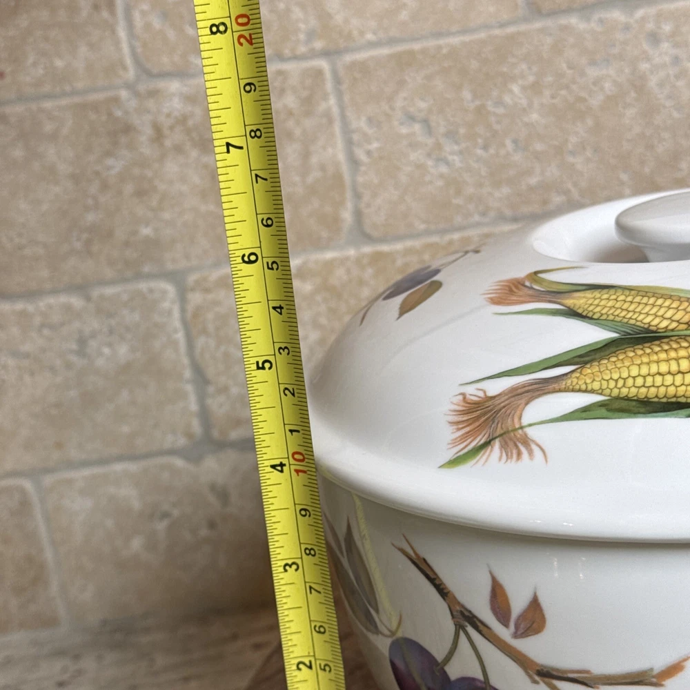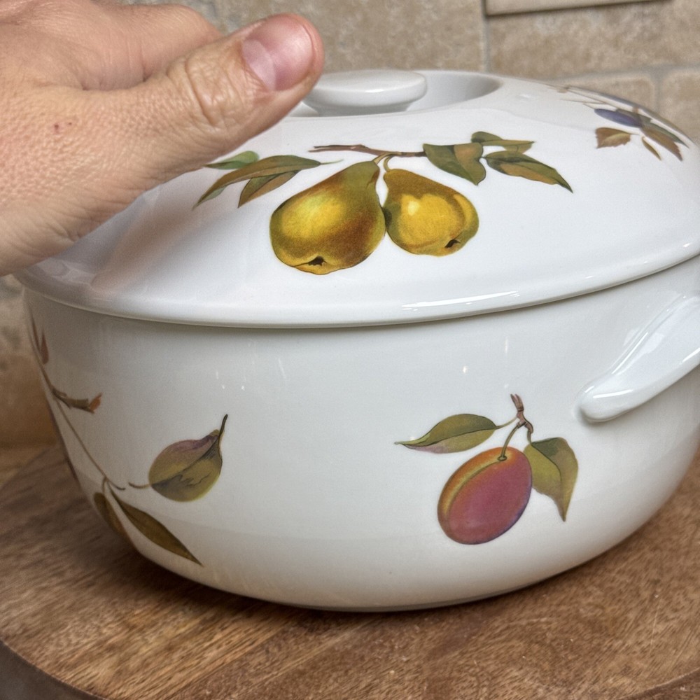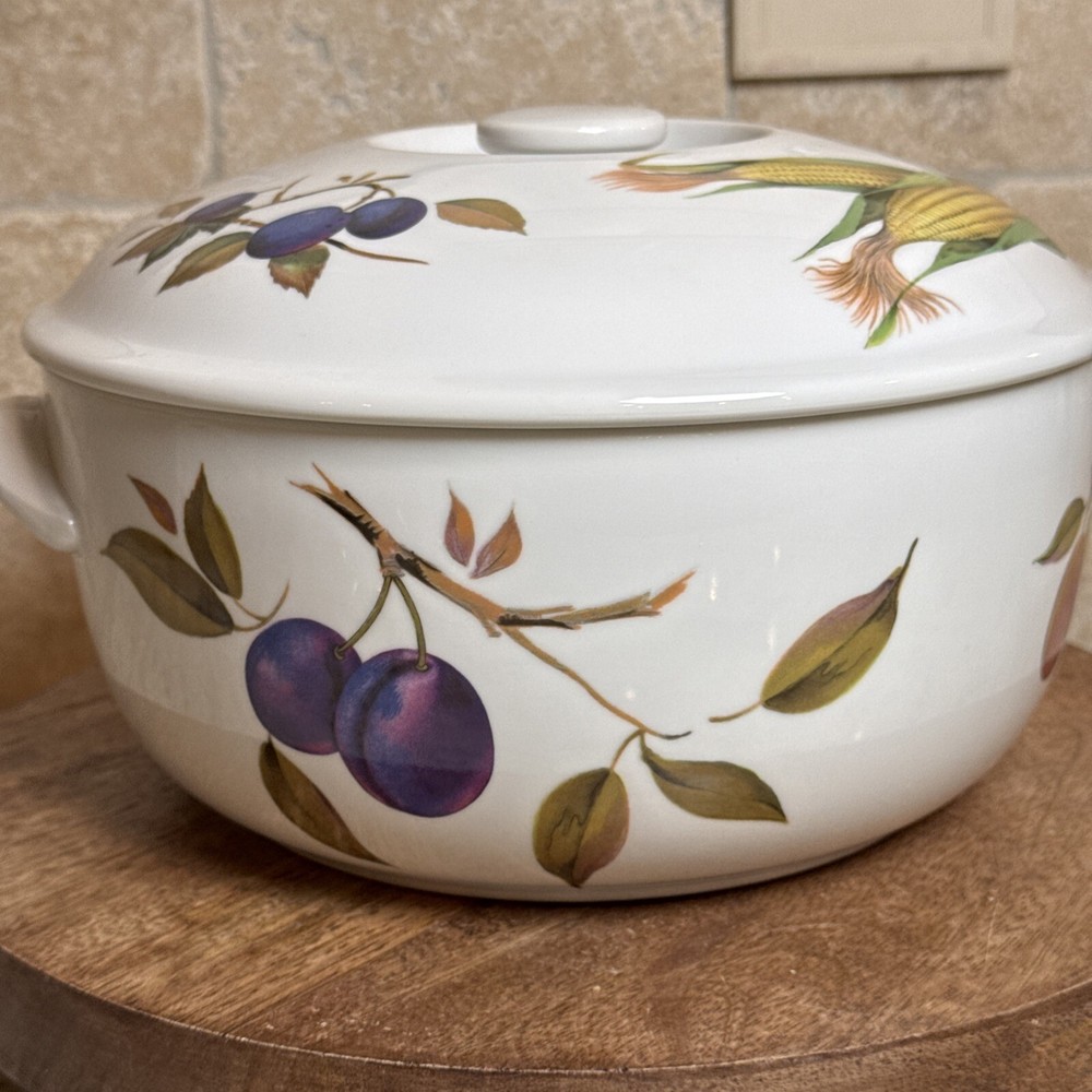 We have 4 total and all are in mint condition! A beautifully colored Royal Worcester Covered Casserole Dish decorated with sprigs of various fruits and ears of corn. The dish features gold colored handles with the lid highlighted in gold trim around the edge circumference and a gold knob. It is Made in England and hallmarked on the bottom. The Evesham pattern was first introduced in 1961 and is no longer being made. Capacity 2 1/2 Qt. to top. It measures approx. 10" Handle to Handle x 8 1/4" Diameter x 4" H. Overall height with the lid measures approx. 6"