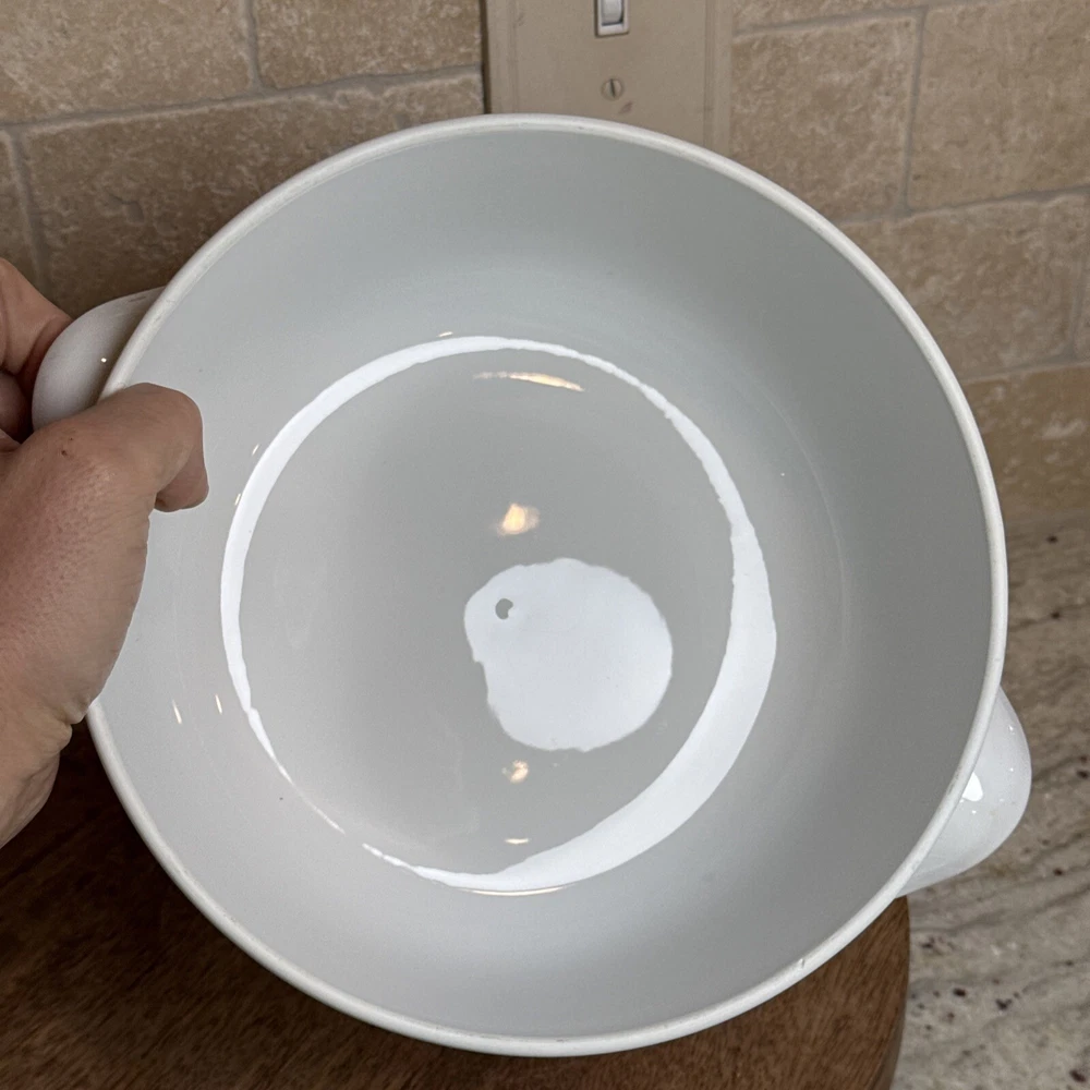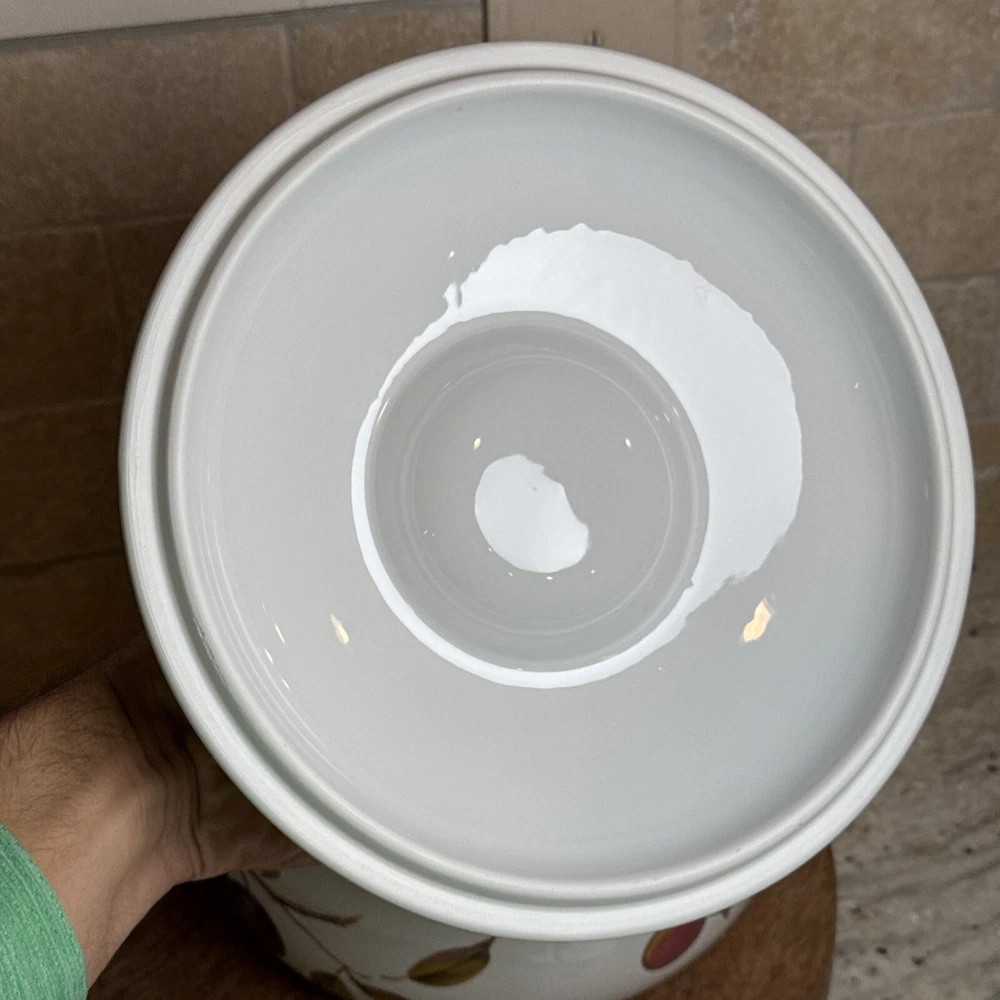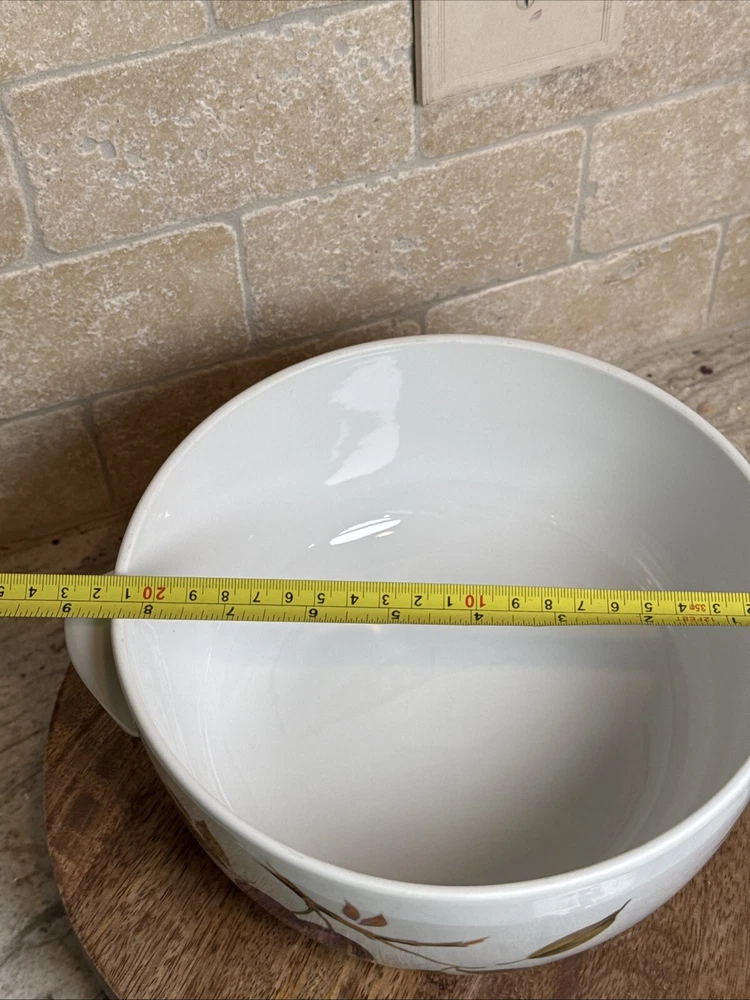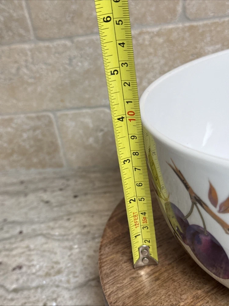 We have 4 total and all are in mint condition! A beautifully colored Royal Worcester Covered Casserole Dish decorated with sprigs of various fruits and ears of corn. The dish features gold colored handles with the lid highlighted in gold trim around the edge circumference and a gold knob. It is Made in England and hallmarked on the bottom. The Evesham pattern was first introduced in 1961 and is no longer being made. Capacity 2 1/2 Qt. to top. It measures approx. 10" Handle to Handle x 8 1/4" Diameter x 4" H. Overall height with the lid measures approx. 6"