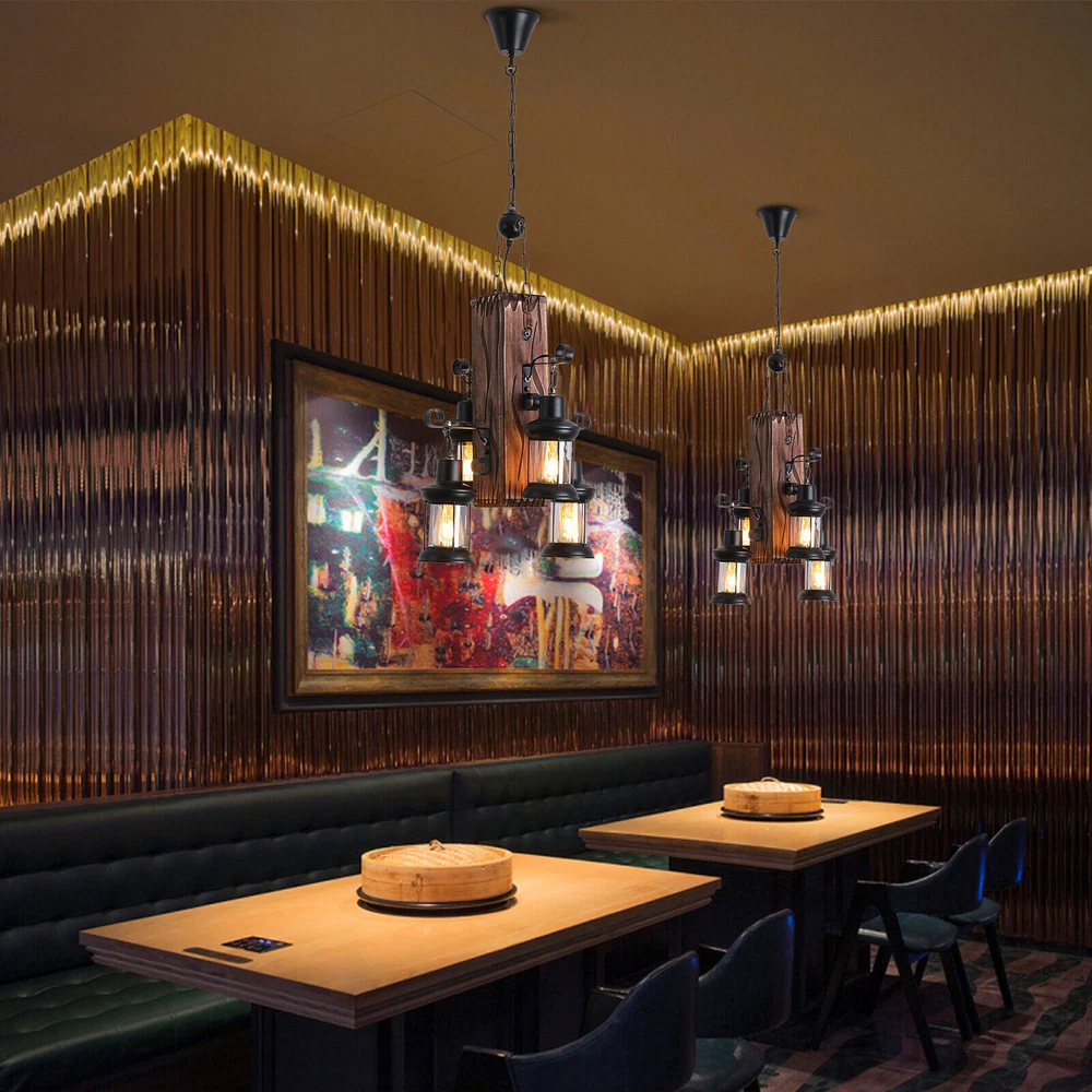 Rustic Country Industrial wooden Hanging Ceiling Lamp Pendant Light Fixture US 【Bulb Base for 4 Lights :】E26. Note: Bulb Not Included. 【Product Size:】 Fixture Width is about 17.7’(45 cm), Fixture Height is about 20’(50cm). Easy Installation. 【Glass Lantern Design :】 Perfectly Fit Various Decoration Styles : Industrial Style, Loft Style, Vintage style and also Contemporary style. 【Suitable for Any Room】Fit for Living Room, Dining Room, Kitchen, Bar, Restaurant, Hotel, Barn ,Farmhouse etc Industrial Vintage Decoration. The lamp works fine when used with incandescent or LED bulbs with standardE26/E27. bases.Please note: incandescent bulbs are not included Product description Light Information Category:Chandeliers Usage:Indoor Lighting,Outdoor Lighting,Hallway Shade Shape:Cylinder Dimensions Size:Full Sized (13-30 in.wide) Fixture Width:17.7" (45 cm) Bulb Information Bulb Type:LED/Incandescent/Flourescent Bulb Base:E26 Bulb Included Or Not:Bulb Not Included Number Of Lights:4 Lights Wattage Per Bulb:31-40W Material Shade Material:Glass Color Finish:Blacks Others Shade Color:Clear Glass Treatment:Clear Number Of Bulbs:4 Fixture Height(including Chain):20" (50 cm) Payment Delivery details Terms of sales About us Contact us Payment We accept ebay payment 。 Fees such as import duties, taxes are not included in the item price or shipping costs. These charges are the buyer's responsibility. Delivery details Shipping: 2-9 working days to: USA Terms of sales We maintain high standards of excellence and strive for hundred percent customer satisfaction. Feedback is very important to us. We hope that you contact us immediately before you give neutral or negative feedback, so that we can address your concerns. It is impossible to address issues if we do not know about them! About us Your satis faction is our ultimate goal. We work hard to earn your trust and future business. Our certified technicians have tested each item before shipping. The unit comes with 1 year limited warranty on all manufacturing defects. a) If you receive a defective item, you may return it or ask for a discount. Please contact us within 14 days after you receive the package. b) What you returned must be intact and in its original packaging as re? u. Customer is responsible for shipping costs of the returned item. c) We will cover the cost of shipping back t with the shipping rate indicated in the registration page. We will send you a new unit or refund the full payment you paid. Thank you. Contact us Business Hour Business Hour: Monday To Friday: 8:30 AM to 5:00 PM (Beijing China time) Due to time zones, our reply to your questions may not be immediately. But within above working time, we will reply your email within 24 hours. If it's non-workdays, please kindly be patient and wait till Monday. Please contact us with ebay message. Please feel free to contact us if you have any questions. Monday To Friday: 8:30 AM to 5:00 PM (Beijing China time) Due to time zones, our reply to your questions may not be immediately. But within above working time, we will reply your email within 24 hours. If it's non-workdays, please kindly be patient and wait till Monday. Please contact us with ebay message. Please feel free to contact us if you have any questions. Highlights Compact Design,Unique Appearance,high reliability * Feature * Creative Design,Durable Material,Beautiful Appearance Sensor Type Light Installation Area Indoor Power Source Hardwired Type Chandelier Color Brown MPN Does not apply Brand Unbranded Voltage 120V Style Vintage/Retro Usage Indoor Lighting,Outdoor Lighting,Hallway Shade Shape Cylinder Size Full Sized (13-30 in.wide) Fixture Width 17.7" (45 cm) Bulb Type LED/Incandescent/Flourescent Bulb Base E26 Bulb Included Or Not Bulb Not Included Number of Lights 4 Lights Wattage Per Bulb 31-40W Shade Material Glass Finish Blacks Shade Color Clear Glass Treatment Clear Fixture Height(including Chain) 20" (50 cm) Room Bar, Bedroom, Dining Room, Living Room Surface Finish 1 Made of high quality material Country/Region of Manufacture China Transportation does not include canarias *Feature* Creative Design, Durable Material, Beautiful Appearance