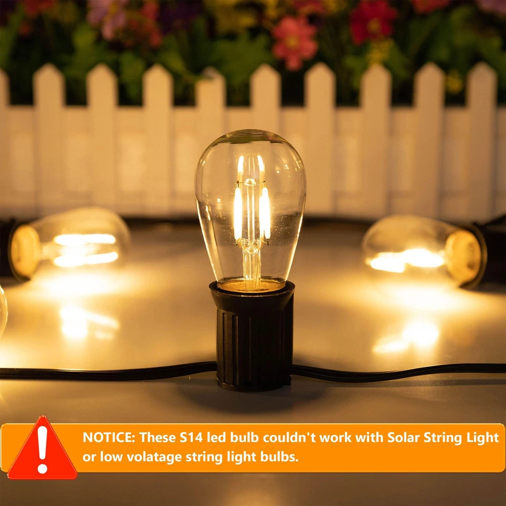 Product Specification: Watts:1.5W (Replace 15W Incandescent Lamp) Dimmable: No-Dimmable Lumen:150lm Color:2700K (Soft White) Beam Angle:360 Degree CRI:80+Ra Voltage:AC 110V-130V Base Type: E26 Medium Screw Base Package: 15 Packs of S14 LED Bulbs Application Commercial Use: Hotel, cafe, commercial buildings supermacket theaters shop-window and artwork lighting. Home Use: Bathroom, bedroom, Kitchen, living room, dining room and dressing room lighing, wall lamps, table lamps and vanity lighting. Outdoor Lighting: The globe replacement light bulb is ideal for outdoor string light. It is perfect for your garden, patio, deck, pergola and outdoor space. Warm tips--These S14 1.5 watt led bulb couldn't work with Solar String Light and other low volatage string light bulbs. 【Energy Efficient & Money Saving】Equipped with energy-efficient LED Filament, these S14 LED Bulbs will reduce heat output and save over 90% on the electricity bill of lighting, which makes it an economical alternative to 10W-15W incandescent or halogen string light bulbs. 【High CRI 80+ & Stable Output】Features high CRI 80+, bring out a vivid and natural color, providing you with a better visual enjoyment. And the high quality of light output will also remain stable throughout the lifetime. It means that the soft warm light bulb will create welcoming and comfortable light for your home. 【Super warm & No Delay】Designed with the latest LED source technology, this outdoor LED light bulb has a output of up to 100 lumens. It will emit full brightness at soft white 2700k with 360-degree light. No delay and no dark space, widely used for such as string lights in backyard, patios, outdoor, indoors bars,garden or other decoration light fixtures. 【Easy To Install & Wide Application】15 Pack LED String Light Bulbs Replacements with E26 screw bases can be easily screwed into the light fixtures directly, optimal choice for outdoor decoration like patio, porch,garden,festoon,camp,party and etc.