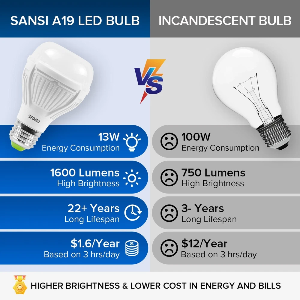 Scientific Design - providing a healthier, safer and more reliable light source! More Excellent Features High Light Efficiency How to Determine How Many Lumens You’ll Need to Properly Light Your Space? Product Details BRIGHT & EFFICIENT Compared with other LED bulbs, SANSI's highly efficient light bulbs can provide 1600 lumens using only 13 watts of power, equivalent to 100W incandescent bulbs. Based on 3 hours per day usage, save up to 87% electricity, annual estimated cost 1.6. FLICKER-FREE Adopting high light transmission optical lenses, up to 18 LED chips can not only provide you and your family with the light source they need daily but also provide a healthy living or work environment. No flickering, no noise. PATENTED CERAMIC TECHNOLOGY SANSI's patented technology replaces the traditional Mcpcb aluminum substrate with a non-conductive ceramic heat sink, directly soldering the LED chip on the ceramic heat sink, effectively reducing the systematic thermal resistance between the LED PN junction and the surface of the heat sink, resulting in faster heat conduction and higher product reliability, making SANSI's bulbs perform with higher light efficiency. SAFE AND RELIABLE he lamp body is made of special ceramic material, and the flame retardant grade reaches grade V0; the reinforced insulation structure means no risk of electric shock, its safer; the whole shell material reaches the WF2 anti-corrosion grade, which is more reliable and durable; The hollow design is good for heat dissipation. SATISFACTION GUARANTEES ETL listed, quality and safety verified, 22.5 years LED bulb lifespan, 5 years warranty. Satisfaction Guaranteed or Your Money Back! We are a professional manufacturer and seller of SANSI products. Covered for 5 Years. Buy with confidence, if you encounter any problems before or during use, or if you have any suggestions, please feel free to contact us!We will reply within 24 hours.