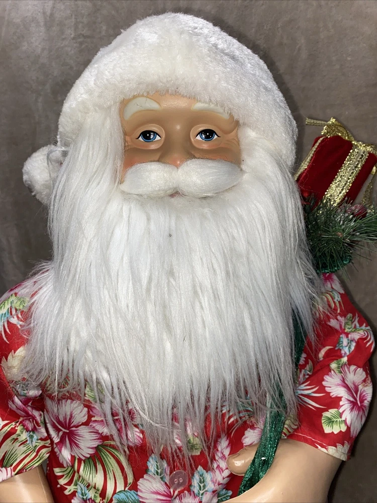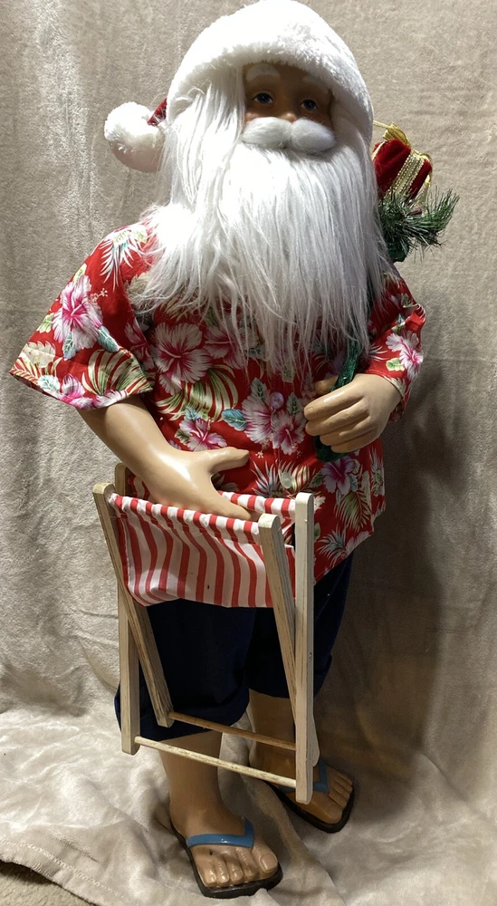 Beach Santa Claus 36” store display / greeter. He’s adorable and very well made. Wearing a Hawaiian shirt and carrying his sack of presents and his beach chair. Wearing his Santa hat and sunglasses can easily be added. Note the small spot on one of his feet. Other than that, no imperfections I see. Store Display Light weight not heavy Chair movable folds out Super cool display for office business Home school Great Christmas present Birthday gift Surf shop Surfer Beach home Resort Tropica Red and white striped Beach chair