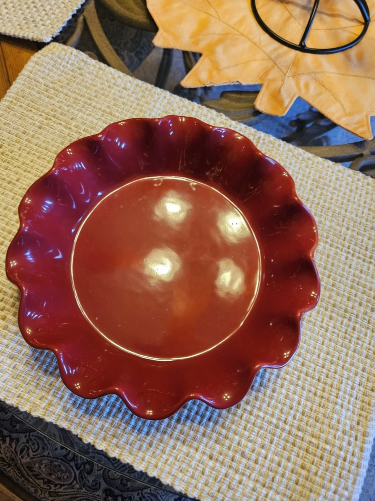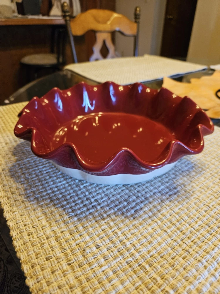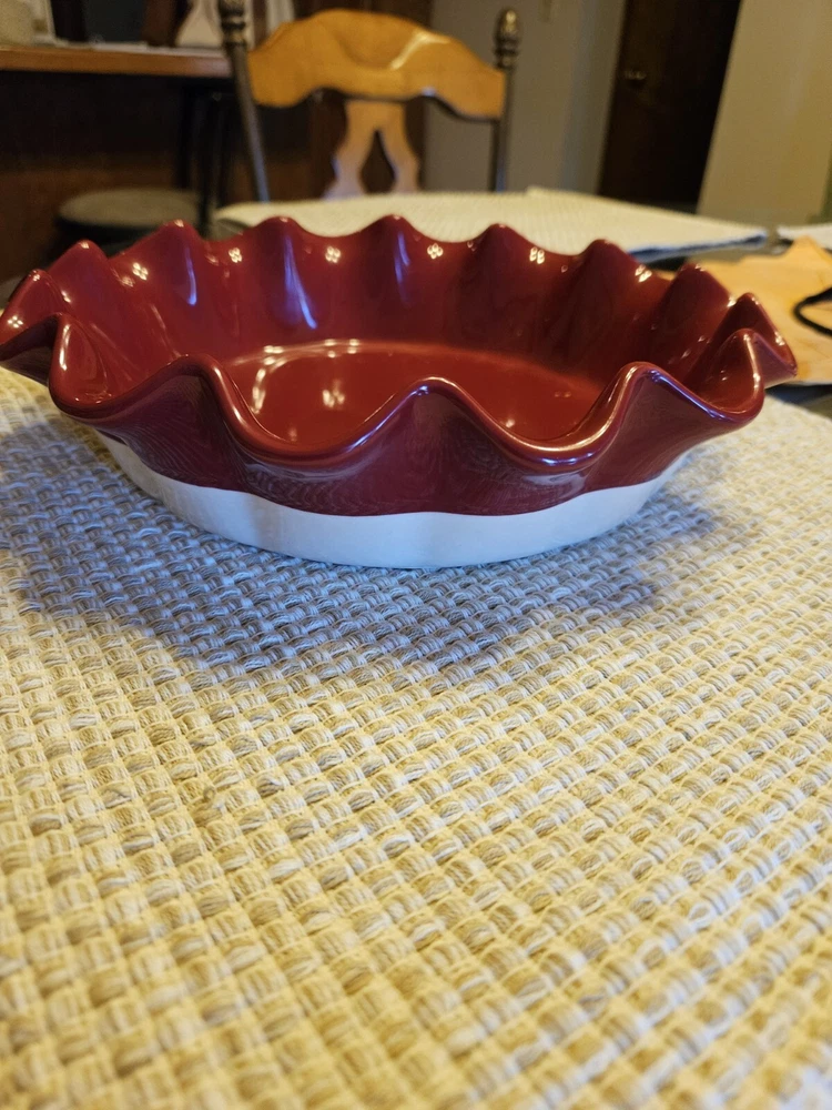 This charming round pie dish from SCM is perfect for serving your favorite homemade pies or quiches. The bright red color and ruffle edge design add a touch of fun and sophistication to any dessert table. Made from high-quality ceramic, this dish is both durable and stylish. The set includes one pie dish, ideal for baking and serving your delicious treats. Whether you're a professional baker or just love to cook and entertain, this SCM pie dish is a must-have addition to your kitchen. With its unique design and quality construction, it's sure to impress your guests and become a cherished part of your collection. Measures approximately 10" in diameter. No cracks or chips. Follow me for more items for sale.