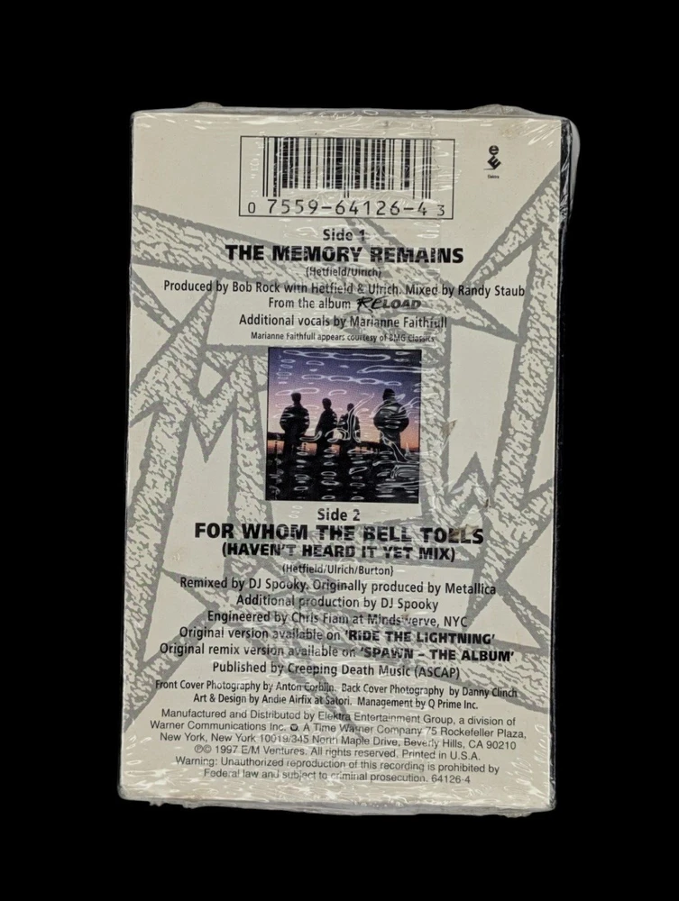 Format: Cassette Genre: Rock Release Title: The Memory Remains Record Label: Elektra Records Artist: Metallica Release Year: 1997 Country/Region of Manufacture: United States gtin13: 0 36000 29145 2 Catalog Number: 64126-4 Edition: First Edition UPC: 0 36000 29145 2 Type: Single Features: Sealed