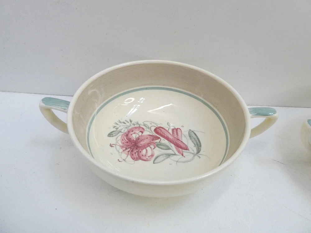 SET4 SUSIE COOPER FLORAL 2 HANDLE SOUP BOWLS RAMMEKINS CROWN WORKS BURSLEM IN GOOD CONDITION - STAMPED TO BASE 11.5 CM DIAMETER 16.5 CM ACROSS HANDLES 4.5 CM HIGH SEE PHOTOS FOR GUIDE TO SIZE AND CONDITION