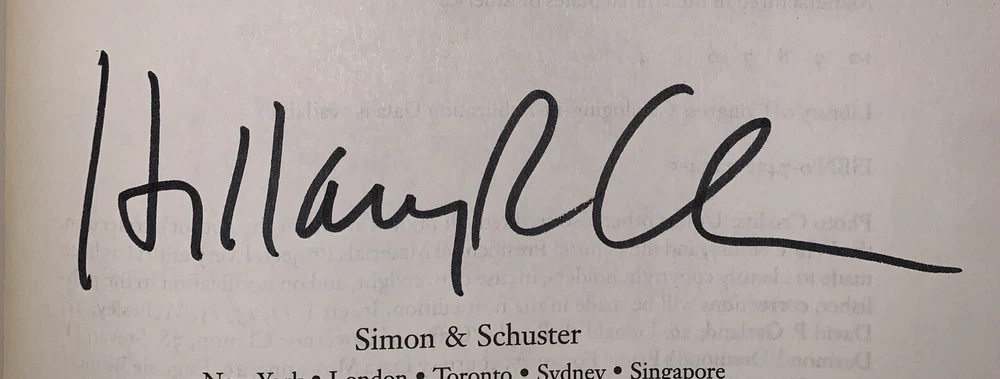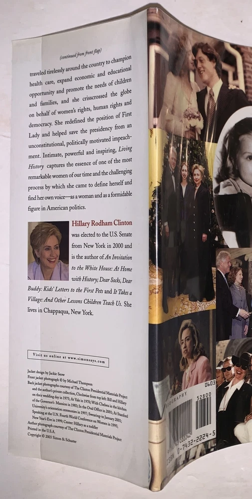 Living History by Hillary Rodham Clinton New York: Simon & Schuster 2003 First Trade Edition, First Printing Signed by Hillary Clinton on the title page. Octavo, xi, 562 pages, publisher's original pictorial dust jacket. Publisher's original gilt lettered, blind stamped black cloth over black boards. Illustrated with sections of black and white photographs. Dust jacket now in protective mylar sleeve. Laid in, is a catalogue description from a prior dealer [Bauman Rare Books]. In fine condition. If you have any questions, feel free to ask, and don't forget to check out my other listings.