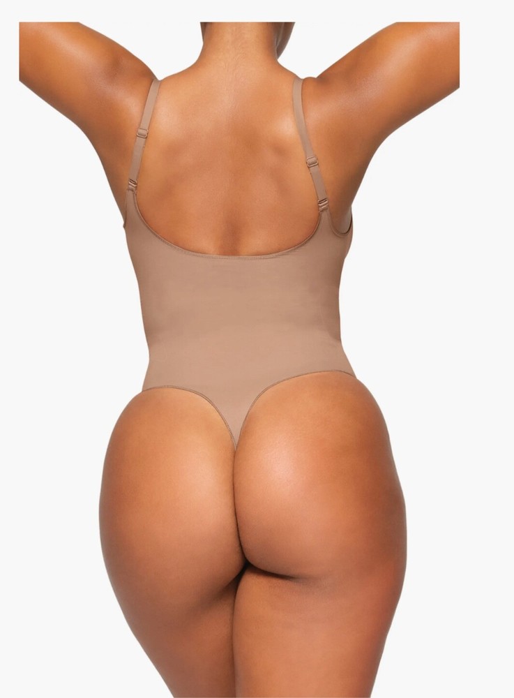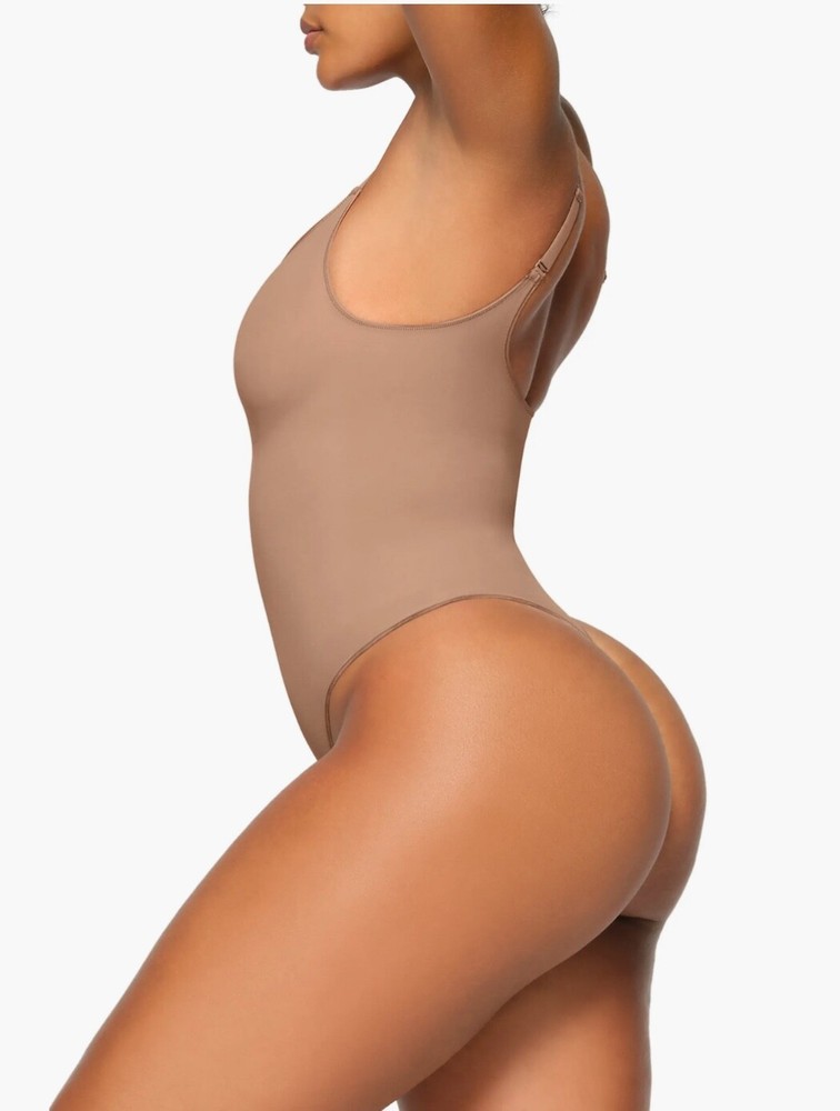 SKIMS Everyday Sculpt Bodysuit Thong in Sienna color, size XS. This one-piece shapewear has a solid pattern, wireless underwire, and is made of Nylon and ELASTANE blend fabric. The bodysuit provides compression in the back and abdomen areas. It is designed for women and features a thong style with a tank top. The brand is SKIMS, and the garment care instructions recommend hand wash only.