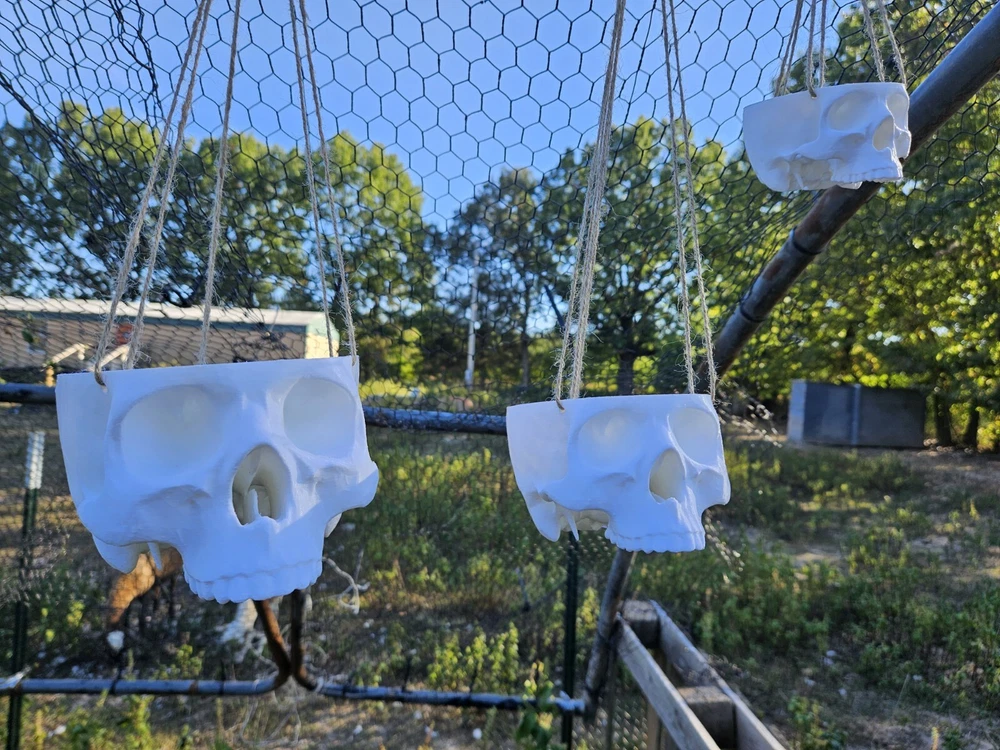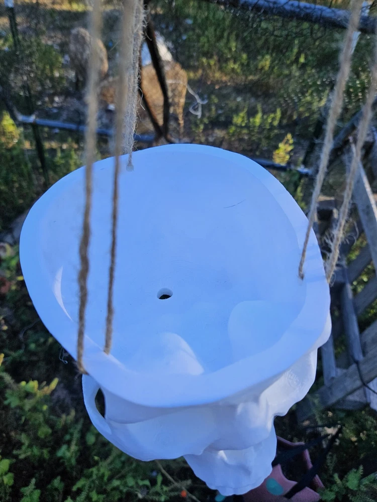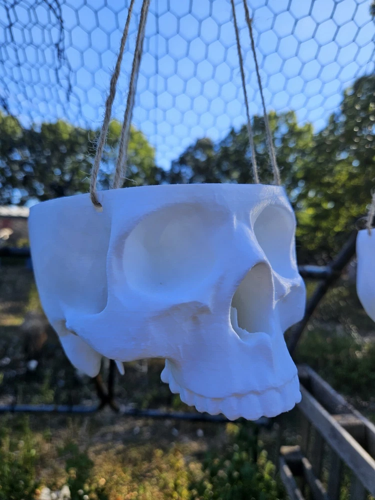 “There is no exquisite beauty… without some strangeness in the proportion” These are hanging skull planters. These work well for vining plants and have a drainage hole in the bottom. They are 3d printed with twine to hang it with. We have these in 3 sizes. Small-1 1/2in deep x 3 1/2in wide Medium-2 1/2in deep x 5in wide Large-3 1/2in deep x 7in wide This listing is for the small size.