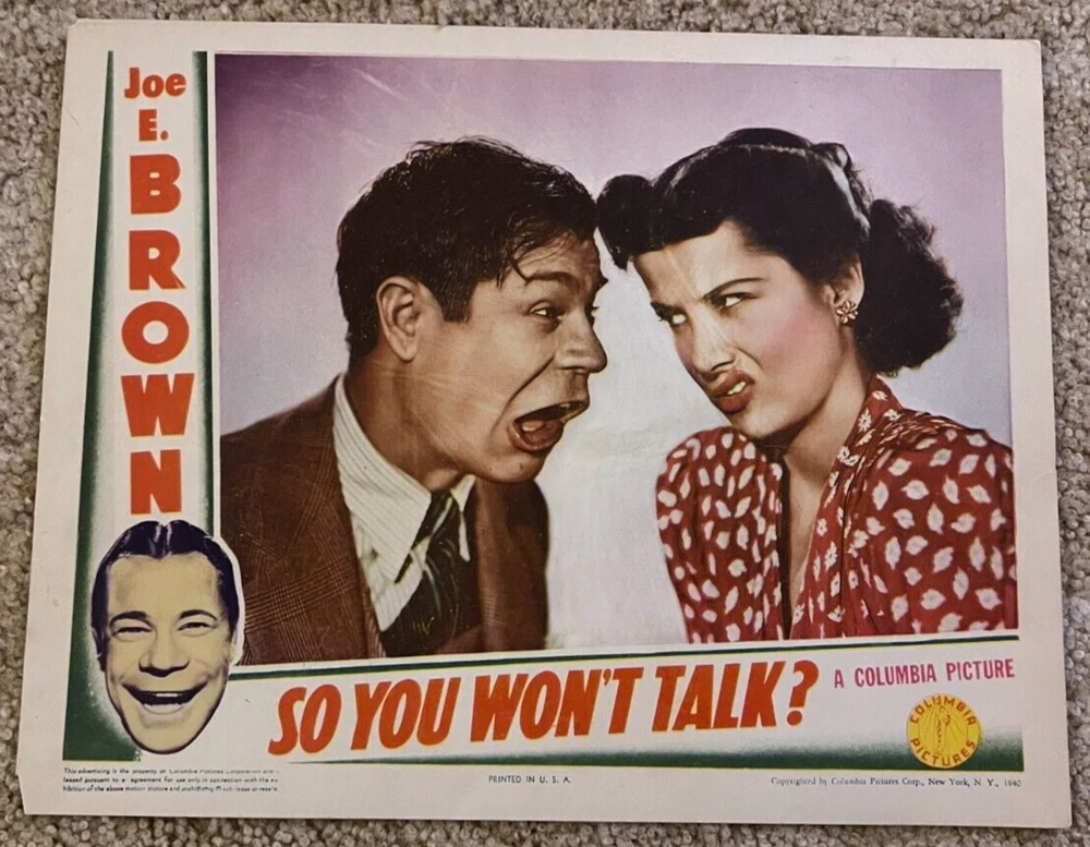 SO YOU WON'T TALK? 1940 MOVIE LOBBY CARD JOE E. BROWN FRANCES ROBINSON Listing for a SO YOU WON'T TALK? 1940 MOVIE LOBBY CARD. Includes one lobby card in overall good condition. There is some general handling wear on the edges and corners. There is a small amount of faded writing on the back . Please view all photos as this is exactly what you will receive. The objects you see in the corners are magnets, not thumb tacks. Please view all photos, as this is exactly what you will receive. This item is a must have addition to any collection. We have more items up on eBay this week! We also have many more items in our eBay store. Use our eBay Store search function. Combine wins to save on postage, we also ship internationally! U.S. Bidders to pay $ 6.00 shipping. International bidders - email me before you bid for a shipping quote. Combine like orders and save on shipping. Customer service is our number one priority, contact us for any problems with combined shipping or other questions. Please check out our other auctions for more hard to find items, Comics, Graphic Novels, TPB's, Records, Games, Movies, Action figures, Toys, Non-Sports/Sports Cards, and Vintage Magazines. INTERNATIONAL BIDDERS - EMAIL US BEFORE BIDDING TO GET A SHIPPING QUOTE. Import duties, taxes, and charges are NOT INCLUDED in the item price or shipping charges. These charges are the buyer's responsibility. Please check with your country's customs office to determine what these additional costs will be prior to bidding / buying. These charges are normally collected by the delivering freight (shipping) company or when you pick the item up. Do not confuse them for additional shipping charges. We do not mark merchandise values below value or mark items as "gifts". US and International government regulations prohibit such behavior. RI Residents please add 7% for sales tax. You can pay us with ALL major credit cards or with PayPal. Pay me securely with any major credit card through PayPal! Please check out the other auctions we currently have running on eBay. ALL EBAY WINS CAN BE PICKED UP IN PERSON TO SAVE ON SHIPPING. E- MAIL US 24 HOURS IN ADVANCE OF PICK-UP PLEASE!