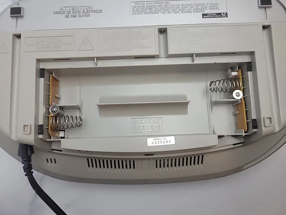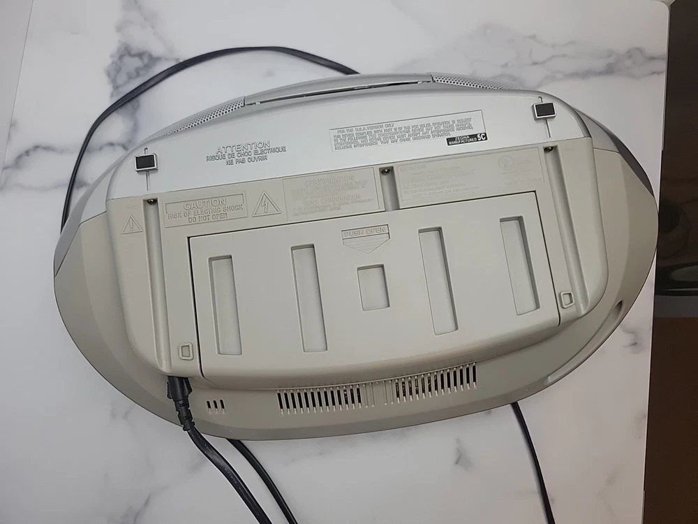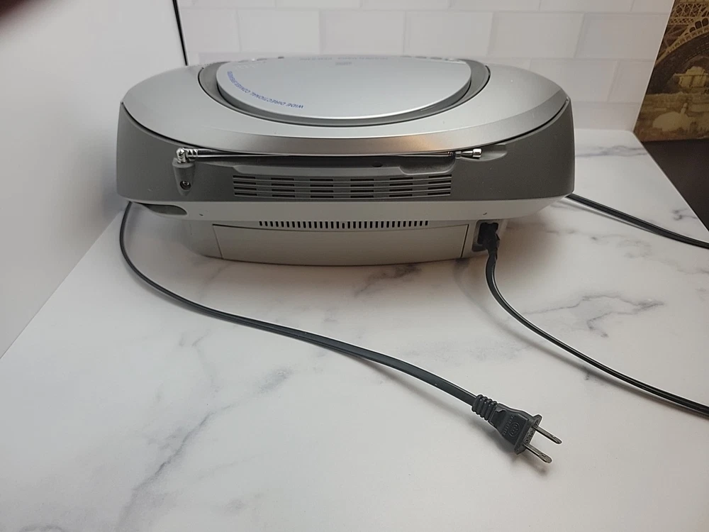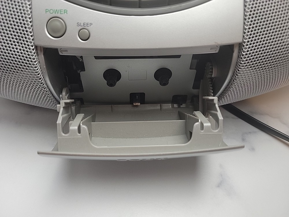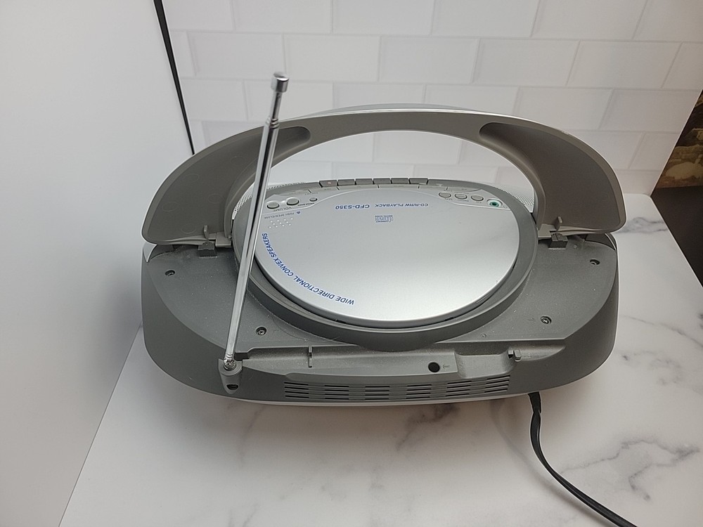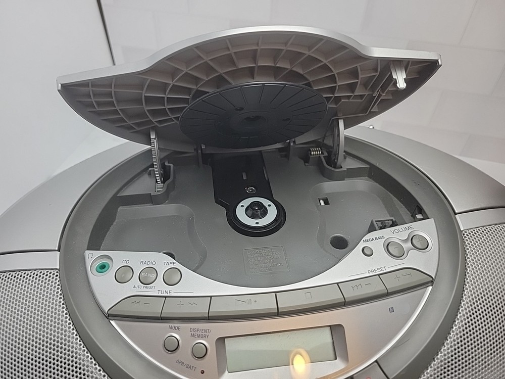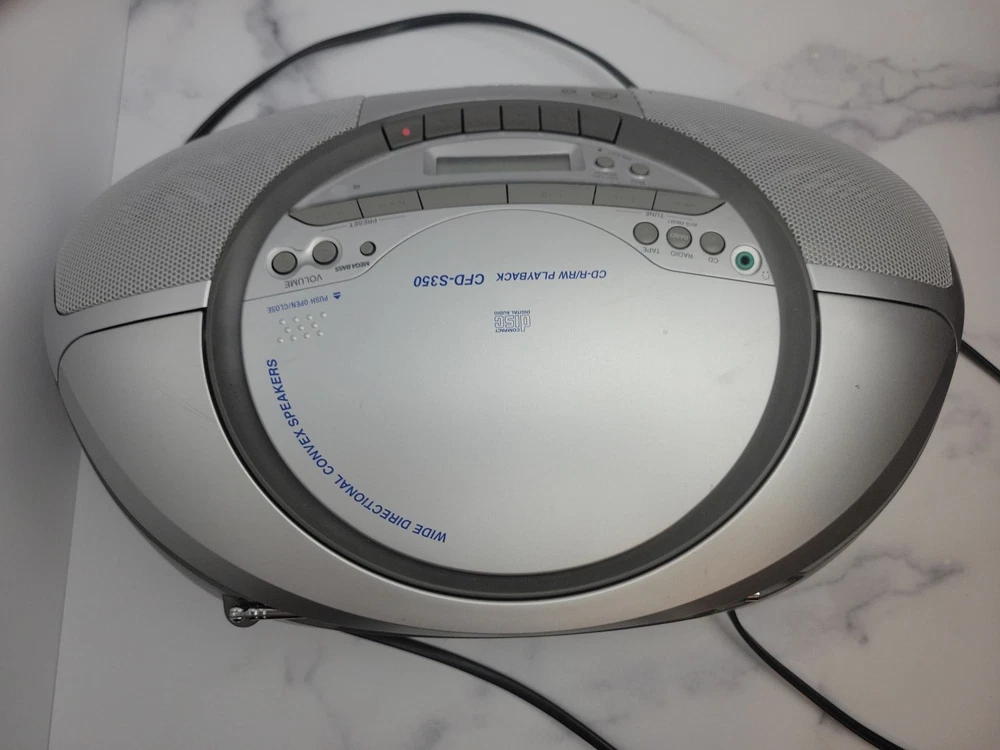 The Sony CFD-S350 is a 1st generation silver boombox from 2000. It features AM/FM radio, a CD player/recorder, cassette tape deck, headphone jack, and LCD screen. With a CD changer capacity of 1, it offers 12 hours of battery life. This portable boombox has surround sound capabilities and is fully tested for functionality.