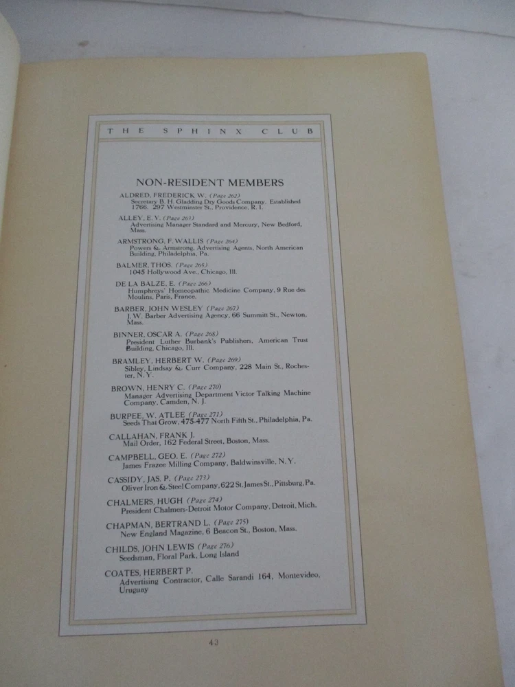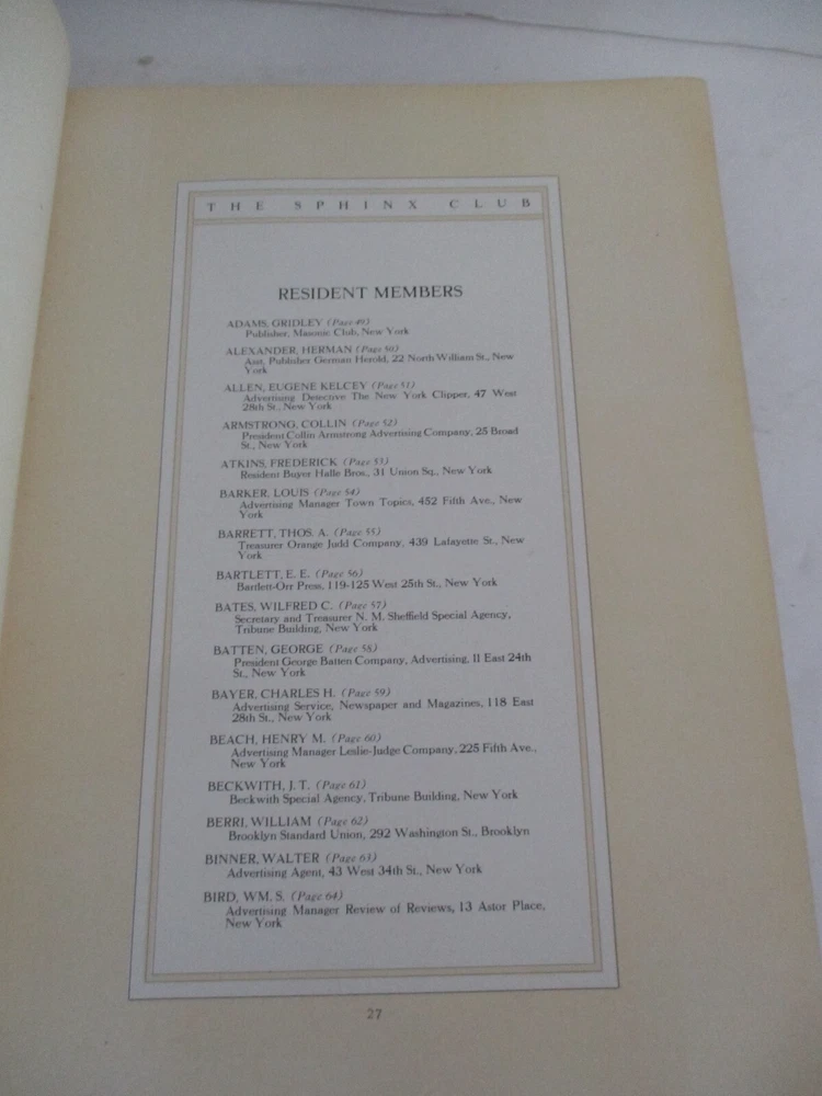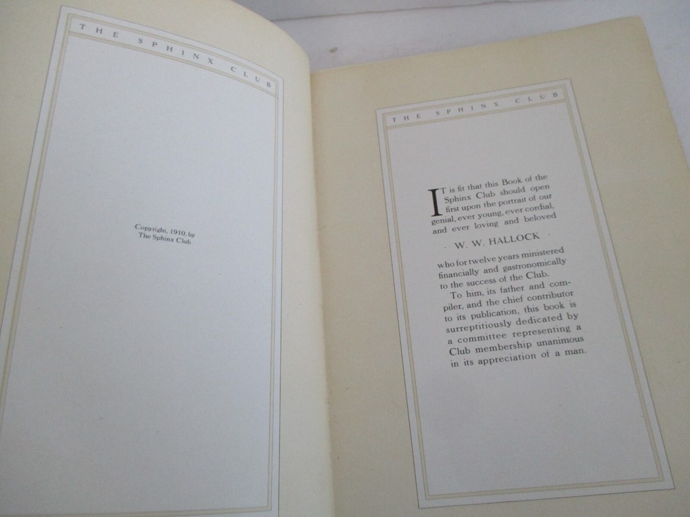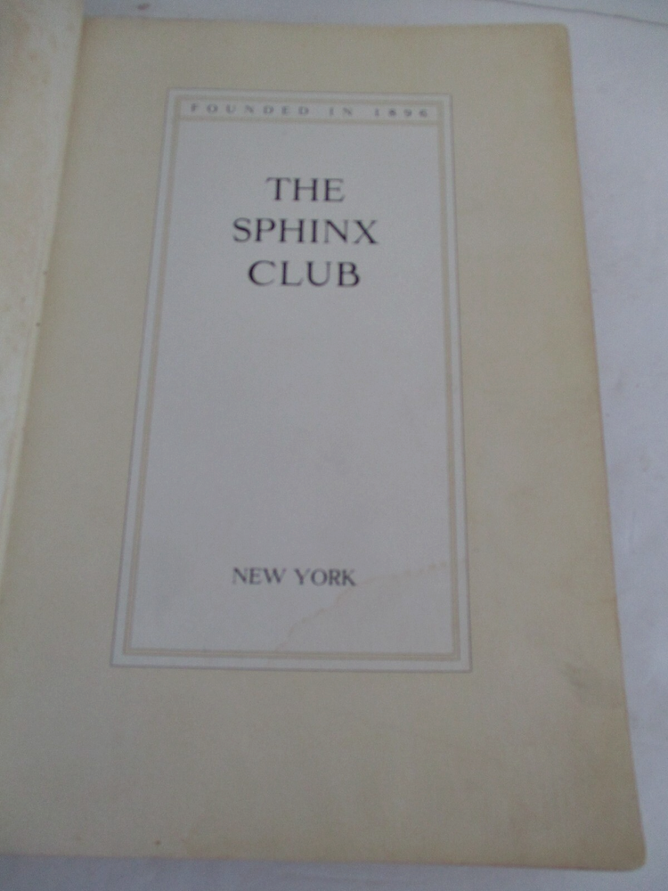 The Sphinx Club was founded in 1896 for the benefit of advertising men. I later became known as the Advertising Club of New York. Book measures 9 3/4 x 6 1/2 inches with flexible suede covers, all page edges gilt, lists of officers, constitution, resident and non-resident members, many b&w photos of members. Rare, Thank you.