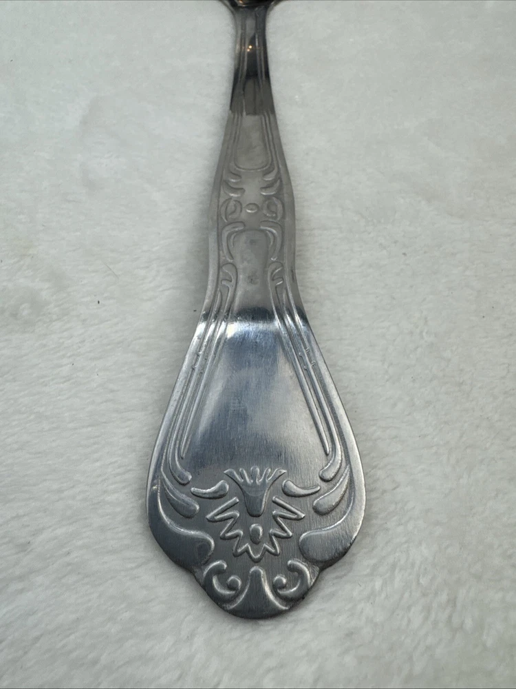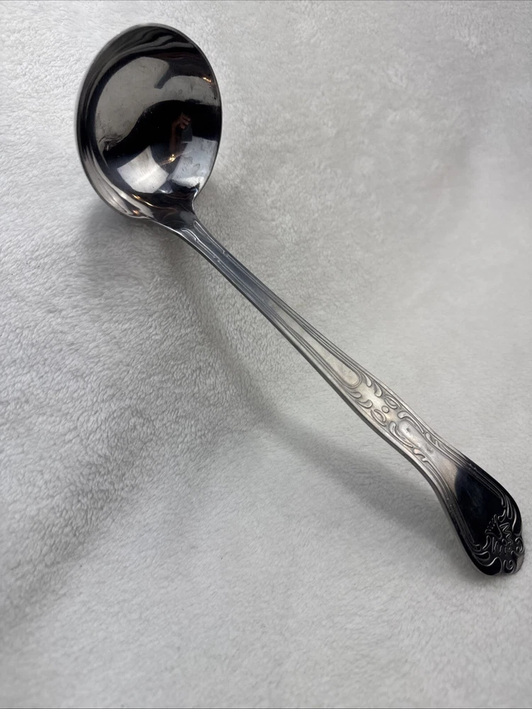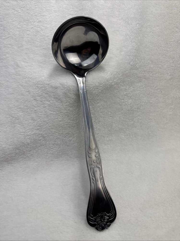 This stainless steel serving ladle from Spoonful of Comfort is perfect for dishing out soups, stews, and chilies with ease. Its 9-inch length and scroll handle pattern make it a versatile addition to any dinnerware collection. The ladle is reusable, BPA-free, and dishwasher safe, ensuring that it will last for years to come. Crafted with care and attention to detail, this original piece is ideal for mealtime occasions and is sure to become a favorite. Its glossy finish and silver color add a touch of elegance to any table setting. Whether you're serving up a delicious soup or chili, this ladle is the perfect tool for the job.