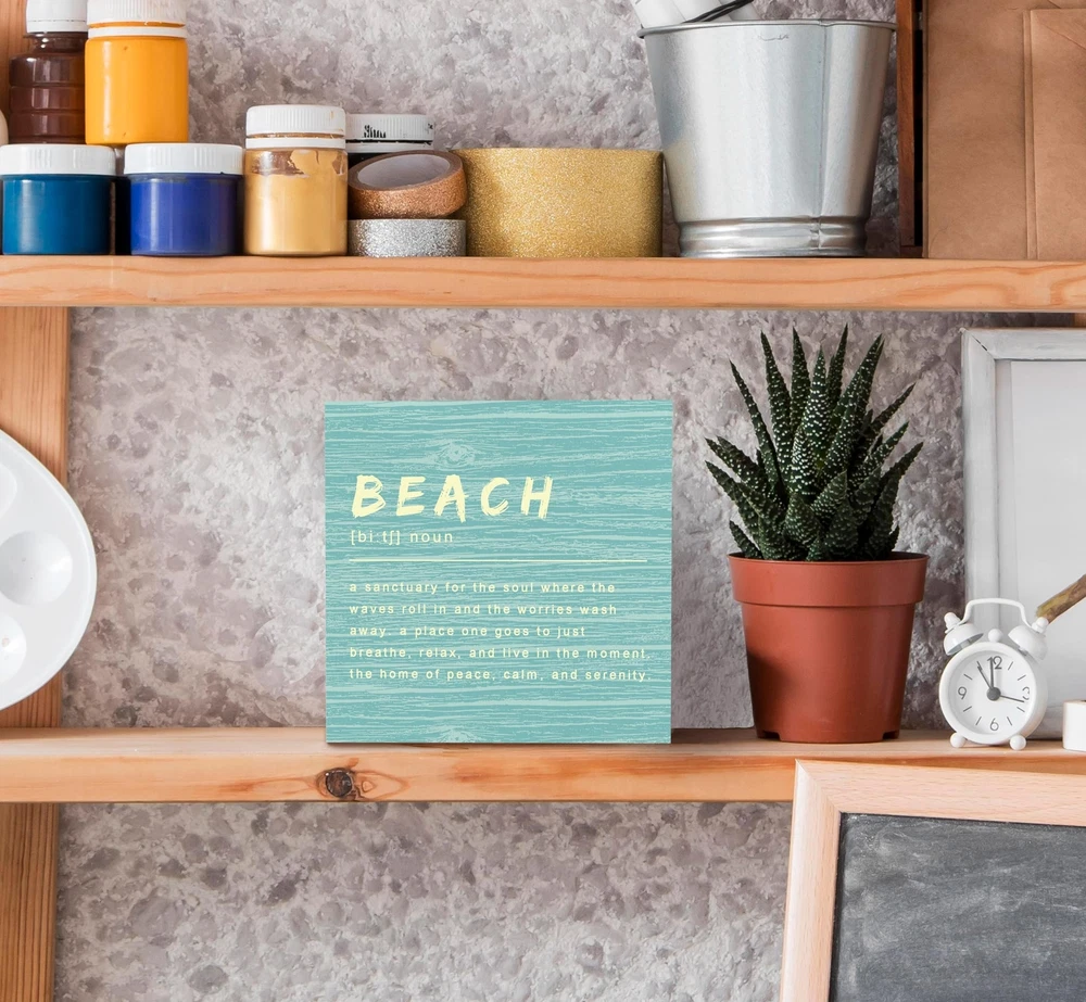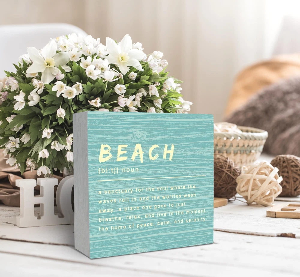 SRADMO Beach Sign Wood Box Sign Desk Decor, Coastal Decor, Beach Decorations For Home, Light Blue Decor, Beach House Wooden Box Sign Decoration, Beach Room Decor, Ocean Theme Gifts Shelf Table Decor Product Details Color: Turquoise Brand: SRADMO Recommended Uses For Product: Beach-themed home decor, bedroom, living room, office decor Product Dimensions: 5"L x 5"W Style: Modern Brand Name: SRADMO Recommended Uses For Product: Beach-themed home decor, bedroom, living room, office decor Style Name: Modern Color: Turquoise Item Dimensions L x W: 5"L x 5"W Perfect for anyone who loves rustic and natural decor, this wooden box sign makes a perfect present, its durable construction making it a practical and stylish addition to any home. It have a classic wooden finish and considerably more intriguing when interesting content is combined with striking designs that make it a beautiful piece that will complement any interior style. This wooden box sign is a good gift choice, It is perfect suitable for birthdays, holidays, Christmas, weddings, or anniversaries or any special occasions. It can be used to enhance the aesthetics of any space, whether it's a bedroom, living room, or office. The size of this wooden box sign is 5*5 inches. This beautifully crafted wooden box sign that is perfect for decorating your home or for use as a unique gift for friends and loved ones.