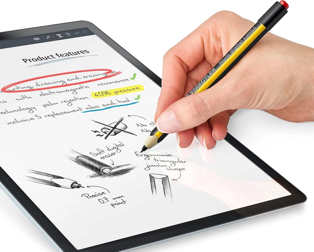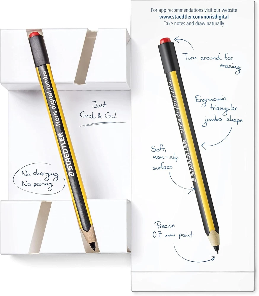 STAEDTLER Noris jumbo 180J 22. EMR Stylus with soft eraser. For yellow-black Product Details Brand: STAEDTLER Series: Staedtler Noris digital jumbo 180J 22 Item model number: STAEDTLER Noris Digital Jumbo 180J Item Weight: 0.353 ounces Product Dimensions: 5.51 x 0.36 x 0.36 inches Item Dimensions LxWxH: 5.51 x 0.36 x 0.36 inches Color: yellow-black Battery Type: Alkaline Manufacturer: STAEDTLER Language: English, English, English, English, English Color: yellow-black Brand: STAEDTLER Material: Wood Item Weight: 10 Grams Compatible Devices: Please check the compatible devices listed in the "Compatibility Guide (PDF)" Item dimensions L x W x H: 5.51 x 0.36 x 0.36 inches Are Batteries Included: No Batteries Required?: No Battery Description: Alkaline Manufacturer: STAEDTLER Stylus in an ergonomic triangular jumbo pencil shape which provides a very natural writing and drawing experience on all compatible devices with EMR Technology No empty batteries or annoying cables: The stylus does not need a battery and so never needs to be charged; it does not need to be paired with your device or require a driver to be installed IMPORTANT: Please check the compatible devices listed in the PDF "Application Guide" which you can find under the product guides and documents; Noris digital is not compatible with Apple devices Palm Rejection: Thanks to the enhanced EMR technology just the tip of the pencil is recognized and the palm of your hand will be ignored 4,096 pressure levels: The line width is adjustable depending on the pressure when writing/drawing STAEDTLER Noris digital jumbo 180J 22 - Stylus for digital writing, drawing and erasing on EMR equipped displays The Noris digital jumbo allows you to write, draw and erase straight onto your touchscreen tablets, smartphones and notebooks if they are equipped with EMR technology. The stylus combines the look and feel of a traditional pencil with the technology of WACOM, offering you the advantages of both. The Noris digital is compatible with a variety of smartphones, tablets and notebooks with EMR technology. Please refer to the PDF "Application Guide (PDF)" which you can find under "Product guides and documents". Product features: EMR technology of WACOM (electromagnetic resonance) Comfortable thick triangular shape which is particularly suitable for children's hands and is also comfortable for adults, and allows you to write without your hand getting tired Non-slip soft surface 4,096 pressure levels Palm Rejection Adjustable line width depending on the pressure when writing/drawing Precise, replaceable 0.7 mm pencil point No batteries needed No pairing or driver installation Dimensions: Approximately 140 x 9.1 mm Weight: Approximately 10 g WOPEX wood-based material Made In Germany Scope of delivery: One STAEDTLER Noris digital jumbo Stylus with a soft digital eraser, five spare nibs and a replacement tool; Noris digital is not compatible with Apple devices; Note:-It is important to check if the end device has an EMR digitizer in the display before purchasing to make sure the Noris digital will work on the end device. Compatibility list: