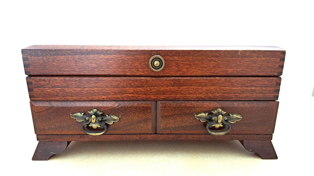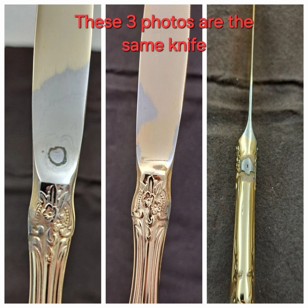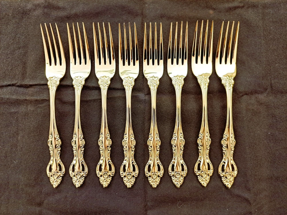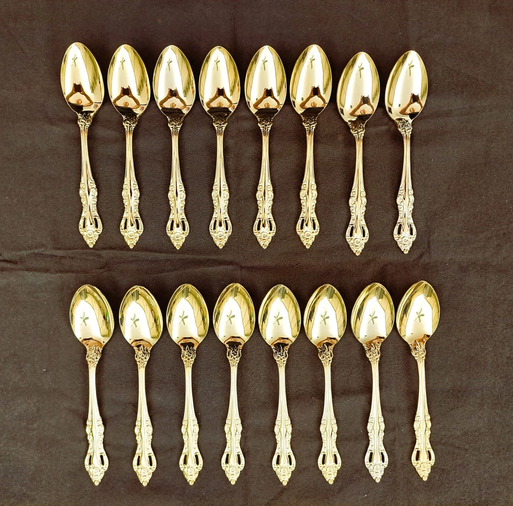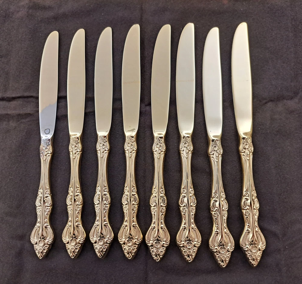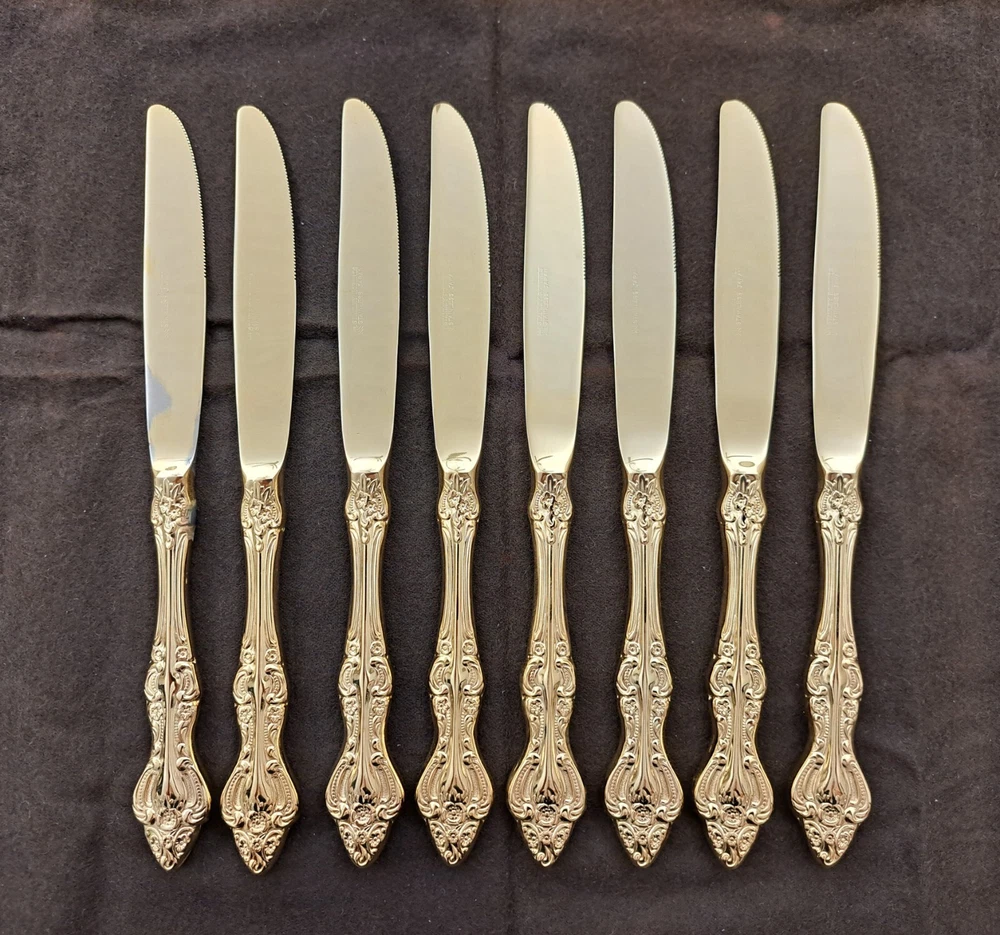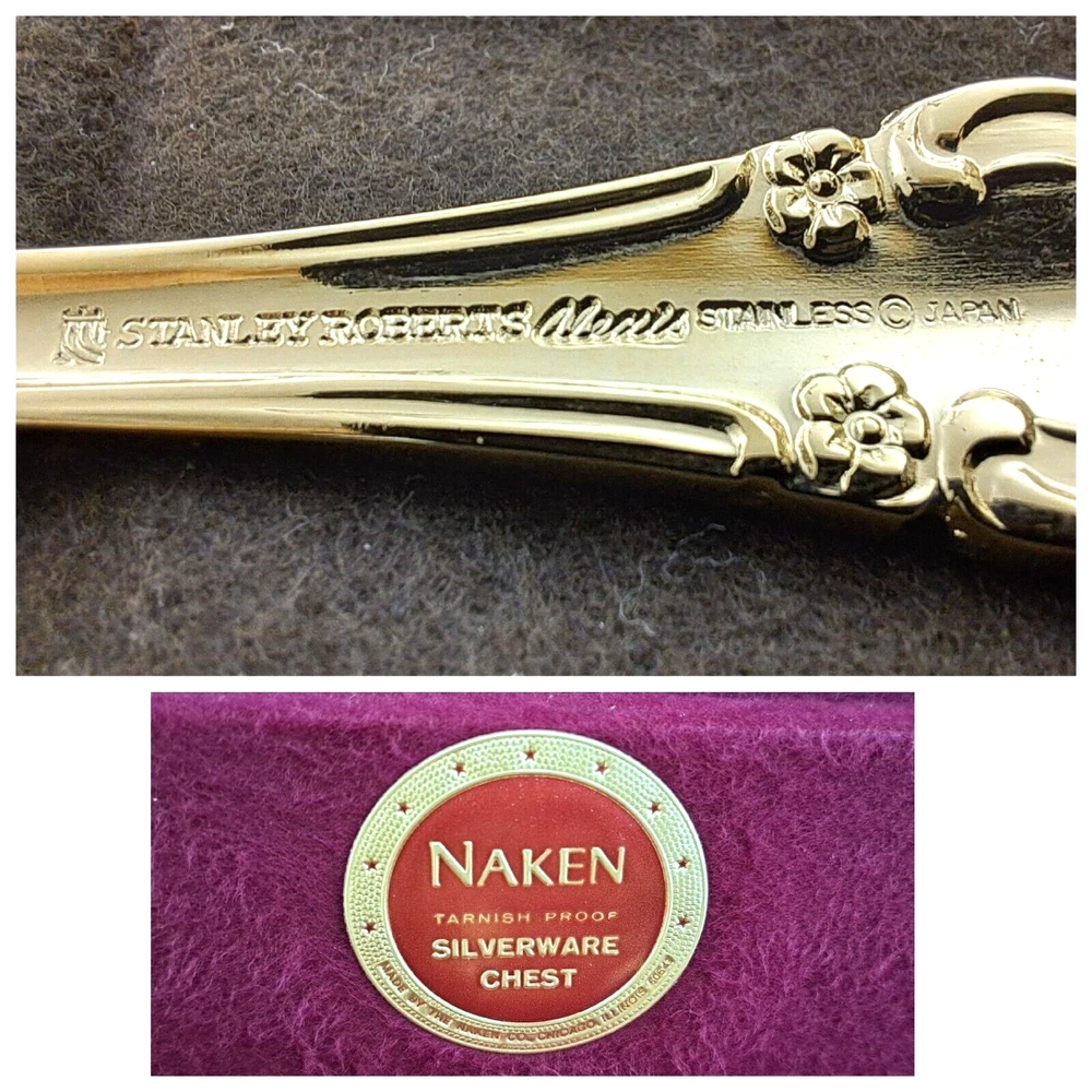 STANLEY ROBERTS ALEXIS GOLD PLATED STAINLESS FLATWARE 71 PIECES W/STORAGE CHEST One owner All of the pieces in this set are gold electroplated These have never been used There are 71 pieces of flatware and service ware and a storage chest This is a flatware set for 8 people The chest is a Tarnish Proof storage chest There are some tiny scratches on the outside of the chest On the back of the flatware and service ware it says - Stanley Roberts Alexis Stainless Japan There is a tiny bit of surface scratches on the flatware from stacking and storage Included in the 71 pieces there is a demitasse spoon by Truly Tasteful Stainless Steel Also included in the 71 pieces are 16 Iced Tea Spoons by Oneida Community Silver Gold Beethoven Gold Electroplate. On the back of the Iced Tea Spoons it says Oneida Community Please see the photos for gold loss and scratches A list of flatware and service ware in the storage chest and their approx. length: 8 Forks - 7 5/8" 16 Teaspoons - 6 1/4" 8 Salad Forks - 7" 8 Knives - 9 1/8" 8 Oval Soup Spoons - 7 1/8" 1 Butter Knife - 7 1/8" 1 Slotted/Pierced Serving Spoon - 8 3/4" 1 Sugar Spoon - 6 1/8" 1 Meat Serving Fork - 9" 1 Demitasse Spoon - 4 3/4" - by Truly Tasteful - Stainless Steel 1 Gravy Ladle - 6 5/8" 1 Serving Spoon - 8 1/2" 16 Iced Tea Spoons - 7 1/2" - by Oneida Silver - Gold Beethoven - Gold Electroplate Please see pictures, they are part of the description This item has always been in a smoke free air conditioned environment Payment is due at time of sale I do not offer refunds Please ask any questions that you may have before buying, I will be happy to answer them THANK YOU FOR LOOKING! HAVE A GREAT DAY! #443