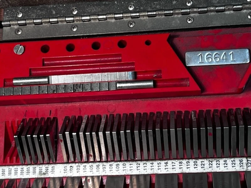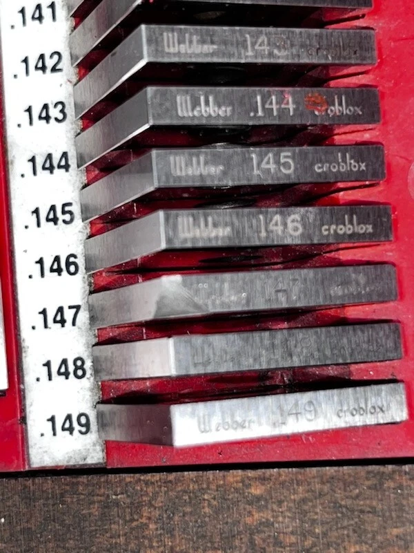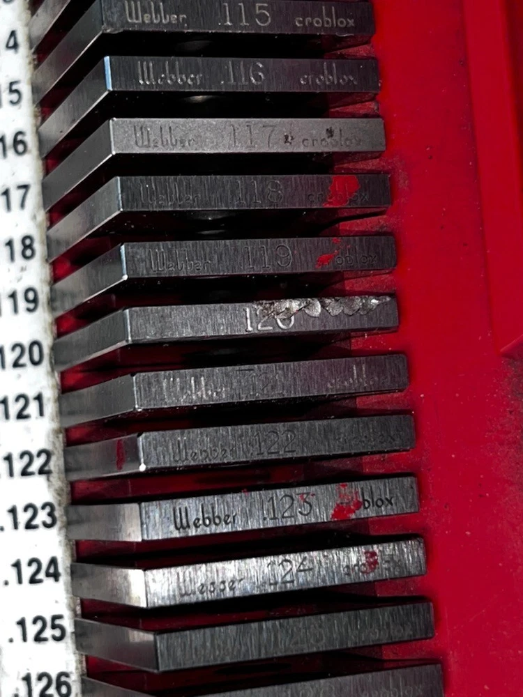 STARRETT CARBIDE GAGE BLOCKS SET NOT COMPLETE.MISSING BLOCKS ARE;.100, ,050, .100025, ,1001, .1002, .1003. STEEL BLOCKS ARE; .500, .1004, .1006, .1008, .1009. 2 blocks have a small chip.