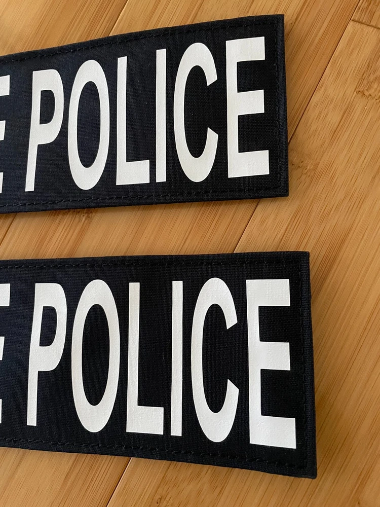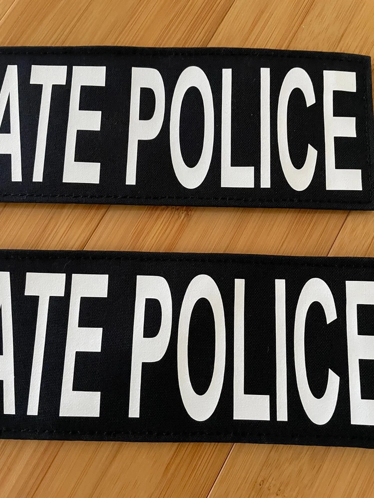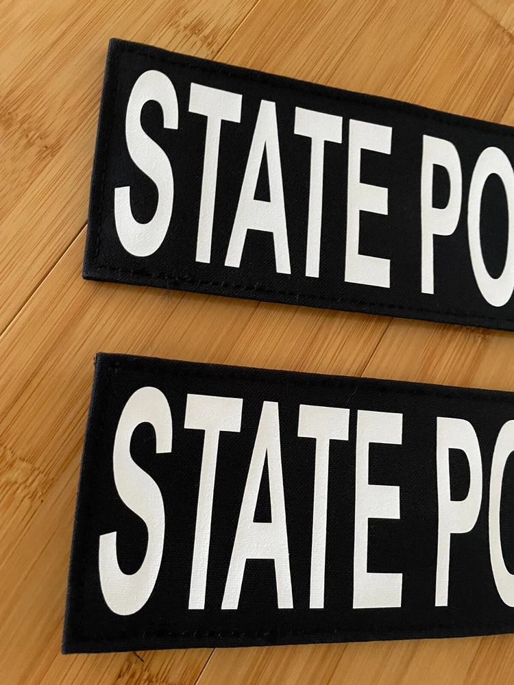 STATE POLICE Patch 8.5X3 Navy Cordura W/White Lettering Hook Back 2 pieces Silk Screen Printed Hook side of the Hook and loop in the back. PATCH375