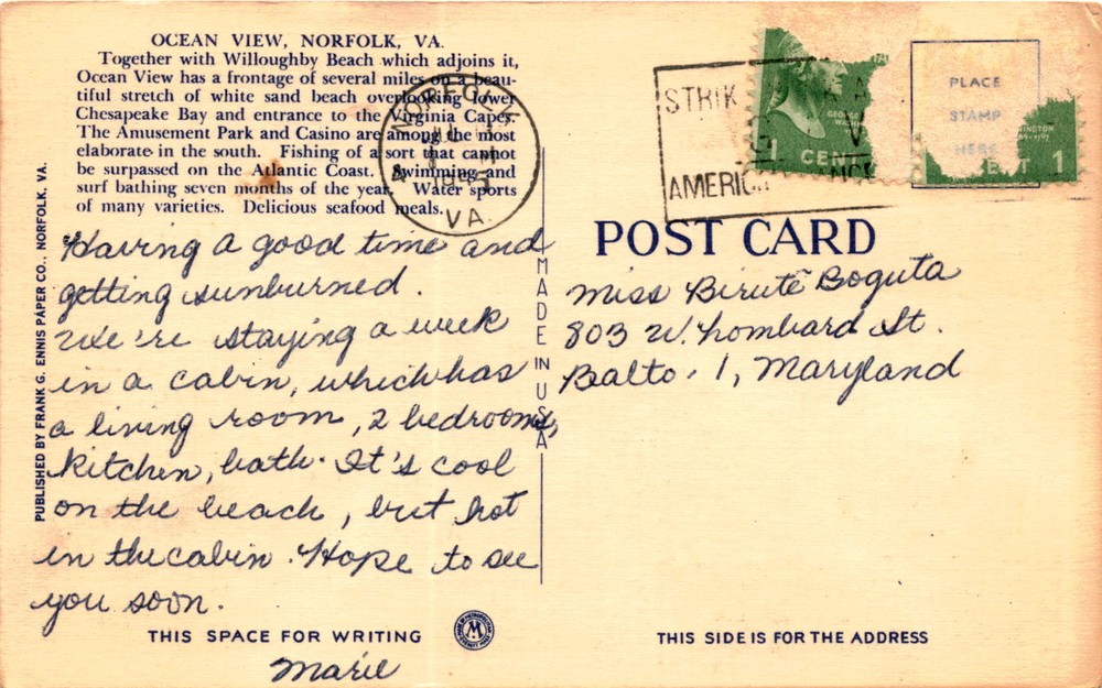 MAKE AN OFFER. THE MORE YOU BUY THE BETTER DEAL I WILL ACCEPT The postcard features an image of surf bathing at Ocean View in Norfolk, Virginia, published by the Frank G. Ennis Paper Co. Ocean View, along with Willoughby Beach, has a long stretch of white sand beach overlooking the lower Chesapeake Bay and the entrance to the Virginia Capes.