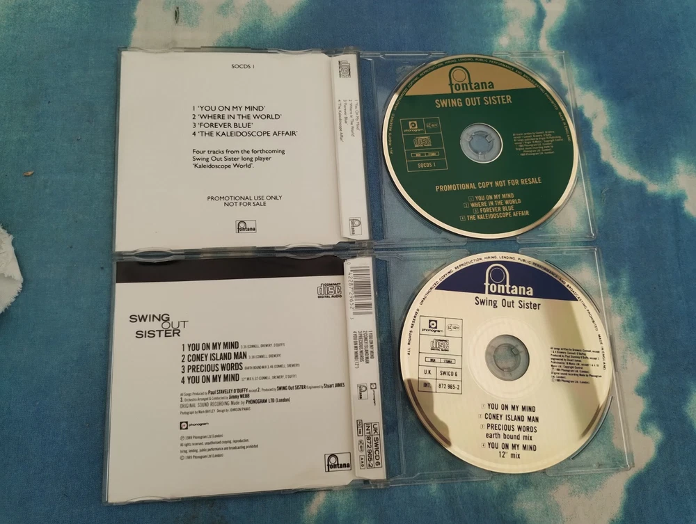 . Catalog# Artist Title cd Condition Sleeve Condition Label Format SOCDS1 Swing Out Sister Excerpts From 'Kaleidoscope World' VG+ Near Mint (NM or M-) Fontana CD, Promo, Smplr 872 965-2, SWICD 6 Swing Out Sister You On My Mind Excellent (EX) Excellent (EX) Fontana, Phonogram CD, Single ANY QUESTIONS PLEASE FEEL FREE TO ASK PLEASE SEE BELOW EXPLANATION OF GRADINGS SLEEVE & CD GRADINGS · MINT: The CD itself is in brand new pristine condition without any surface marks visible or any deterioration in sound quality. The cover and any extra items such as the inner sleeve, lyric sheet, booklet or poster etc are in perfect condition. CDs advertised as Sealed or Unplayed should be Mint. EXCELLENT: The CD shows some signs of having been played, with some very light surface marks, light fine hairlines and indicates that it has been well cared for. The cover and packaging/inserts etc might have very light age related storage wear - mostly near the edges and / or very light creasing, plus/or very light ring wear. VERY GOOD+: The CD will have light surface marks/very light scratches - there should be no skips or jumps. Sleeve with general storage wear - some light distinct creases & light wear around the edges, CD ring wear. No writing on sleeve, tears or any deface-ments. VERY GOOD: The CD has obviously been played many times, but displays no major deterioration in sound quality, despite noticeable surface marks and some light scratches, but no skips or jumps. Normal wear and tear on the cover or extra items, (as per VG+) without any major defects, will also include scuff marks, light indentations, light foxing No sleeve tears or any defacements. GOOD: A CD in Good or Good Plus condition can be played through without skipping. Many light scratches will be visible throughout. A cover or sleeve will have more distinctive defects, such seam splits, especially at the bottom or on the spine, tape, tape residue, writing, more pronounced CD ring wear, extreme wear on the edges, more noticeable/deep creases, and other defects might be present, as well as the above. It may not be possible to read the text on the spine. There might be some damage/wear to the artwork Please take a look at my other sales for other rare cd items! Be sure to add me to your favourites list ! so you don't want to miss out on any of the many forthcoming rare vinyl & cd bargains that I shall be listing in the near future. I WILL POST WORLDWIDE! I will combine shipping if you wish to bid on additional items. PLEASE DO NOT HESITATE TO EMAIL ME FOR ANY FURTHER CLARIFICATION, OR IF YOU REQUIRE ANY MORE PICTURES. NON-UK PAYPAL UK: PAYPAL, CHEQUE, POSTAL ORDER FAO: Overseas buyers - REF: Shipping - Please note, when the item is valued less than £20 - I will normally send by Royal Mail International Standard, as the item will be insured up to £20, BUT TRACKING/REGISTERED WILL NOT BE INCLUDED If you require tracking, this will be roughly an extra £5.50 - please contact me for confirmation the tracking rate.
