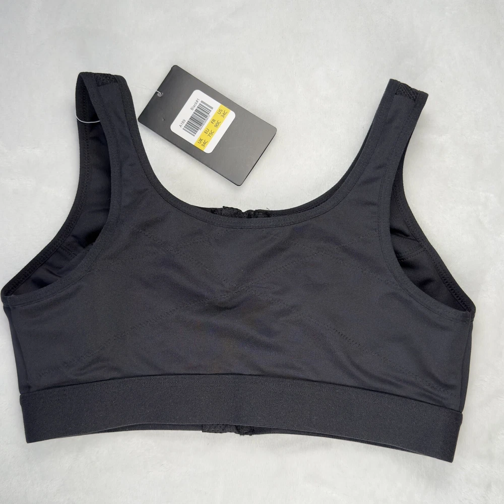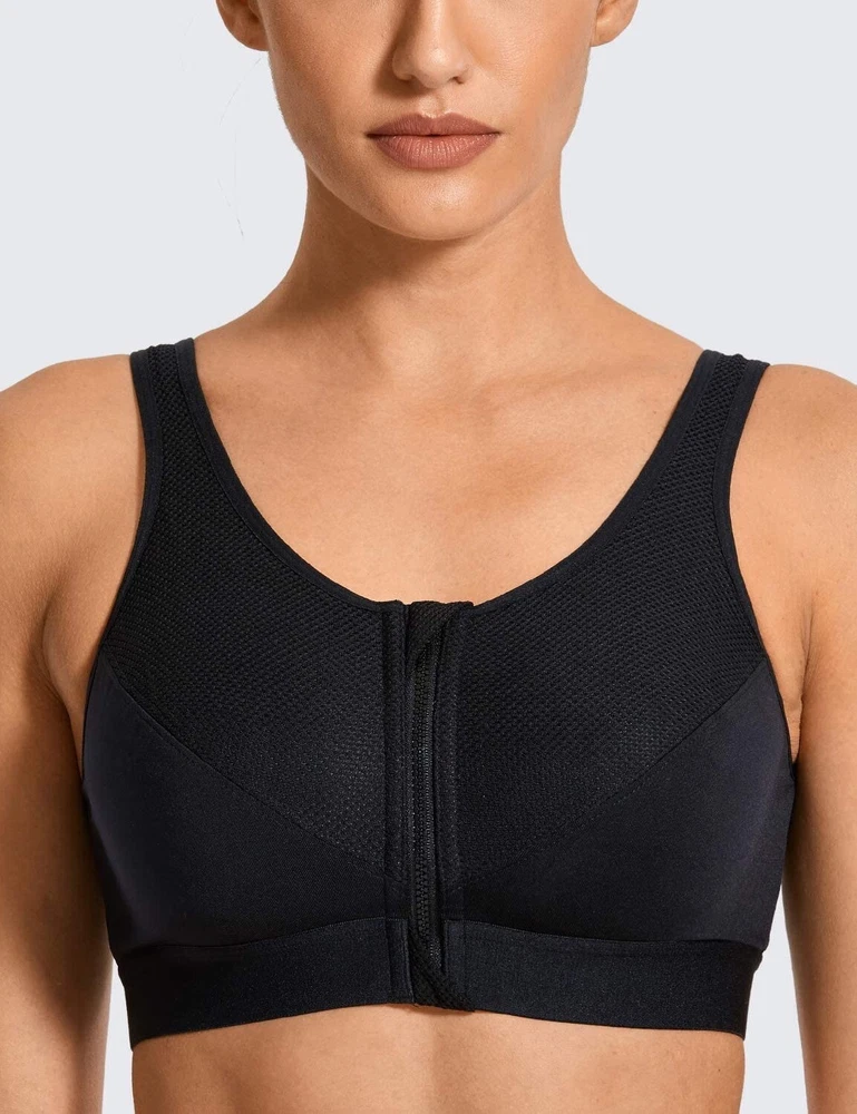 Women's Zip Front Sports Bra, perfect for any performance or activity. This bra features a racerback strap, zip front closure with accent zipper, and high support level for all types of workouts. The bra is made of a blended fabric consisting of 88% polyester and 12% spandex, making it perfect for moisture-wicking during any activewear occasion. The solid black color adds a touch of style to the sports theme of the bra, and the wireless underwire type with cup size A ensures comfort and support for size 34C.