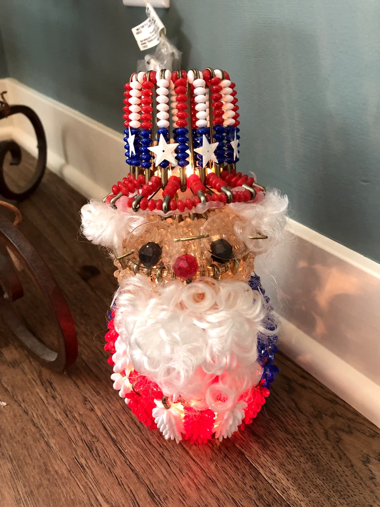 This is a nice piece of safety pin art, The theme is either Uncle Sam or Santa red, white, and blue. Measures 8 inches tall and 4 inches wide at the base. There is a plug with mini lights in the base. It can be plugged into an outlet for a glowing effect in the evening. Please see my rabbit safety pin art, as I can combine shipping. From a smoke free home. Thank you for looking and bidding!
