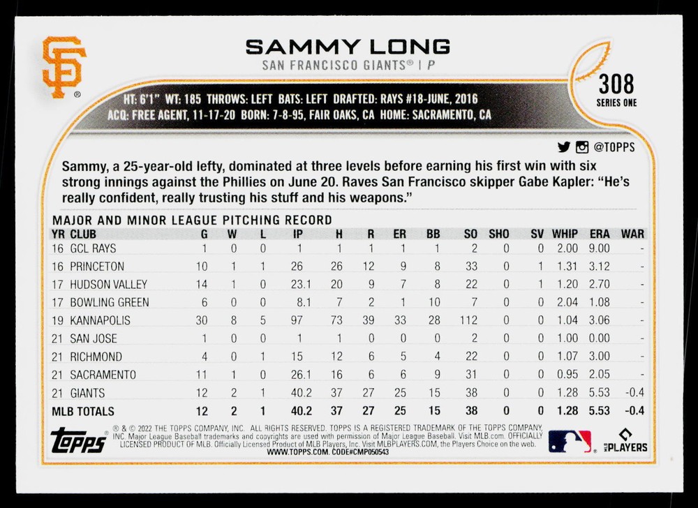 You will receive a , Sammy Long 2022 Topps #308 San Francisco Giants Near Mint or Better condition. Please note i am not a professional card grader the condition of raw cards can be very subjective. Please refer to the high quality pictures to determine condition yourself any questions at all please feel free to ask!! we take pride in the quality of cards we sell and ship, all cards will be shipped in a penny sleeve and top loader for added protection. be sure to save us as a seller, as we are growing and listing daily THANK YOU FOR YOUR BUSINESS