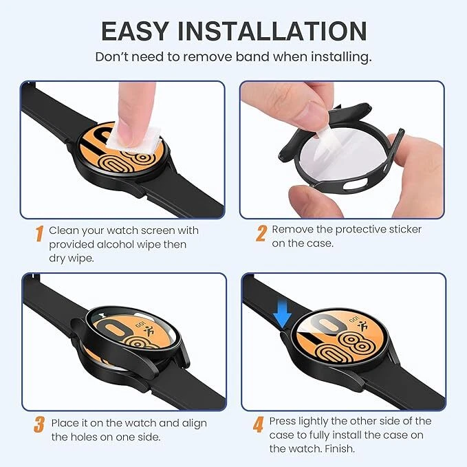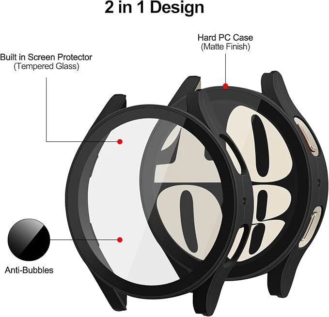 Features: √ High-quality PC case with built in screen protector, designed for Samsung Galaxy Watch 4 40mm/44mm.Samsung Galaxy Watch 5 40mm/44mm. Samsung Galaxy Watch 6 40mm/44mm. √ Ultra thin lightweight design not add any bulk and you will not lose any touch sensitivity. √ All-around protection design keeps the watch screen and four sides away from scratches and damages. √ Designed with precise cutouts for functional buttons and ports. Easy access to all controls, buttons, sensors and iwatch features. √ Quick and easy installation. you don’t need to remove band when installing the case. Product Included: 1 x Hard Full Screen Protector Case Cover( Cases Only, SmartWatch and Watch Band are not included! )