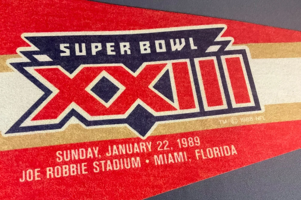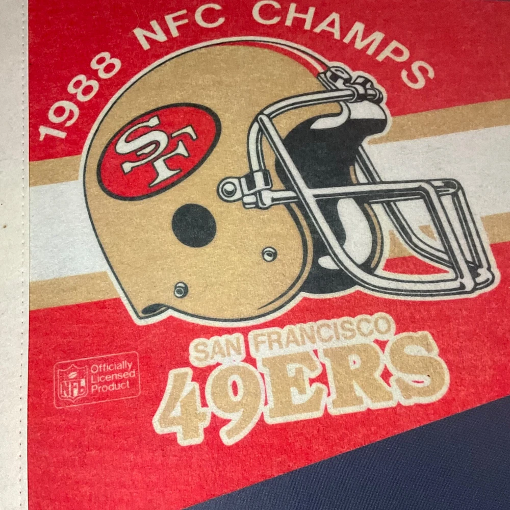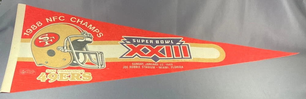 Excellent condition San Francisco 49ers Super Bowl XXIII Champions pennant. The pennant measures 30" long by 12" wide at the left edge. Pinholes at the top, center and bottom of the left edge. No damage. Please see our other listings for more San Francisco 49ers and San Francisco Giants pennants. We will be happy to combine shipping. I have a liberal return policy. If you buy it and don't like it, send it back at your expense for a full refund minus a restocking fee if you comply with the following terms: Within five days of receipt, notify me that you want a refund. The item must be postmarked for return within five days of notification. The item must be returned in the same condition in which it was sent. No partial refunds. Sorry, no international returns. You forfeit your high bid on an item if payment is not received by ten days after auction's close and the item will be offered to the next-highest bidder. Buyer prepays plus shipping (and insurance, if desired). Reimbursement for lost or damaged (insured) items will occur after settlement of claim with carrier.