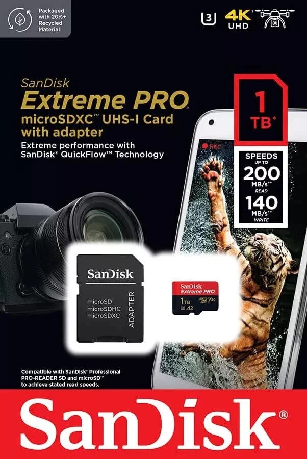 SanDisk 256GB/512GB/1TB Extreme Pro Micro SD MicroSDXC UHS-I U3 A2 Memory Card W/ Adapter Item Weight: 0.32 ounces Item Dimensions LxWxH: 0.59 x 0.04 x 0.43 inches Features: Ideal for Android smartphones and tablets, and cameras. Operating Temperature- (-13°F ) to 185°F (-25°C to 85°C) Package Include: 1 x microSDXC card 1 x Adapter