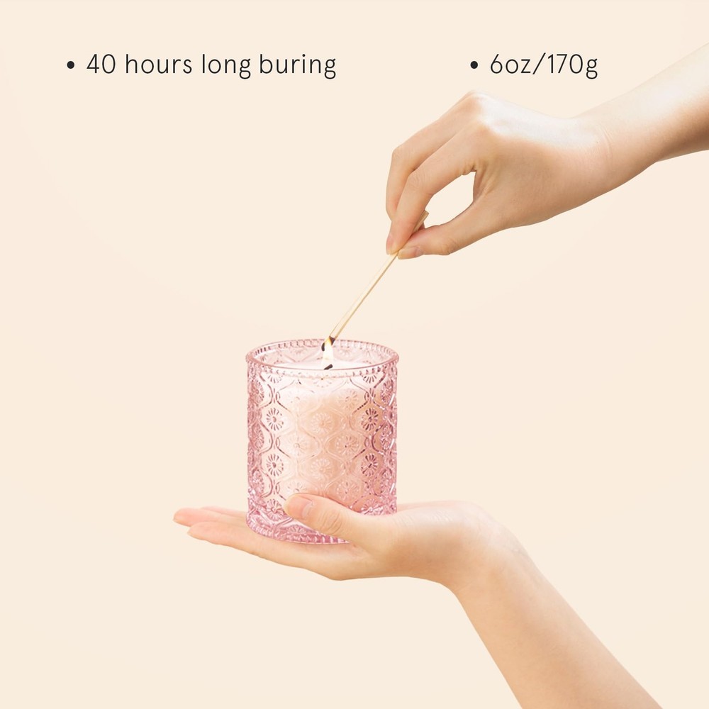 ELEGANT ROSE BOUQUET - Lush rose blossom meets the earthy sandalwood base, together offering you a soft, powdery floral aroma. Feels like wandering in a serene garden at dawn, this rose candle delicately balance the intoxicating scent of fresh blooms with the grounding woody base DECORATIVE JAR CANDLE - This scented candle is poured into a luxurious, thick glass jar with engraved all-over daisy patterns, making it a statement home decor piece. When the candle has burned all the way through, the jar can be repurposed into a beautiful flower vase, brush holder, storage jar, etc ARTISTIC PACKAGING - The candle is packaged in our signature designed box with gold stamp detailing, making it a perfect gift for any occasion like Valentine's Day or birthdays EXCELLENT SCENT DIFFUSION - When you light the candle, the fragrance diffuses rapidly to instantly fill up the room with an invigorating aroma. This candle collection features a variety of inviting aromas for you to choose from SIZE and BURN TIME - 6 oz/ 170 g. Natural wax and lead-free cotton wicks ensure this soy candle burns cleanly and evenly, giving an aromatic 40 hours of burn time that is cruelty-free and preservative-free