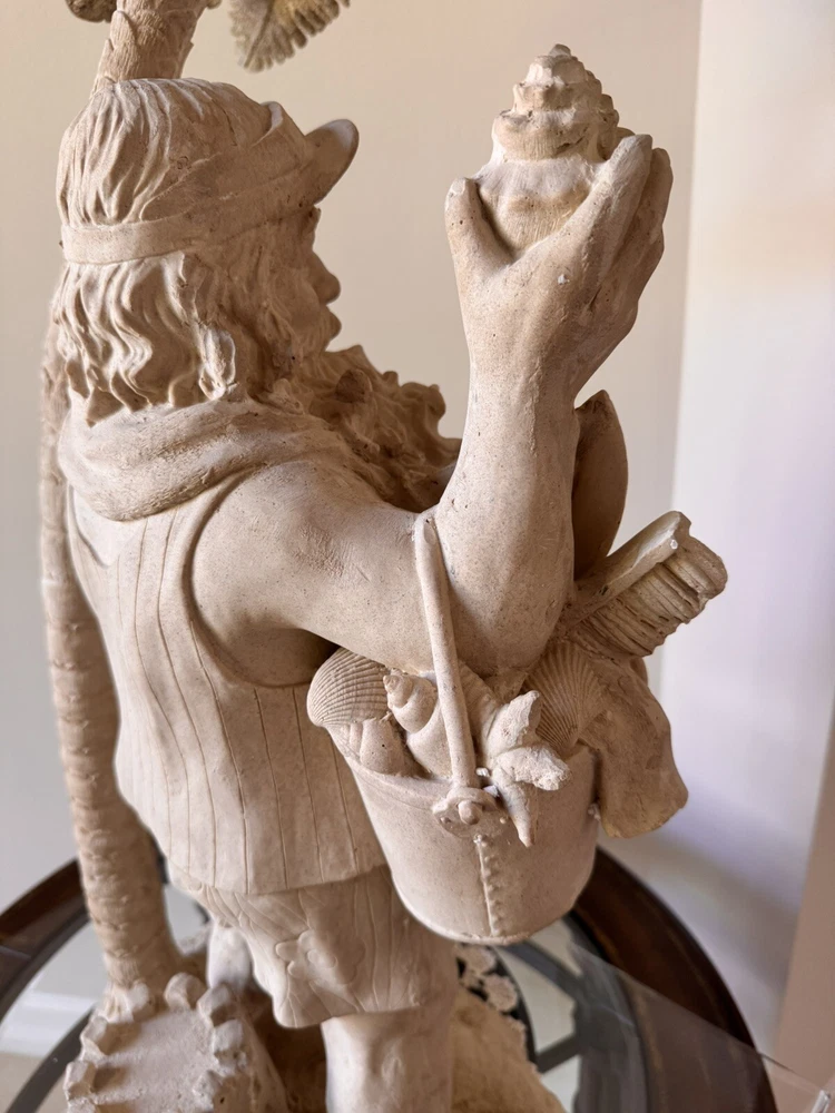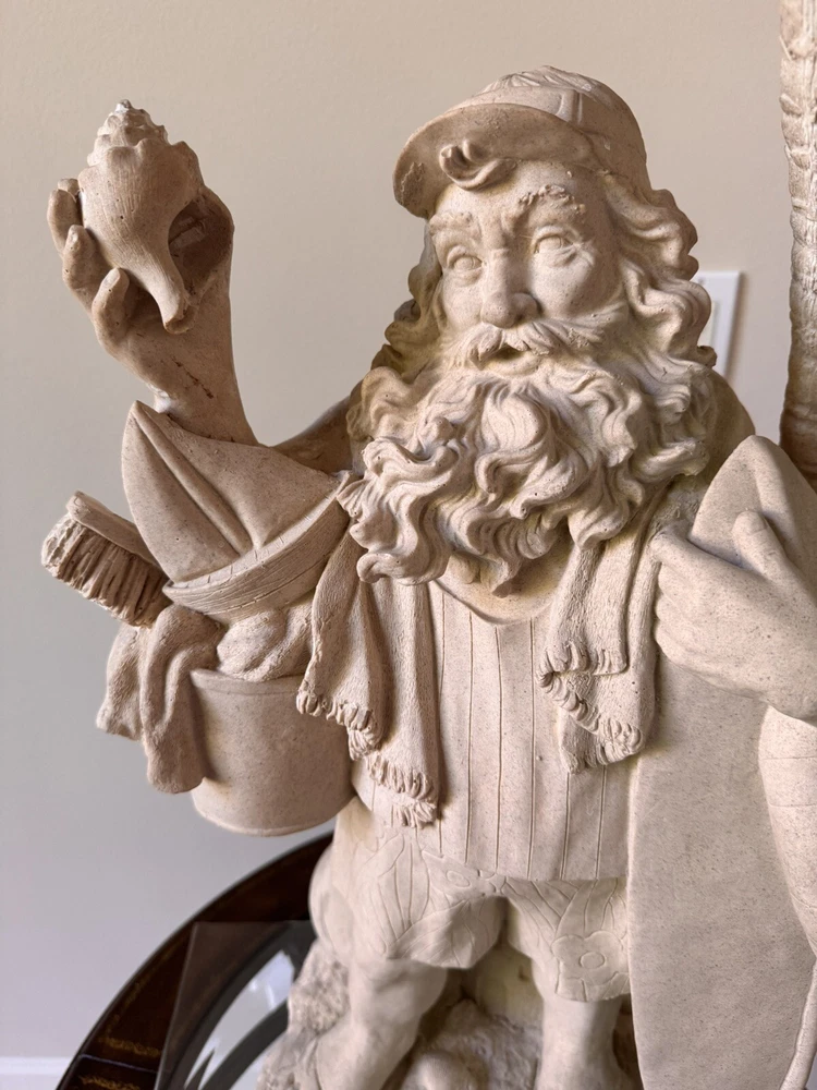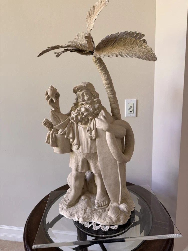 This Santa Claus figurine is a perfect addition to your holiday collection. With a nautical and coastal theme, it features a Santa shape under a palm tree with beach toys and a seashell design. The beige color and resin material make it a medium-sized statue with carvings that add to its charm. Measuring 32 inches in height and 18 inches in width, this handmade figurine is perfect for display on your mantel or shelf. It is a great gift for your loved ones who love Santa and the beach. Get ready to add a unique touch to your holiday decor with this Santa Claus figurine.