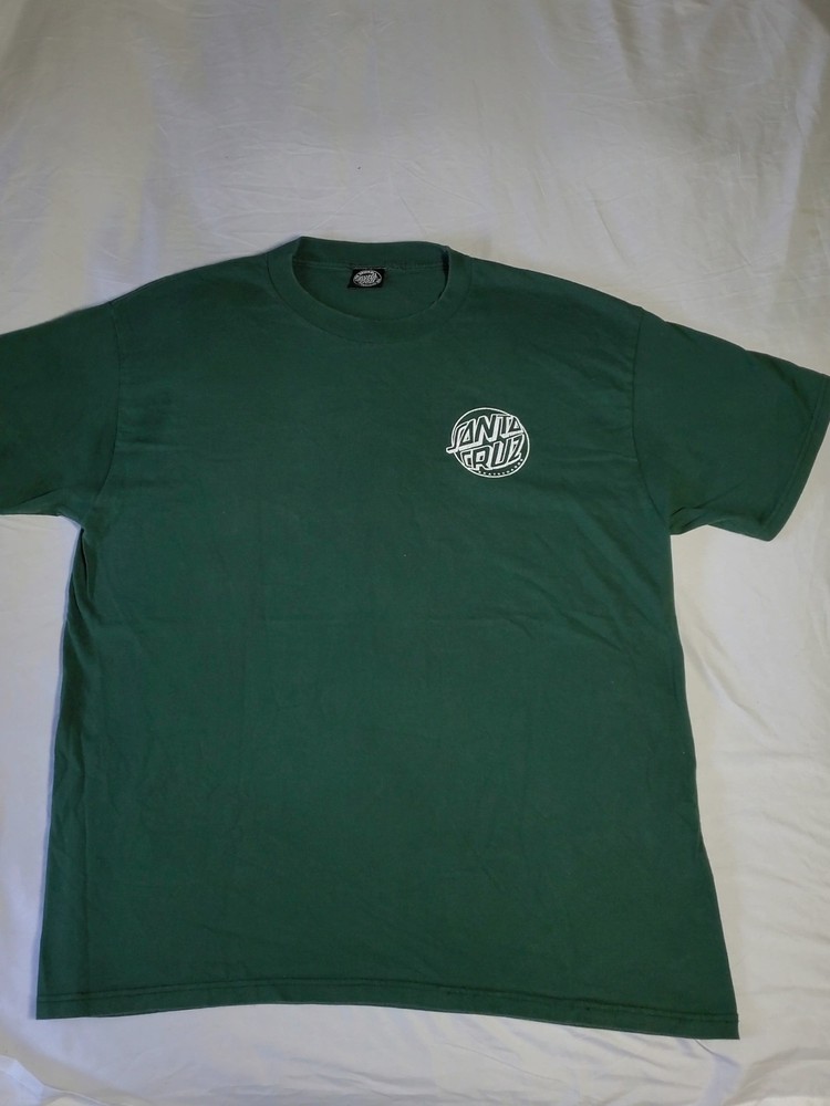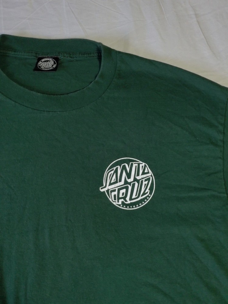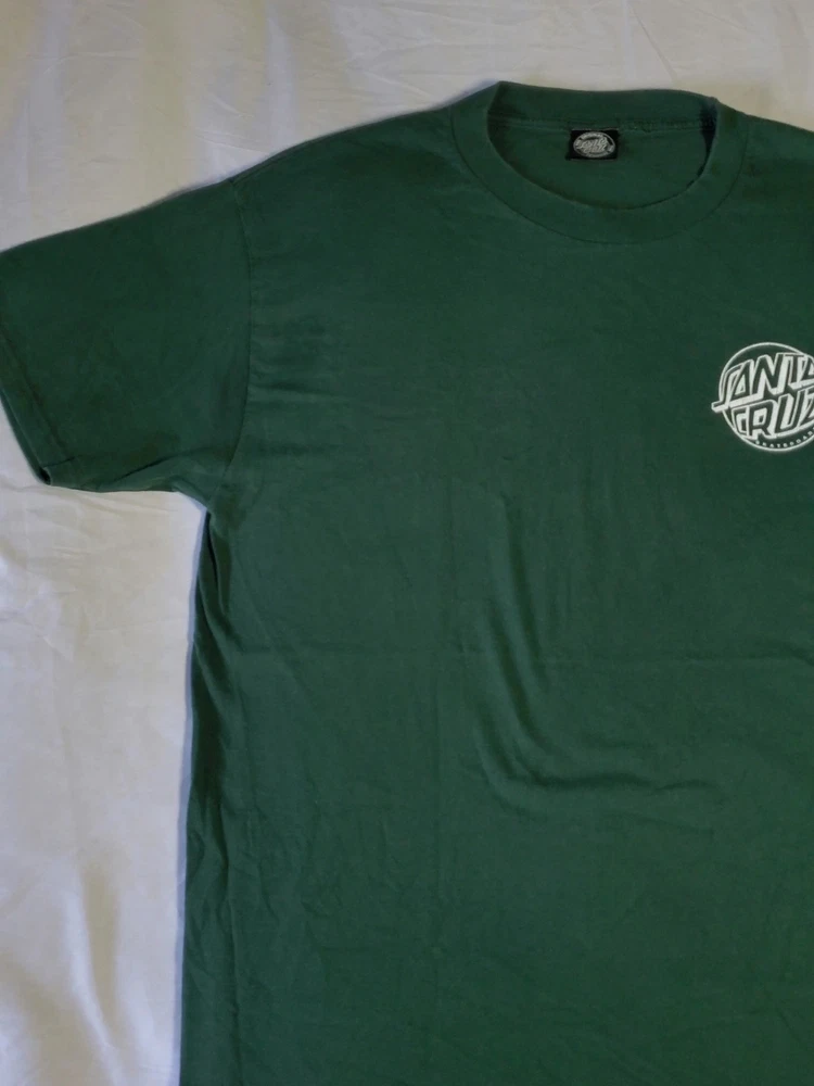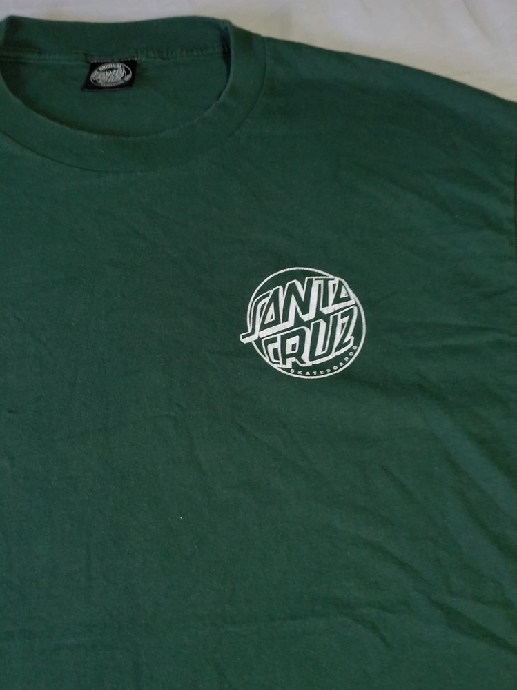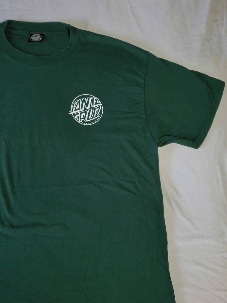 The Santa Cruz Skateboards Men's Green Cotton T-Shirt in size XL is a stylish and comfortable option for any man who loves skateboarding. Featuring a solid green color with a Santa Cruz logo, this short sleeve shirt is made from 100% cotton jersey fabric. The crew neck and slim fit make it perfect for the warmer seasons of summer, fall, and spring. With easy care instructions and a graphic print, this T-shirt is a must-have for any skateboarding enthusiast looking to add some style to their wardrobe.