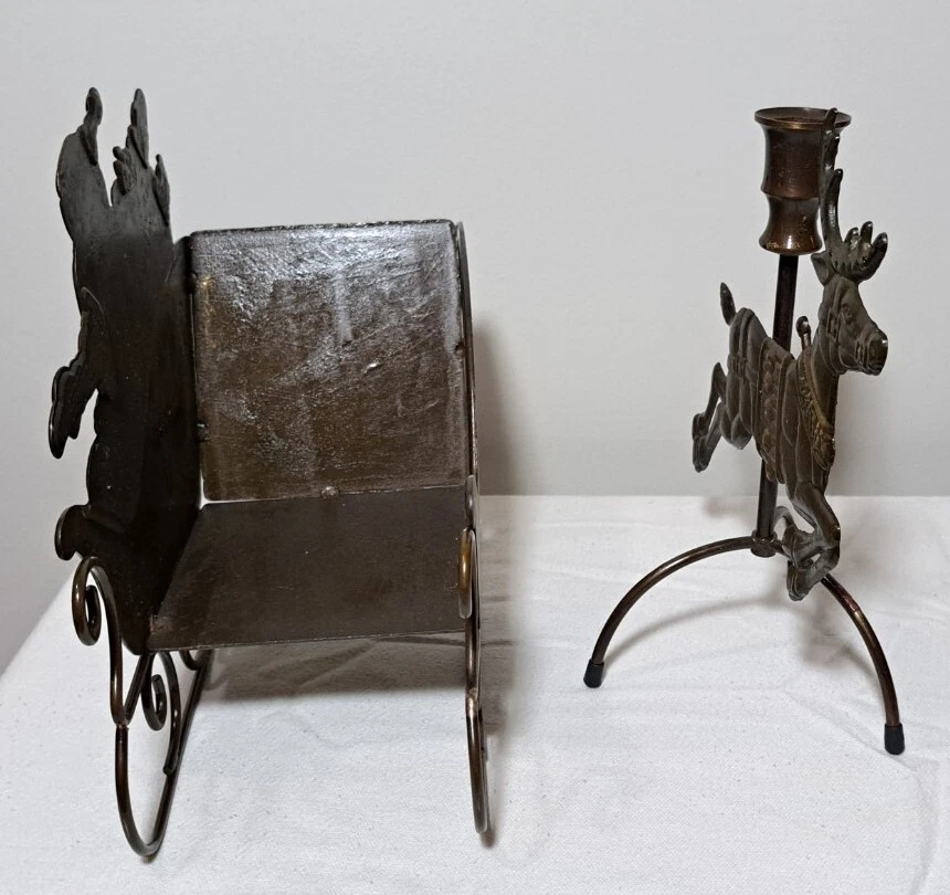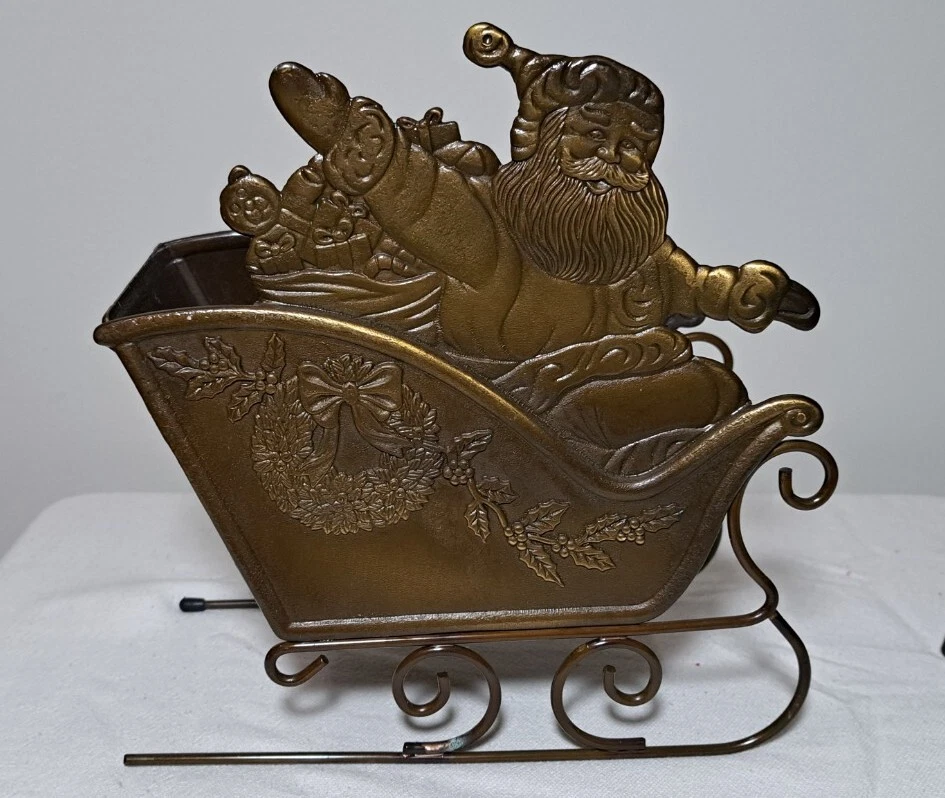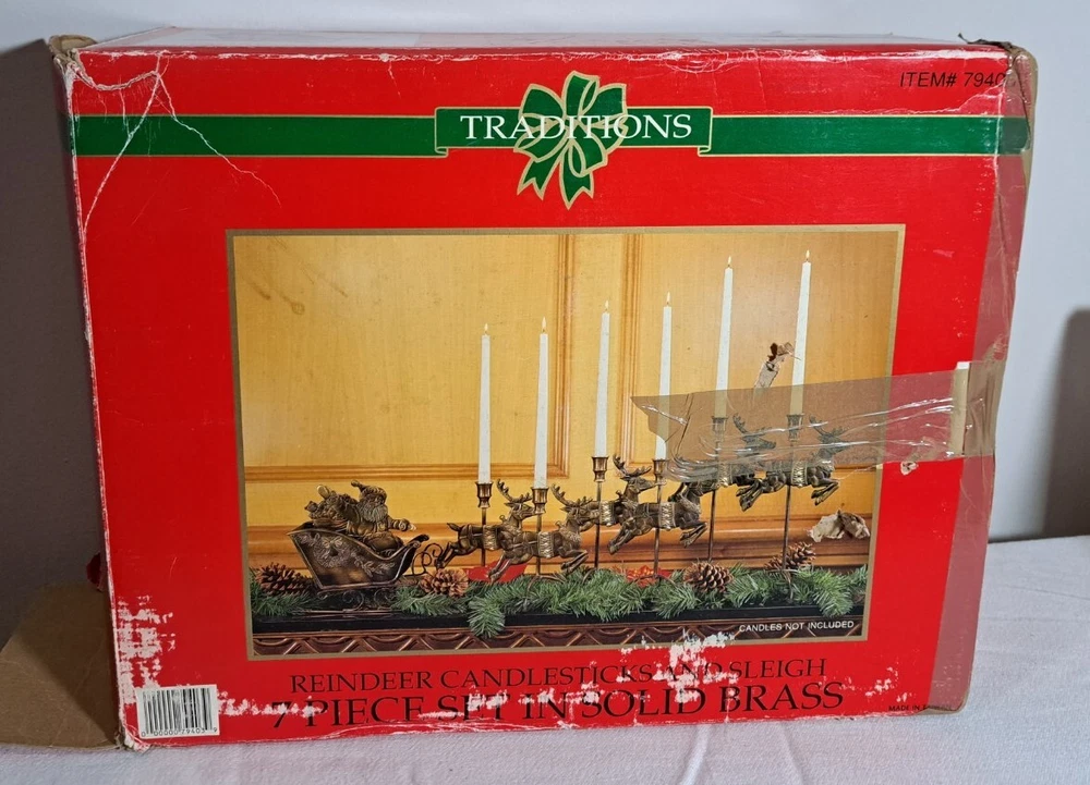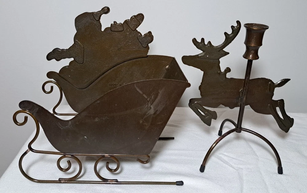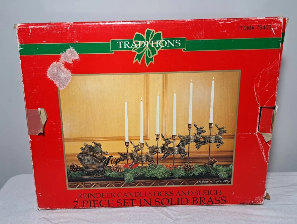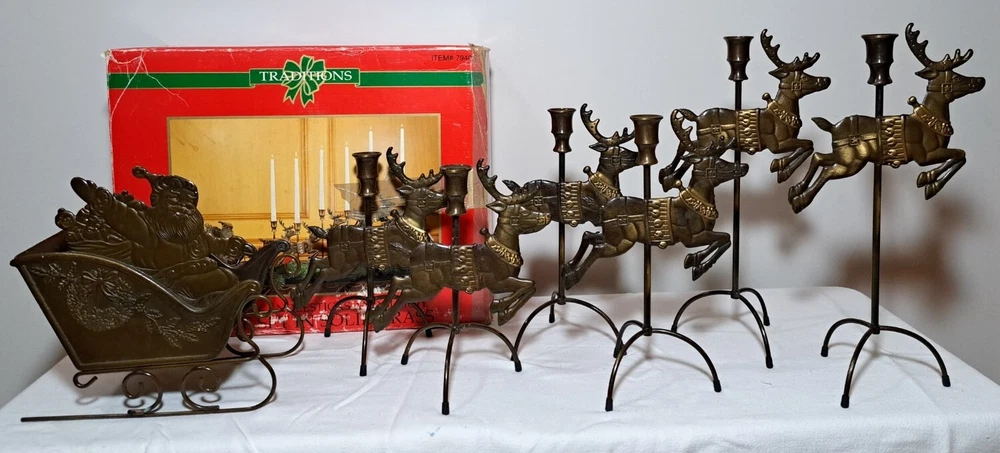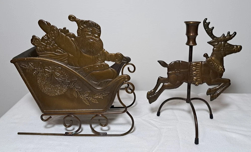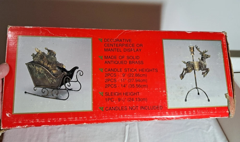 Vintage Mantel Display Christmas Solid Antiqued Brass Santa Sleigh Reindeer Candlesticks Solid Antiqued Brass It can span the length of a mantel top or shorter area it all depends on how you space the pieces out. It is gorgeous on a mantel, tabletop, etc See photos for measurements This is a large display when set up The sleigh can hold a Christmas floral decor or whatever you like It's Solid Antiqued Brass so the box is rather heavy Candles not included I consider this to be in good preowned condition One reindeer has some discoloration in the weld area on the back see last photo In the original box- the box has wear and tape on it Some small candle wax drippings are possible Shipping cost is a little higher as this is a larger box and quite heavy. Please view all photos zooming in on them as they are part of the description for you to judge condition.