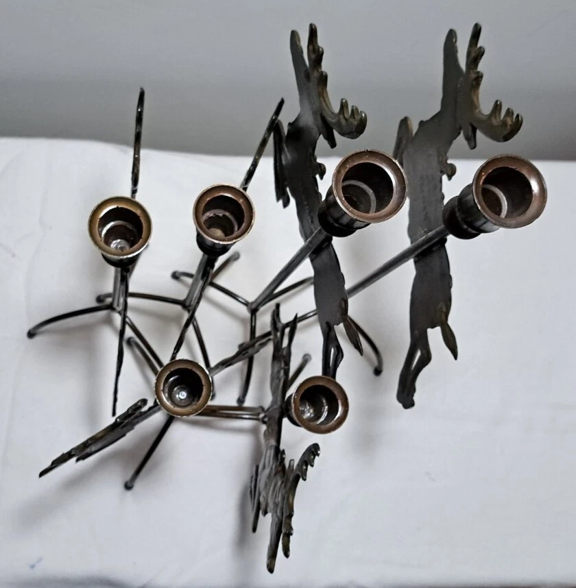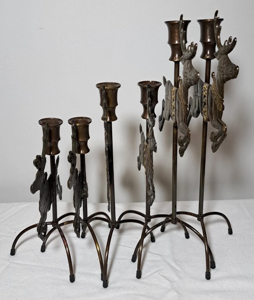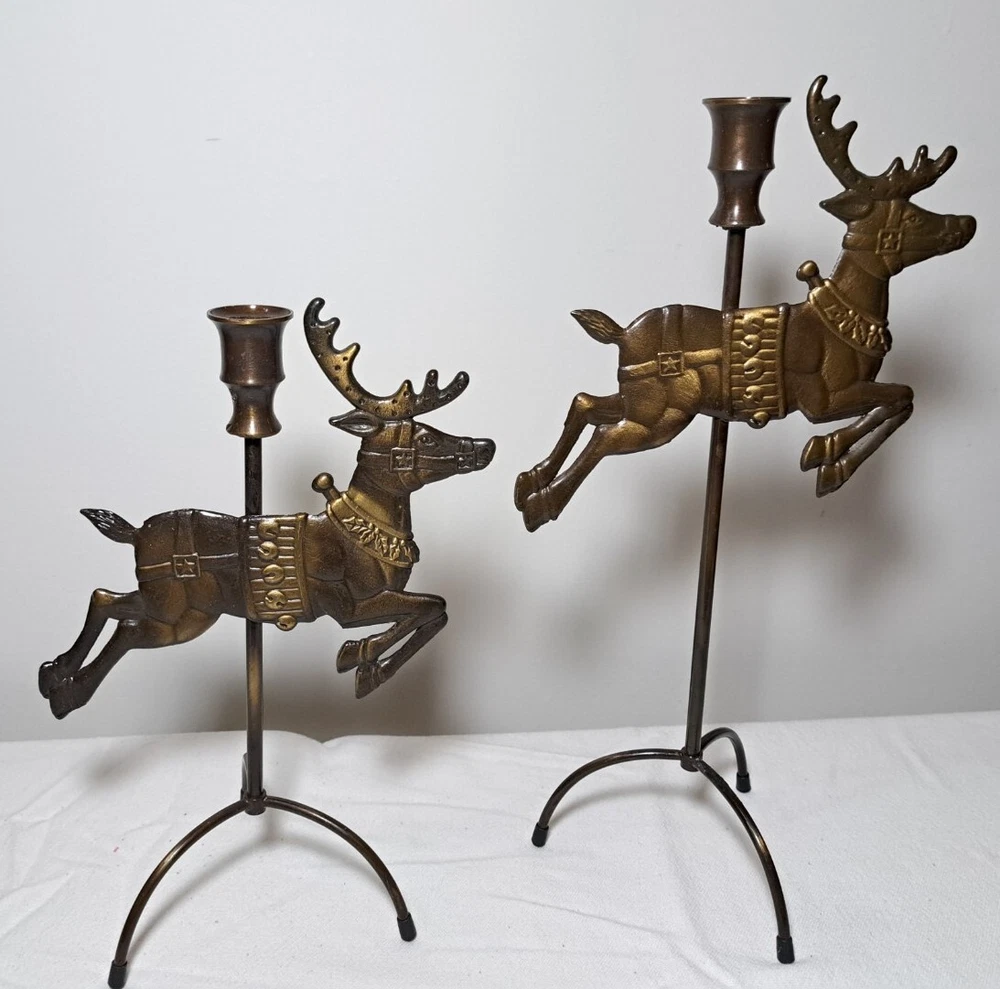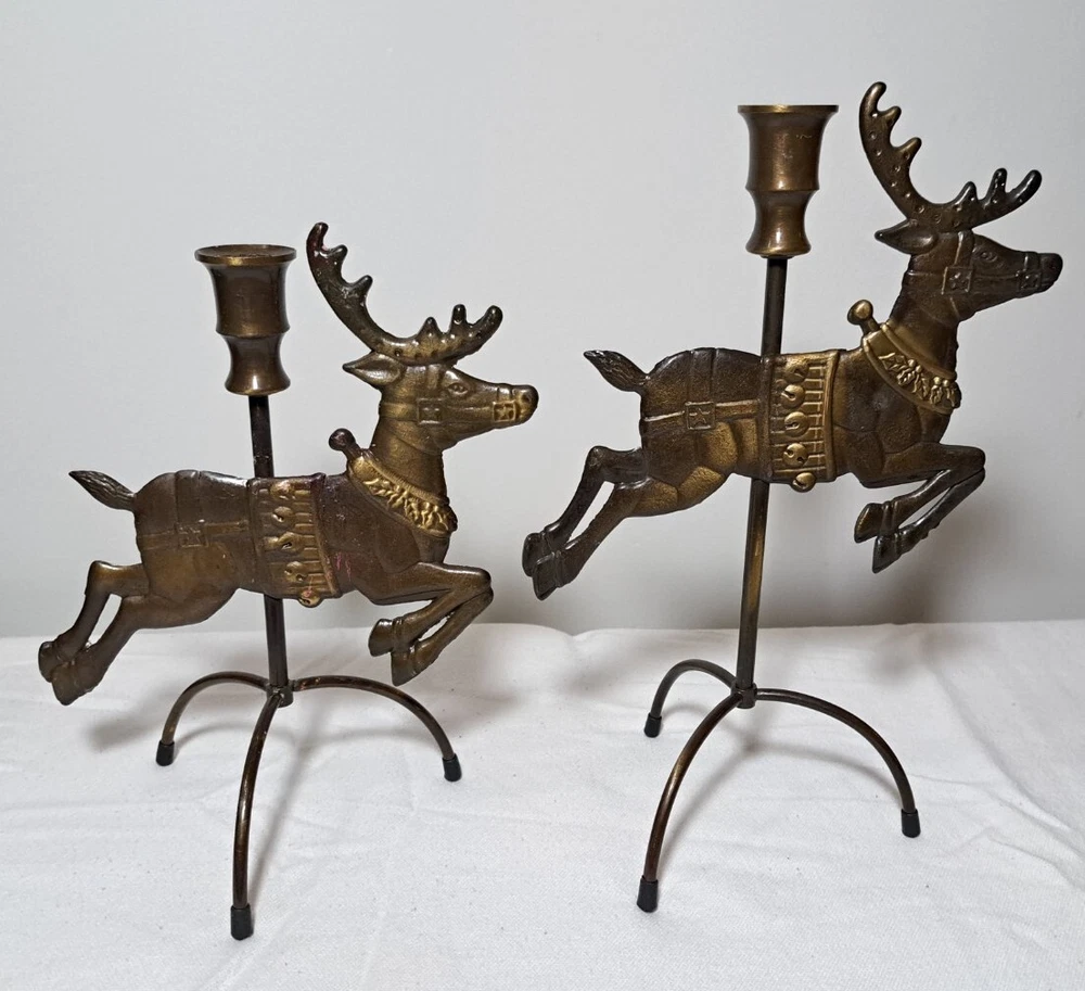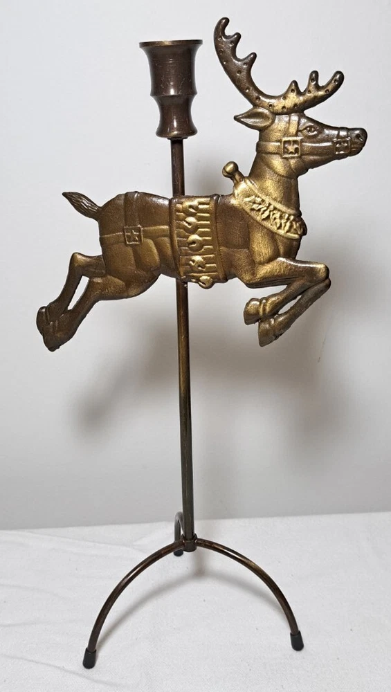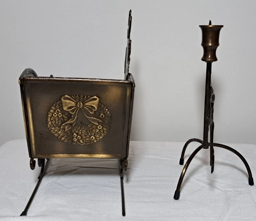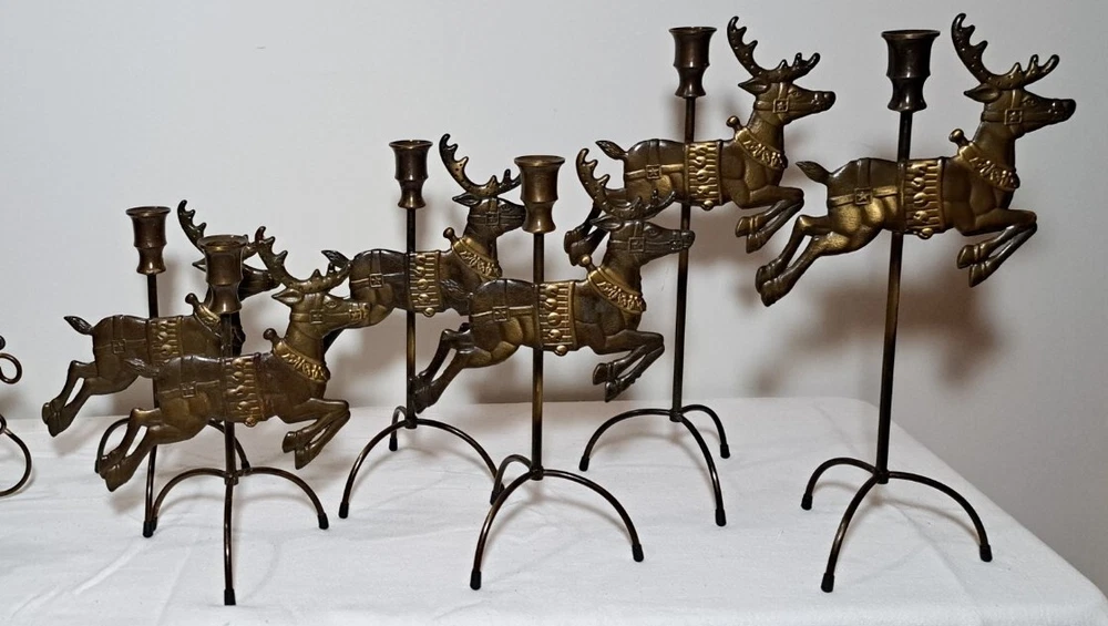 Vintage Mantel Display Christmas Solid Antiqued Brass Santa Sleigh Reindeer Candlesticks Solid Antiqued Brass It can span the length of a mantel top or shorter area it all depends on how you space the pieces out. It is gorgeous on a mantel, tabletop, etc See photos for measurements This is a large display when set up The sleigh can hold a Christmas floral decor or whatever you like It's Solid Antiqued Brass so the box is rather heavy Candles not included I consider this to be in good preowned condition One reindeer has some discoloration in the weld area on the back see last photo In the original box- the box has wear and tape on it Some small candle wax drippings are possible Shipping cost is a little higher as this is a larger box and quite heavy. Please view all photos zooming in on them as they are part of the description for you to judge condition.