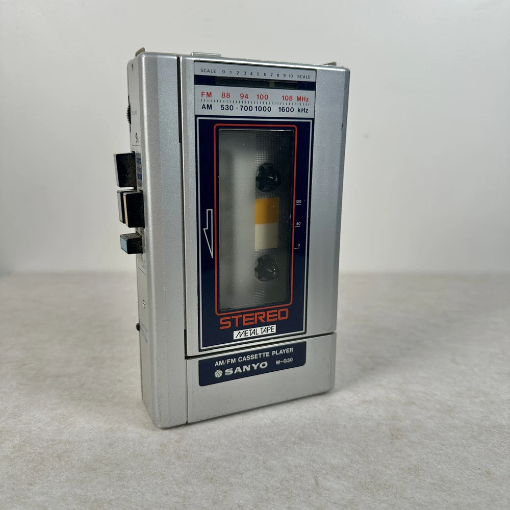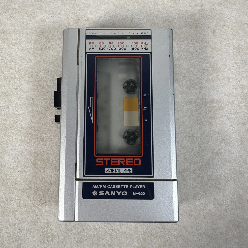 Sanyo M-G30 1980s portable vintage cassette player am/fm stereo metal tape Cosmetically in good condition, unable to test sold as is not working for parts or repair Please see photos for details