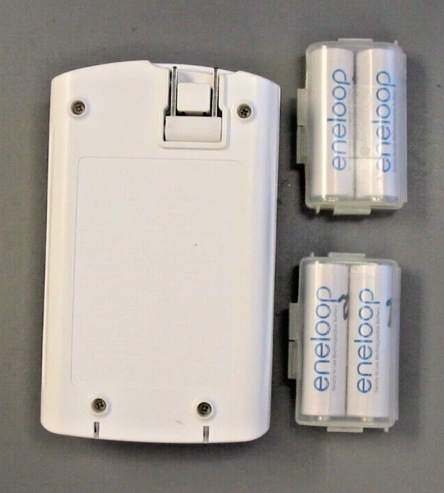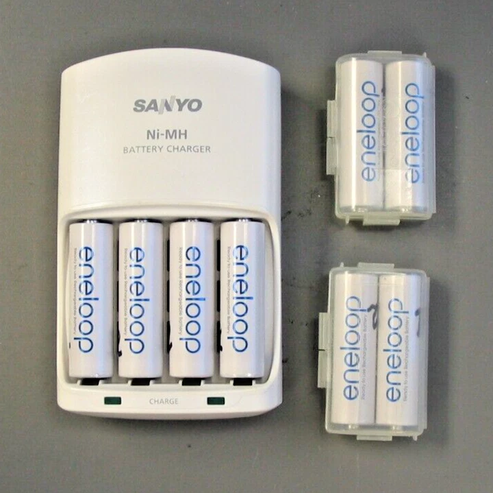 Sanyo Model NC-MQN06U Ni-MH Battery Charger for AA and AAA Batteries, PLUS 8 Eneloop HR-3UTGA (1900 mAh) AA Rechargable Batteries. Very slightly used, in excellent condition, see pictures. The Sanyo NC-MQN06U charger charges pairs of AA cells at 300 mA and pairs of AAA cells at 150 mA. Features of Eneloop batteries Eneloop technology: 6th generation high capacity NiMH batteries with superior charge retention makes Eneloop batteries ideal for virtually all situations where alkaline or lithium AA / AAA size batteries are currently used. Pre-charged and ready to use straight from the pack. Recharges up to 2100 times. You'll use hundreds of alkaline batteries just to match the overall life and performance of Eneloop batteries. Low self discharge means eneloop batteries are still ready for use even after long periods of storage - up to 65% after 5 years! Environmentally friendly - Eneloop batteries and packaging are completely recyclable. Rechargeable on most standard & fast chargers designed for NiMH batteries. Made in Panasonic Wuxi Plant.