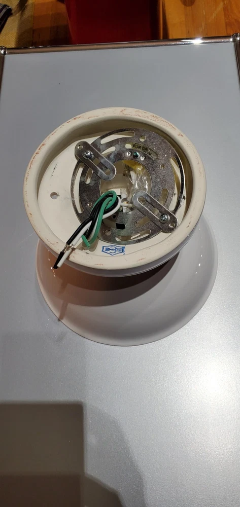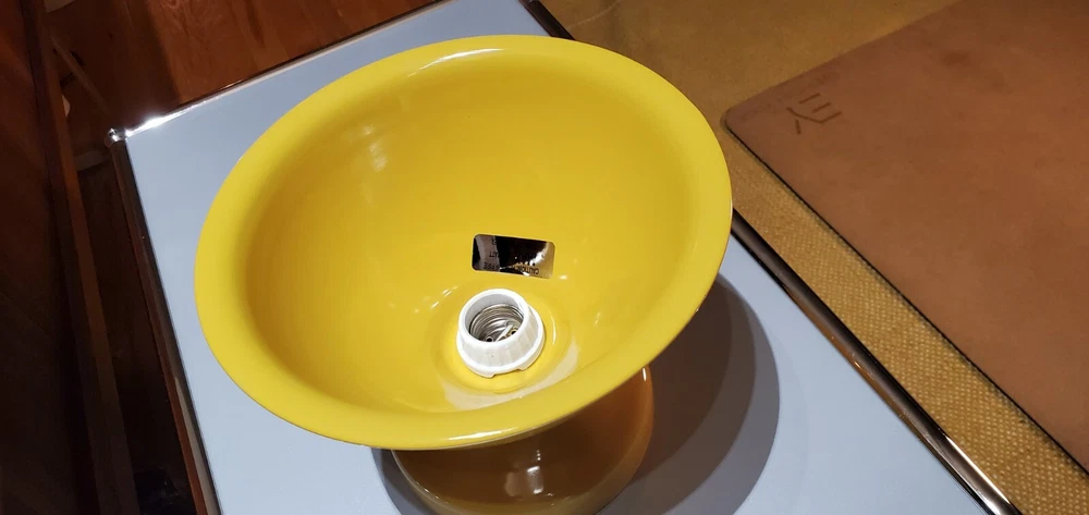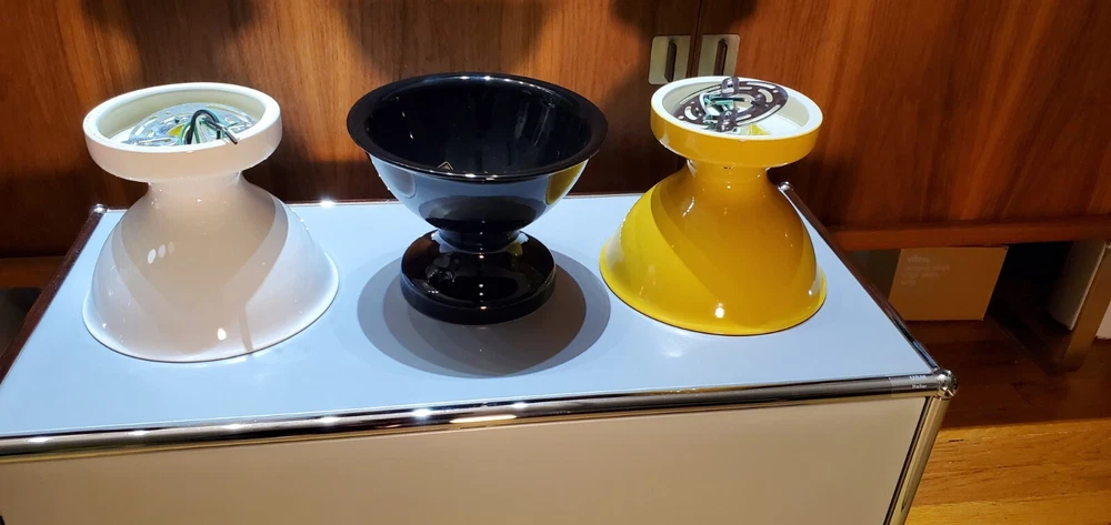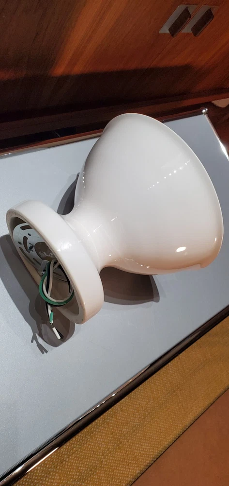 Schoolhouse Alabax Surface Mount Ceramic Light Fixtures Schoolhouse ceramic lighting fixtures available in three colors, white, black, and chamomile yellow. Expertly cast and glazed by hand. Inspired by fixtures found in General Electric industrial catalogs from the 1950s. This beautiful fixture goes well with Mid Century Modern, Industrial, Farmhouse, Ranch Style, Bauhaus, Contemporary Modern, Eames Style, and MCM. The quality is very similar to brands like flos artemide luceplan fontana arte hay menu muuto hem Stockholm lighting. These fixtures were ordered for NYC Industrial Loft project in Tribeca. The interior designer ordered too many. Brand new in box. Never mounted or installed. Complete with hardware and screws and ready to install. Max 150 watt type A lamp. Porcelain socket. Please use a licensed electrician to install. Since this is a handmade product, there will be slight range in color, glaze thickness, and overall opaqueness. Dimensions: Shade Width: 8.25" Total Height: 7" Ceiling Canopy: 5.75" Price is per lamp. Quantity 1. Please specify which color. White Quantity: 20 Fixtures Chamomile Yellow Quantity: 20 Fixtures Black Quantity: 20 Fixtures