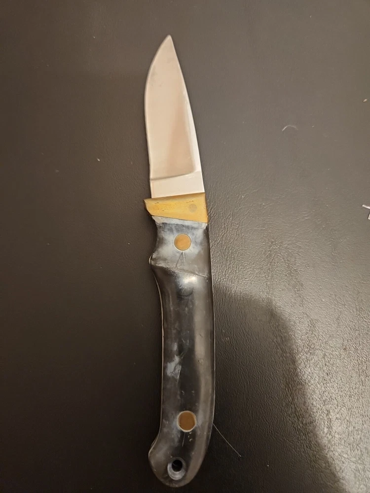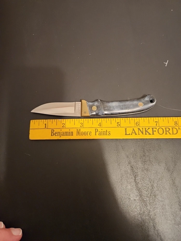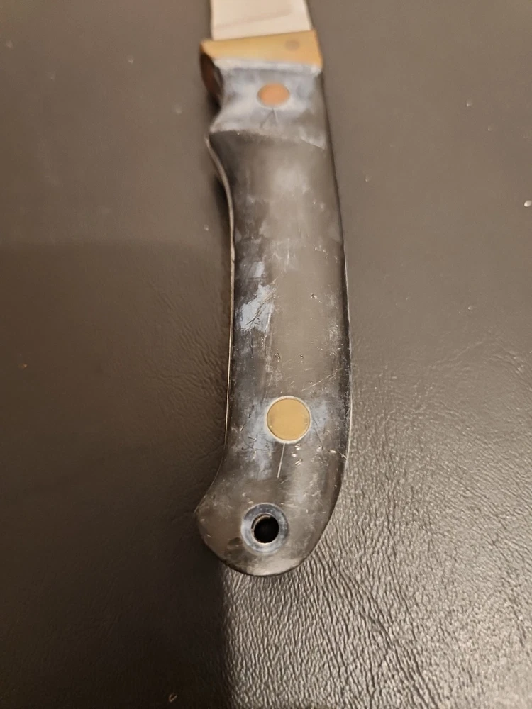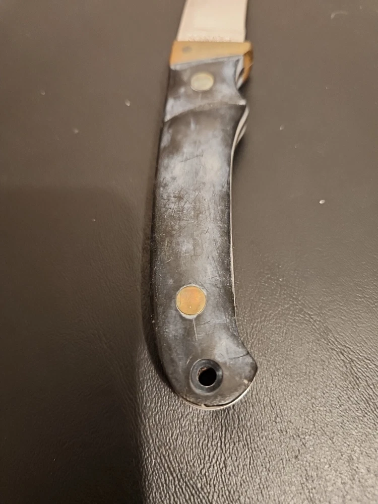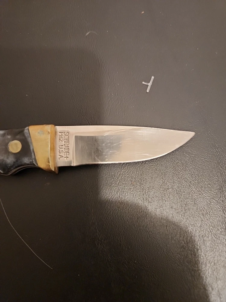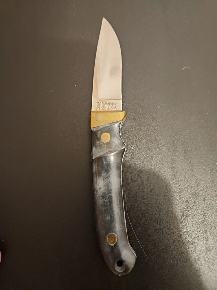 The Schrade Vintage PH2 USA knife is a 7" full tang hunting knife with a carbonized stainless blade and micarta handle. It features a drop point blade type and a blue color. This ambidextrous knife was made in the United States between the years 1972-2004 and is in excellent condition.