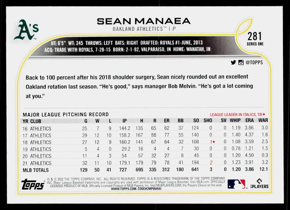 You will receive a , Sean Manaea 2022 Topps #281 Oakland Athletics Near Mint or Better condition. Please note i am not a professional card grader the condition of raw cards can be very subjective. Please refer to the high quality pictures to determine condition yourself any questions at all please feel free to ask!! we take pride in the quality of cards we sell and ship, all cards will be shipped in a penny sleeve and top loader for added protection. be sure to save us as a seller, as we are growing and listing daily THANK YOU FOR YOUR BUSINESS