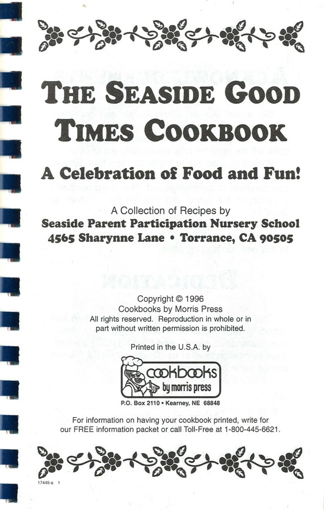 The Seaside Good Times Cookbook. A Celebration of Food and Fun! A Collection of Recipes by Seaside Parent Participation Nursery School. 107 pages Appetizers & Beverages Soups, Salads & Vegetables Main dishes & Casseroles Meat, Chicken & Seafood Breads & Rolls Pies, Pastry & Desserts Cakes, Cookies & Candy This & That Index Ships Media Mail in a stiff cardboard mailer or box with tracking US only. Your satisfaction is guaranteed, if not satisfied with any item simply return for a full refund. Return shipping paid for by buyer.