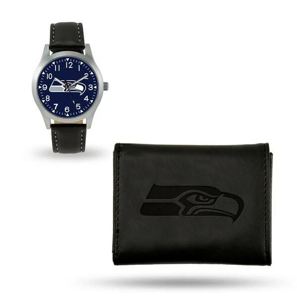 Black Watch And Wallet Gift Set is a must have for any fan. The ultimate combo set for any sports fan. A casual leather fashion watch and a faux laser engraved leather tri-fold wallet. Features Wallet: Laser engraved team logo Faux leather Logo will never fade Holds 4 credit cards 3x4 open Watch: 9.5" long Faux leather Quartz movement Silver casing Adjustable strap Water resistant (splash, washing hands)