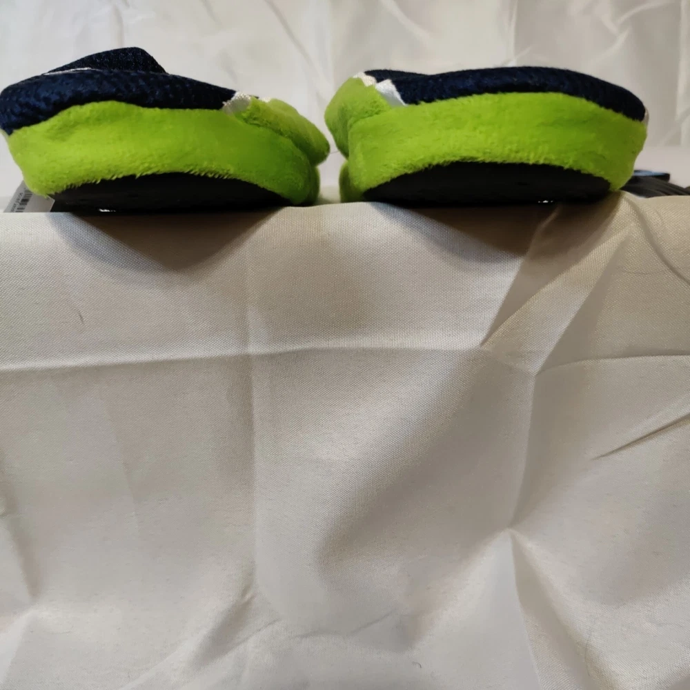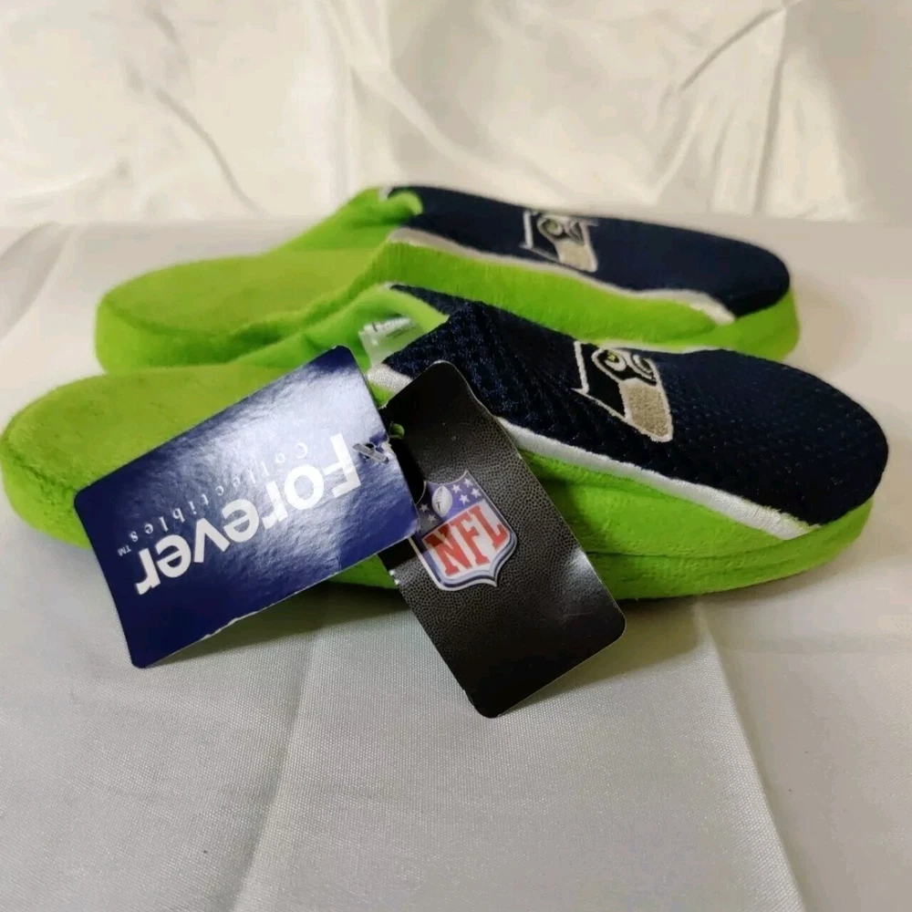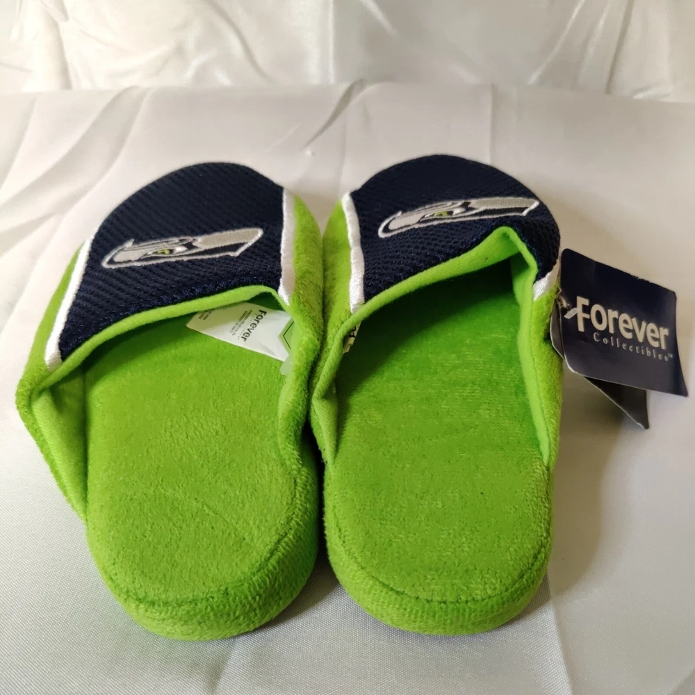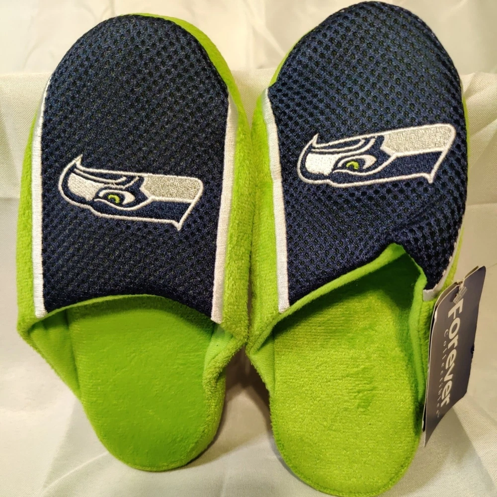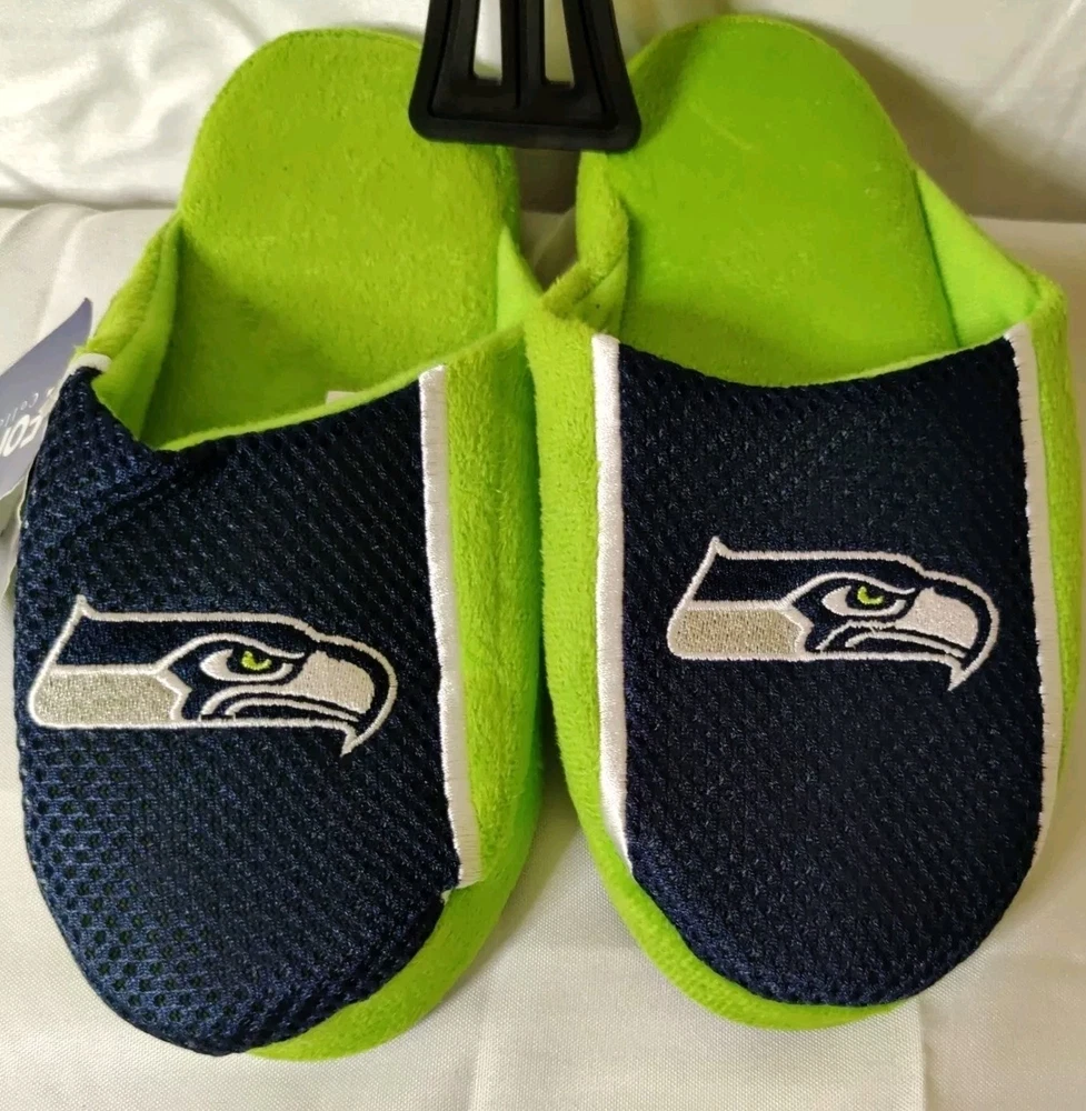 Get ready to show off your love for the Seattle Seahawks with these Foco NFL Football Youth Jersey Mesh Soft Slide Slippers. Perfect for any young fan of the National Football League (NFL), these officially licensed slippers come in team colors and feature the Seahawks logo. The slide design makes them easy to slip on and off, while the mesh material provides comfort and breathability. These Youth Jersey Mesh Slippers are ideal for wearing during the regular season or playoffs, and are available in small sizes (Youth 1-2) for both boys and girls. They are less than 8 oz in capacity, making them lightweight and perfect for indoor wear. Made by Forever Collectibles in China, they are high-quality and durable. Show off your team spirit and keep your feet cozy with these Seattle Seahawks slippers. Free Shipping