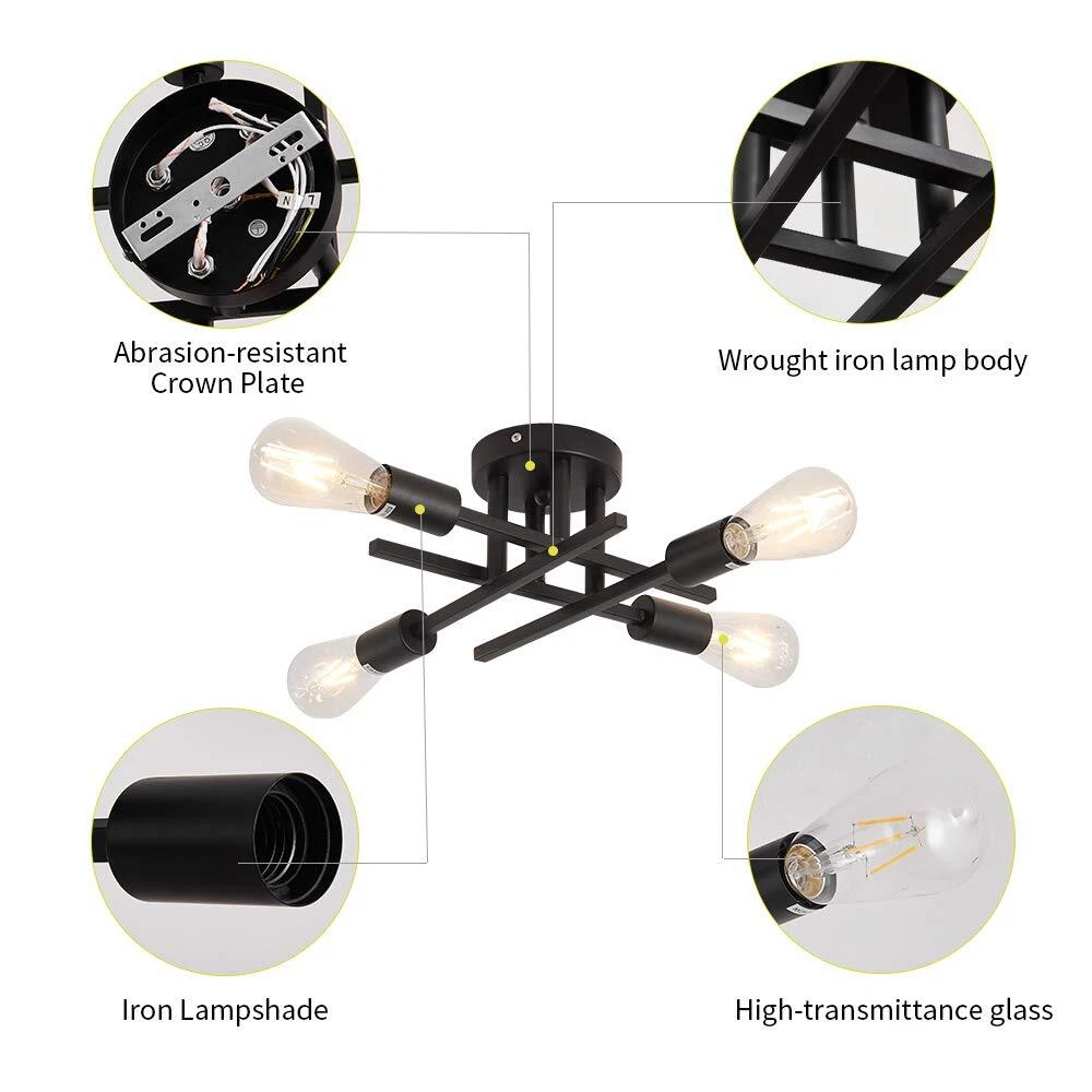 -Semi flush mount ceiling light CLOSE TO CEILING LIGHTING DESIGN --Semi flush mount chandelier light with elegant and rustic look, not only a farmhouse lighting, but also a modern beautiful decoration. Indoor ceiling fixtures flush mount design creates a comfortable and modern ambiance to your house.(Detailed installation video available) CEILING SPUTNIK LAMP SIZE --Indoor black ceiling chandelier light metal ,the top plate dia: 4.72 inch; fixture light total height: 5.51inch. wide 14.96. Base type: E26 [BULB NOT INCLUDED]. Watt: 60 watt ,Dimmable purchase dimmer and dimming bul. PENDANT LIGHT FIXTURE DECORATION --Black flush mount light will be a nice antique lighting decoration gift for house remodel, housewarming, Valentine's Day, birthday, weddings, party, holiday decoration or other special events. FLUSH MOUNT LIGHT FIXTURE APPLICATION --Farmhouse light fixture is suitable for bedroom, beauty salon, dining room, living room, study room, bathroom, bookcase, hallway, balcony, porch, gazebo, bedroom etc. After-sales : we value customer experience, if you have any questions, we will solve it for you as soon as possible!