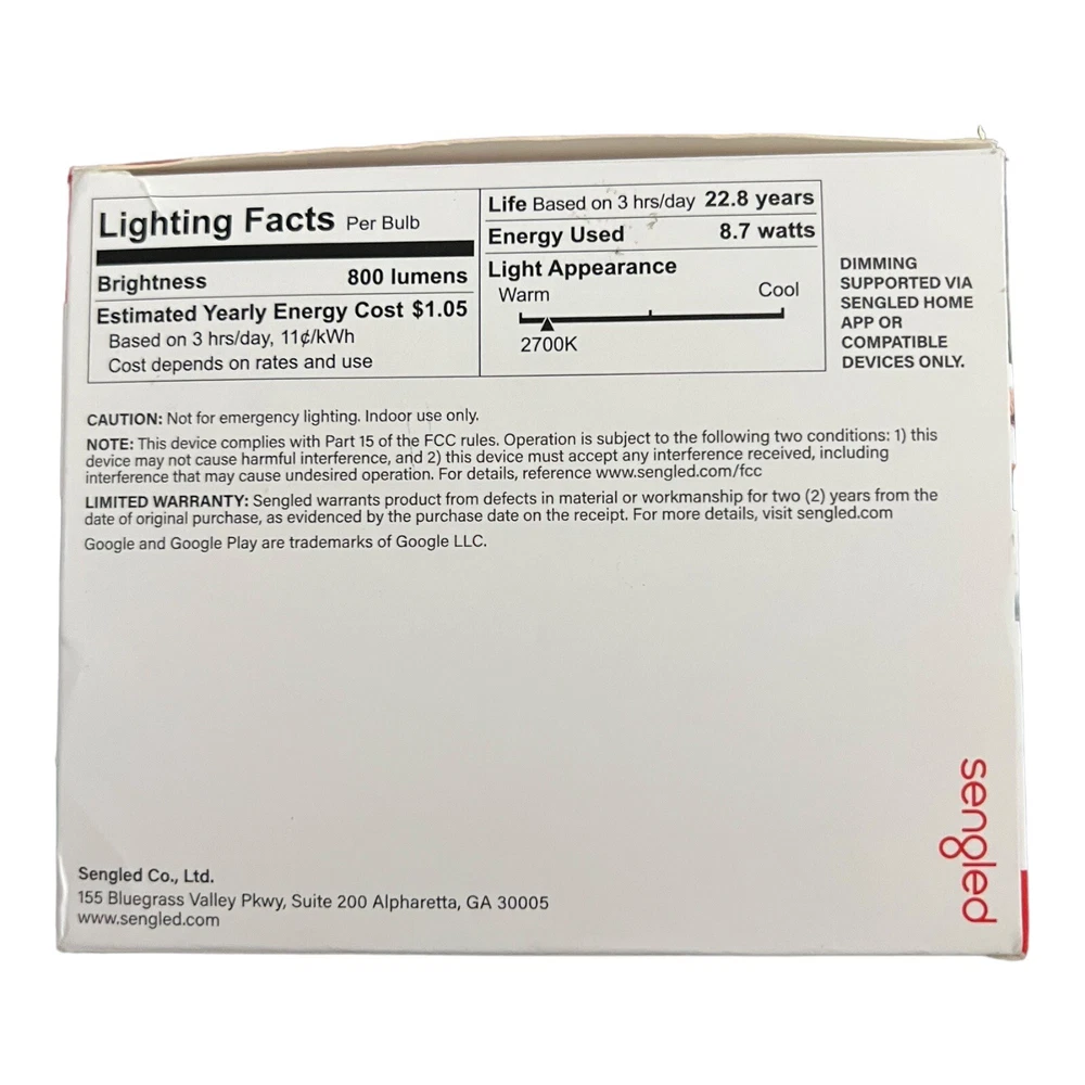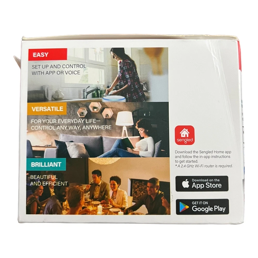 Sengled Smart Lighting Expert Classic 4xBulb - Illuminate Your Space with Smart Control Key Features: • Smart Lighting Set: Includes 4 bulbs for comprehensive smart lighting coverage • Easy Setup: Seamless integration into your smart home ecosystem • Smart Control: Manage lighting from anywhere using the Sengled app • Compatibility: Works with popular voice assistants like Amazon Alexa and Google Assistant • Energy-Efficient: Enjoy energy savings with smart lighting automation • Dimmable: Adjust brightness levels to create the perfect atmosphere • Versatile Use: Suitable for various lighting fixtures and applications • Reliable Brand: Sengled is a trusted name in smart lighting solutions Product Description: Transform your space with the Sengled Smart Lighting Expert Classic 4xBulb set. This comprehensive smart lighting solution includes 4 bulbs, providing complete coverage for your home or office. Seamlessly integrate these bulbs into your smart home ecosystem with easy setup, allowing you to control and manage your lighting from anywhere using the Sengled app. Enjoy the convenience of smart control with compatibility with popular voice assistants like Amazon Alexa and Google Assistant. Experience energy savings and efficiency with smart lighting automation, and adjust brightness levels to create the perfect atmosphere for any occasion with the dimmable feature. Suitable for various lighting fixtures and applications, the Sengled Smart Lighting Expert Classic 4xBulb set is a versatile addition to your smart home. Additional Information: • Number of Bulbs: 4 • Smart Connectivity: Works with Sengled app, Amazon Alexa, Google Assistant • Installation: Easy and seamless integration • Energy Efficiency: Yes • Dimmable: Yes • Versatility: Suitable for various lighting fixtures • Brand: Sengled