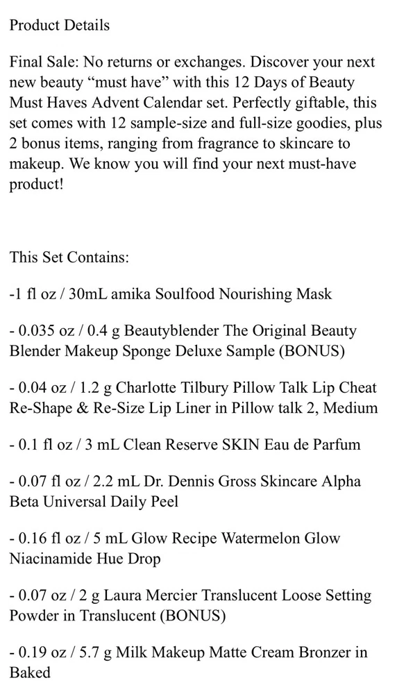 Department:WomenColor:MulticolorSet Includes:Beauty ProductsNumber of Items:13Year Manufactured:2023gtin13:Does not applyTheme:HolidayRETURN NOTES - MUST READ BEFORE PURCHASE:Final Sale: No returns. No International ReturnsCountry/Region of Manufacture:United StatesOccasion:ChristmasFilling:CosmeticsSize:SmallType:Drawer Advent CalendarUPC:Does not applyBrand:SephoraShape:Rectangle