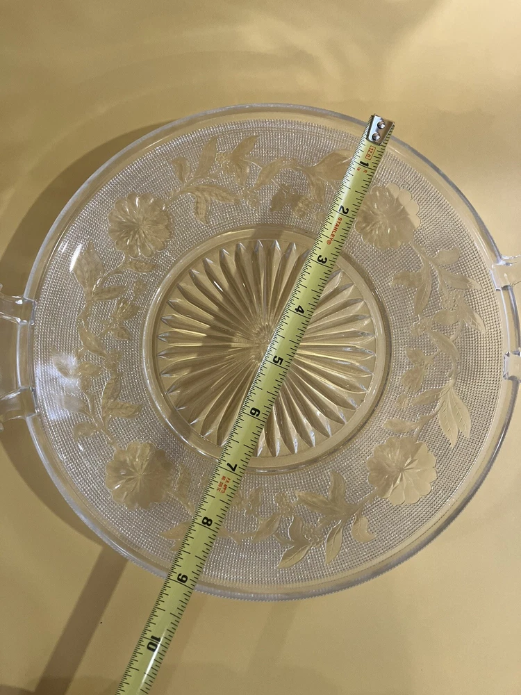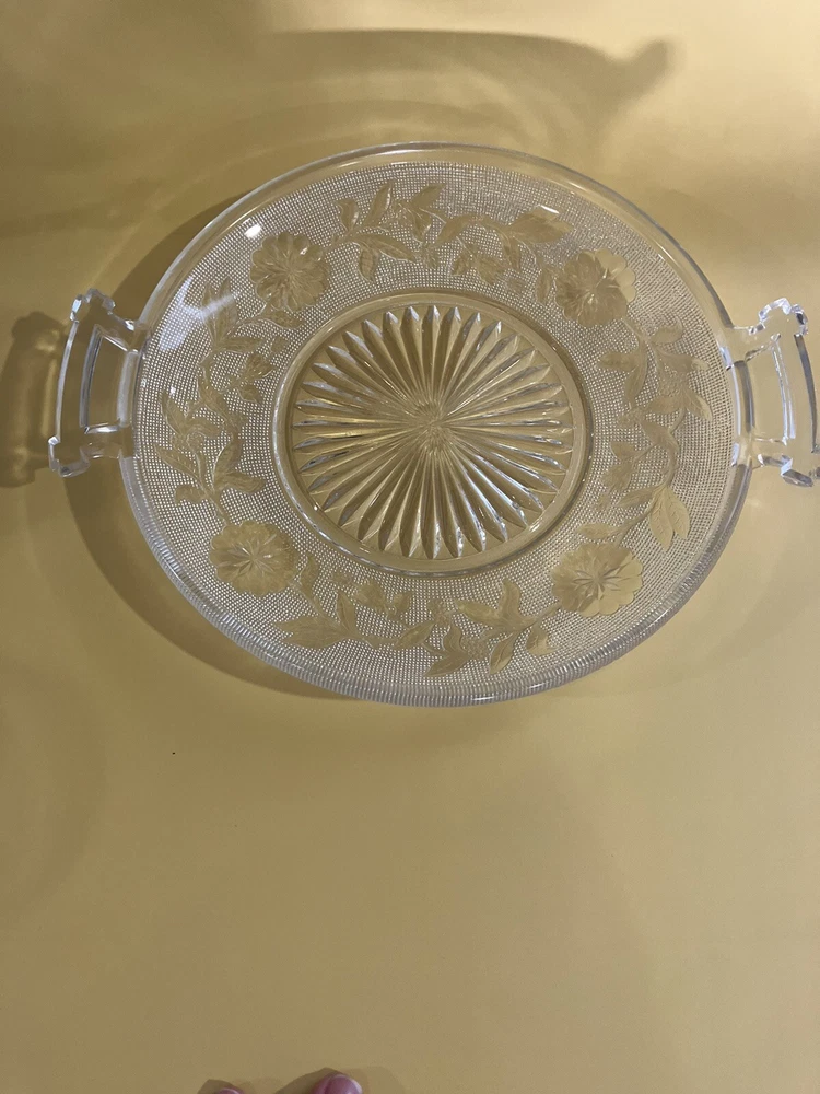 Serving Dish 9 inch Clear Glass Etched Flowers 2 Handles. Condition is Used. Shipped with USPS Ground Advantage.