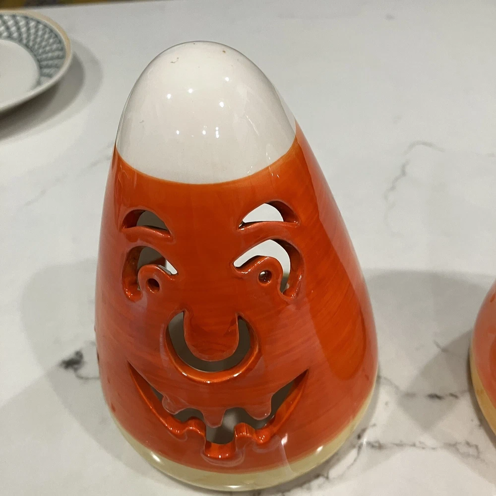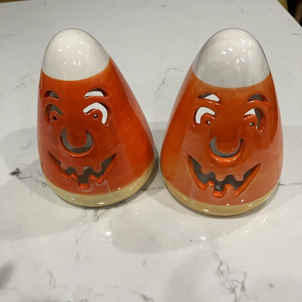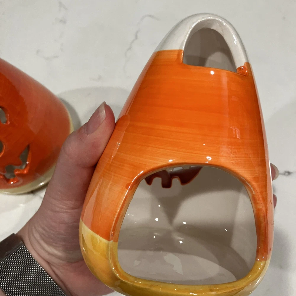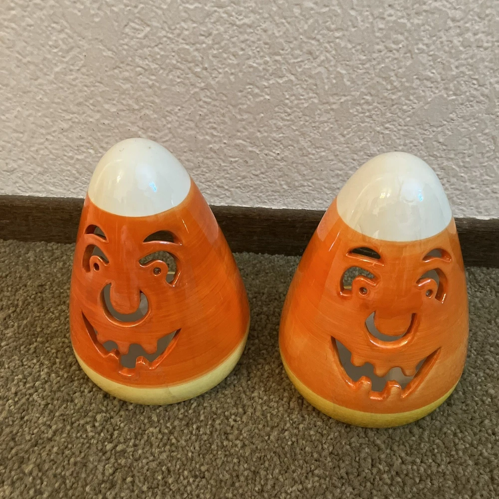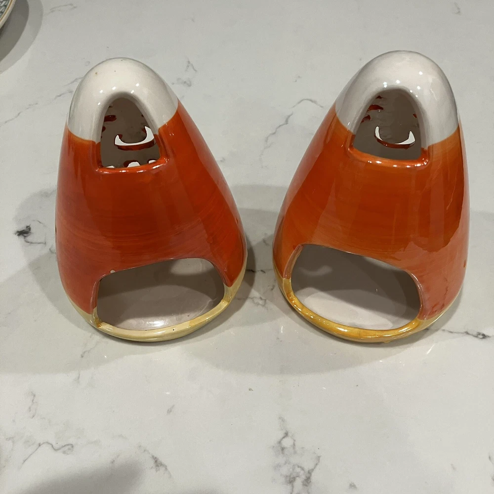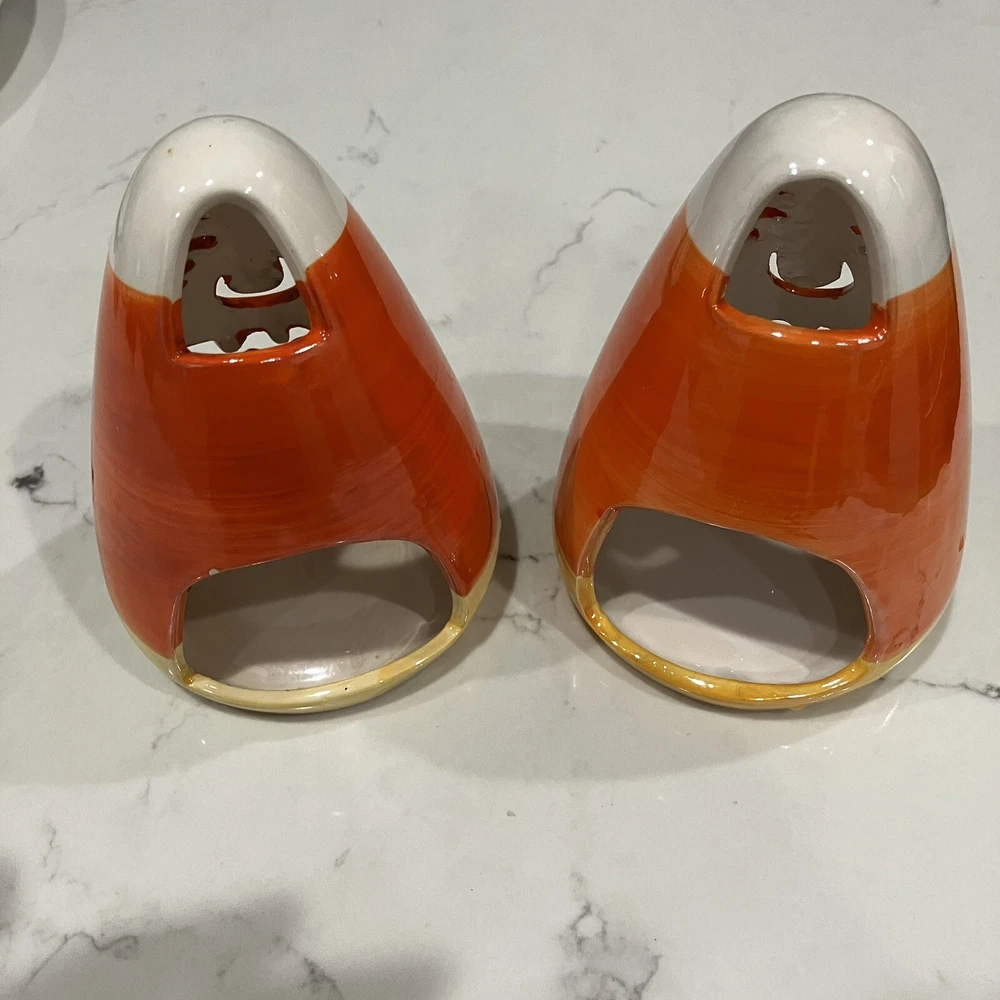 Add some spooky ambiance to your Halloween decor with this set of two candy corn Jack-O-Latern tea light holders. Perfect for creating a cozy atmosphere at your Halloween party or as a spooky addition to your home decor. These ceramic candle holders are designed with a Halloween theme and subject, making them a great addition to any collection. Whether you're a collector or just looking for some unique decorations, these candy corn Jack-O-Latern tea light holders are sure to impress. Some minor signs of use. Please see pictures. Very small paint chip on the back of one of the candle holders. Overall in great condition