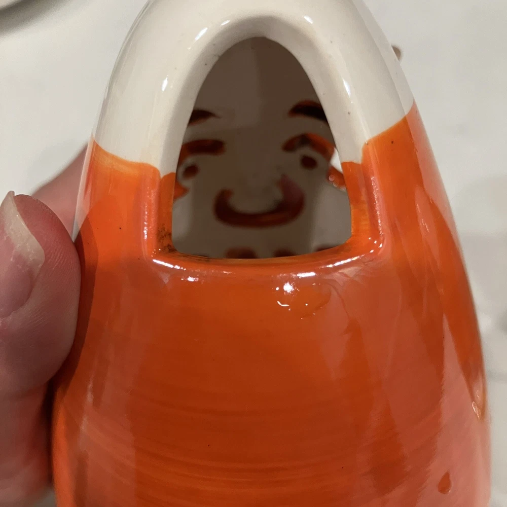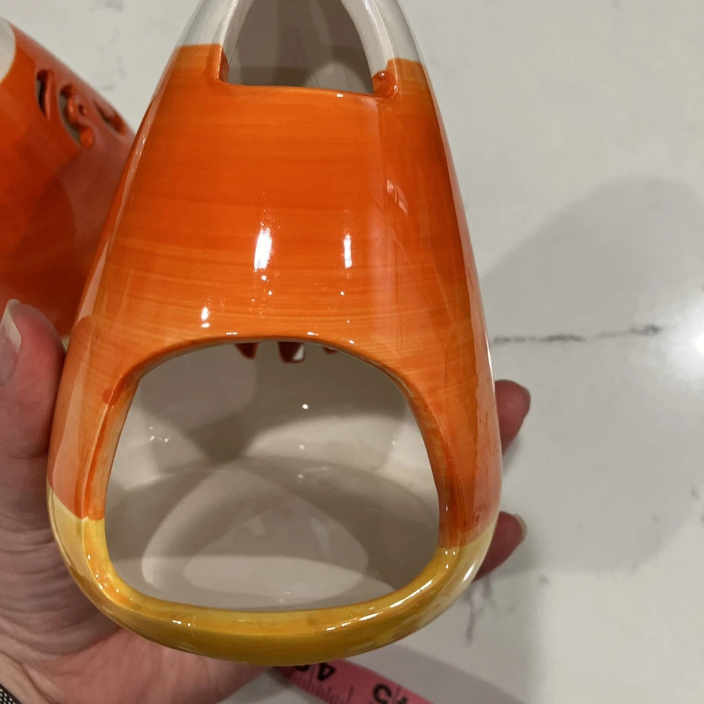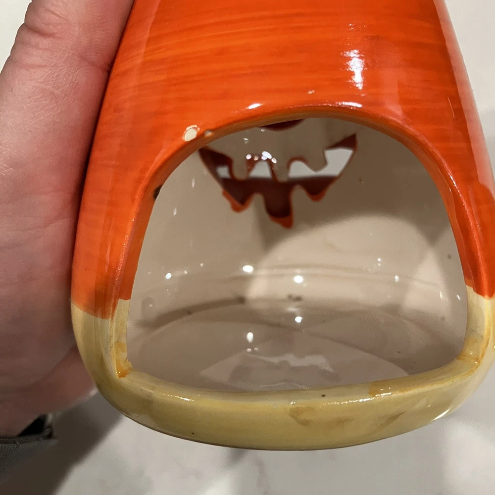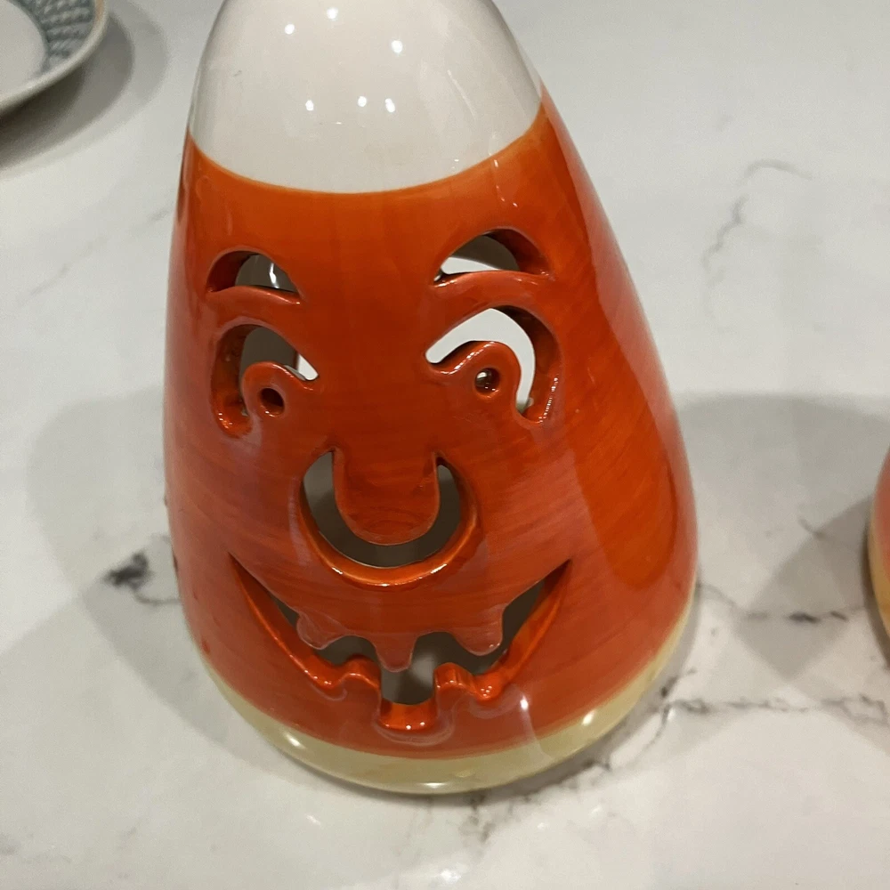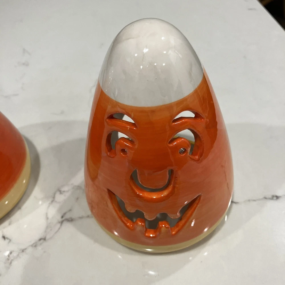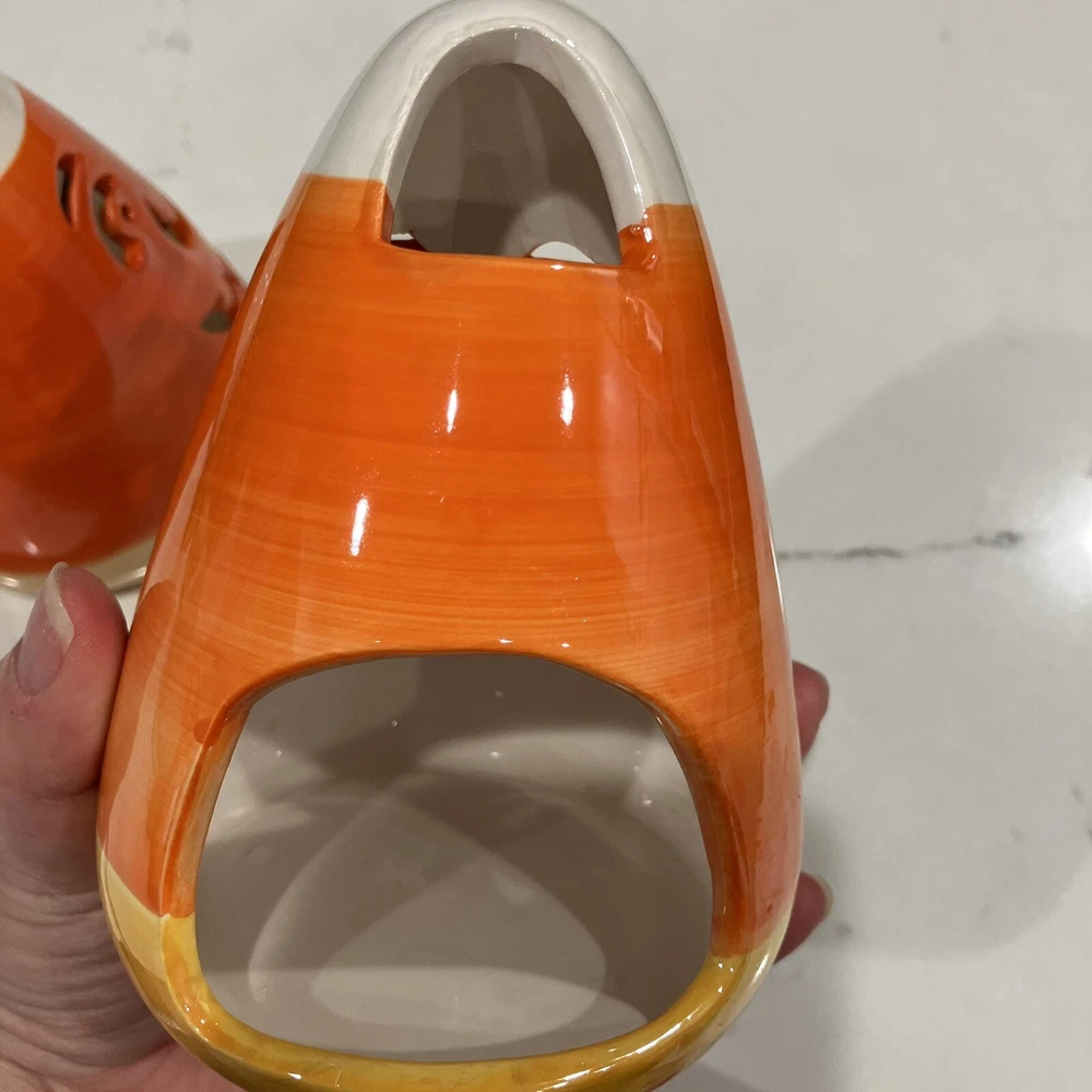 Add some spooky ambiance to your Halloween decor with this set of two candy corn Jack-O-Latern tea light holders. Perfect for creating a cozy atmosphere at your Halloween party or as a spooky addition to your home decor. These ceramic candle holders are designed with a Halloween theme and subject, making them a great addition to any collection. Whether you're a collector or just looking for some unique decorations, these candy corn Jack-O-Latern tea light holders are sure to impress. Some minor signs of use. Please see pictures. Very small paint chip on the back of one of the candle holders. Overall in great condition