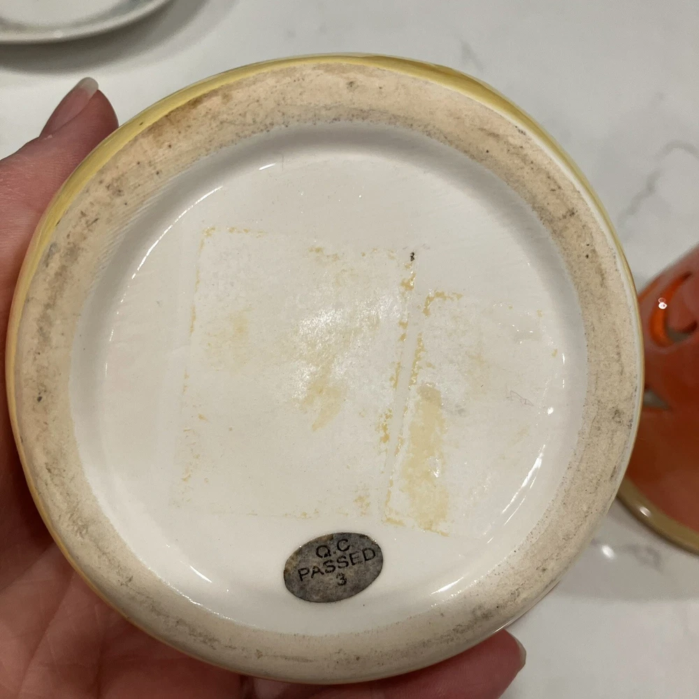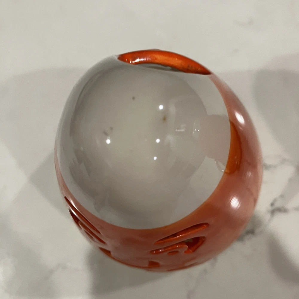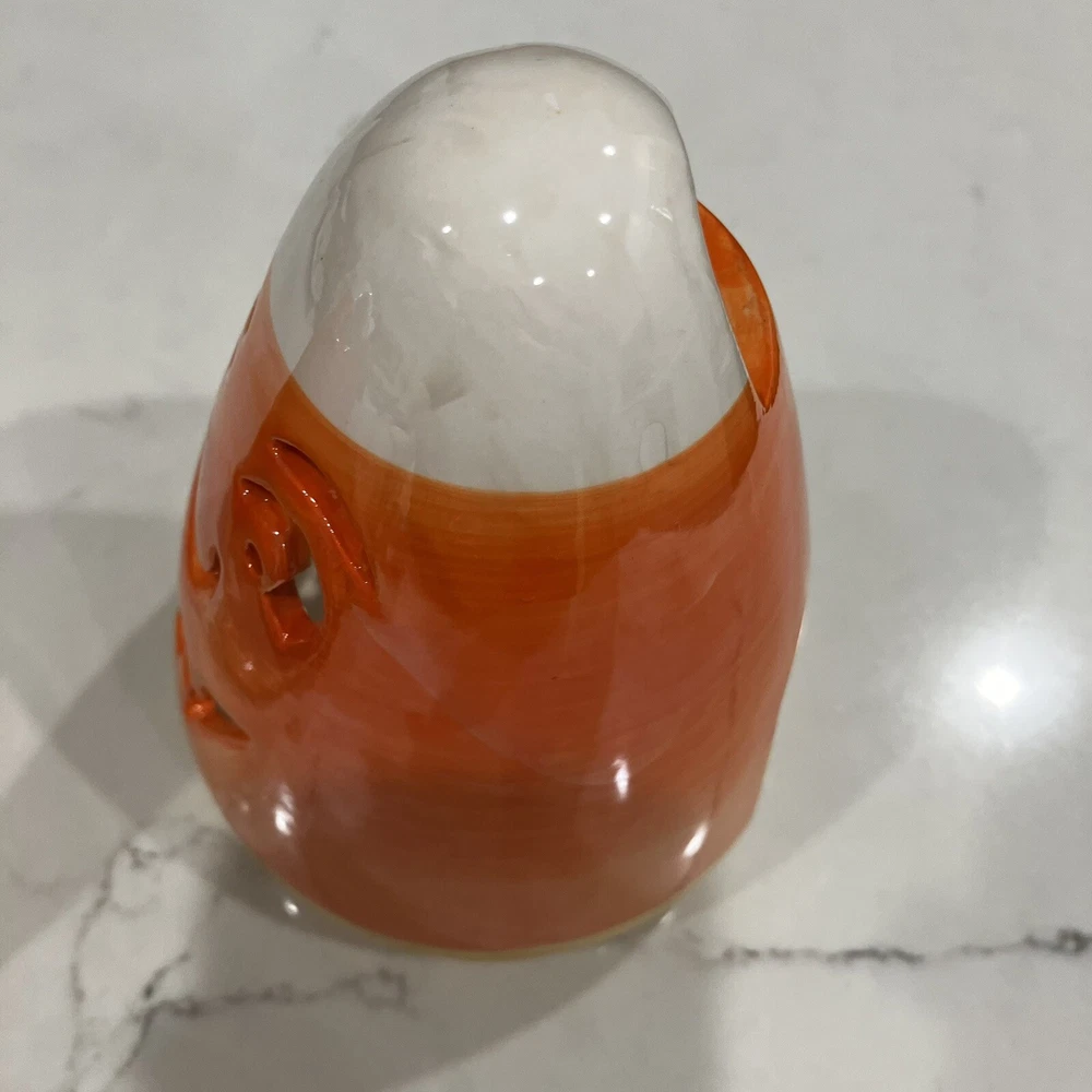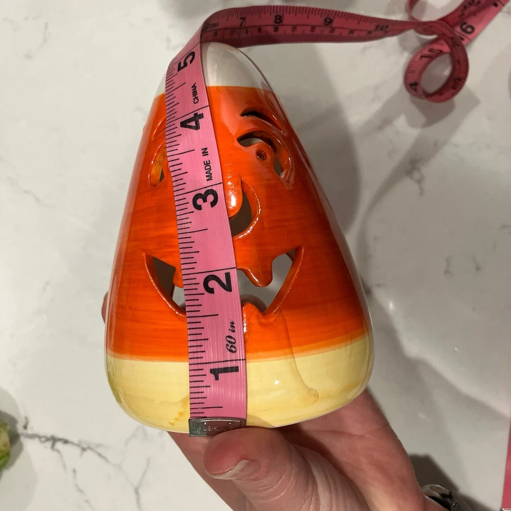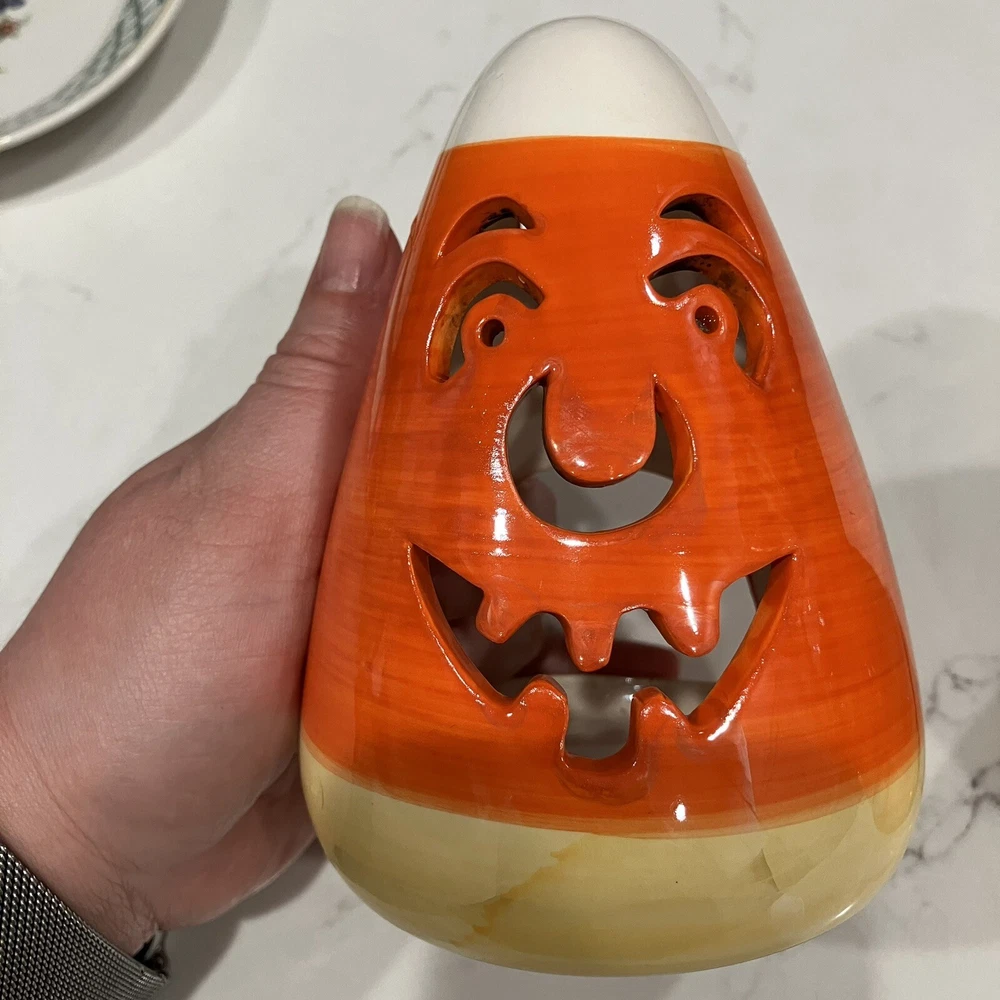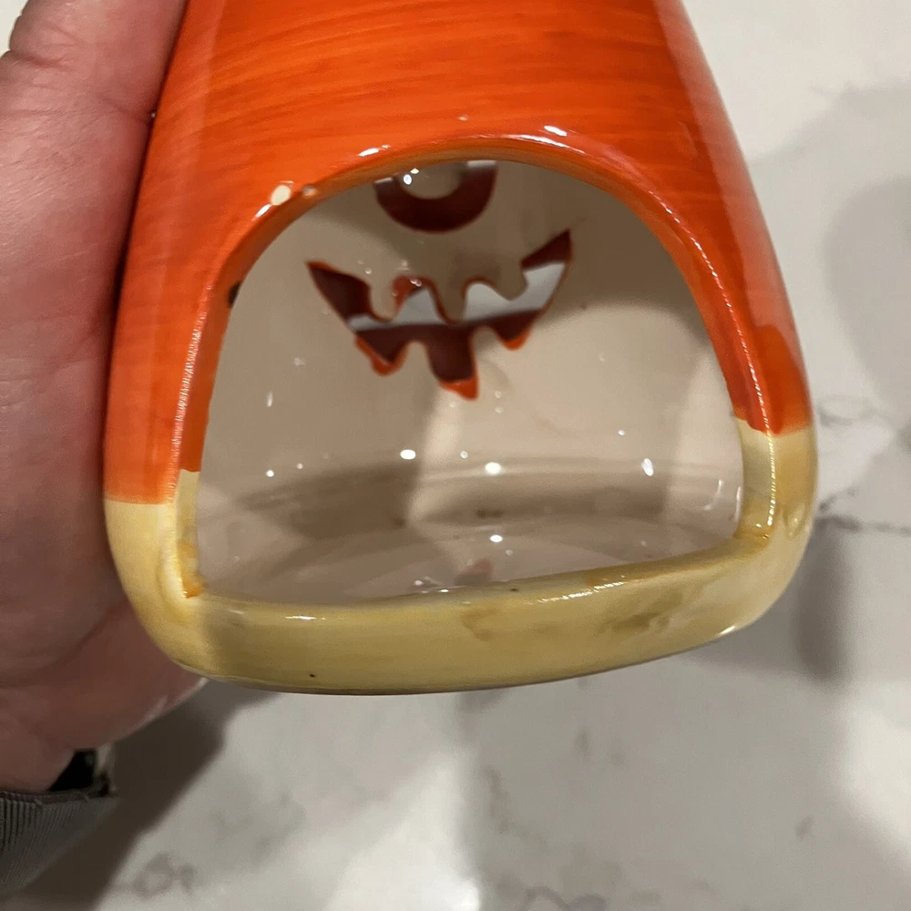 Add some spooky ambiance to your Halloween decor with this set of two candy corn Jack-O-Latern tea light holders. Perfect for creating a cozy atmosphere at your Halloween party or as a spooky addition to your home decor. These ceramic candle holders are designed with a Halloween theme and subject, making them a great addition to any collection. Whether you're a collector or just looking for some unique decorations, these candy corn Jack-O-Latern tea light holders are sure to impress. Some minor signs of use. Please see pictures. Very small paint chip on the back of one of the candle holders. Overall in great condition